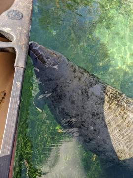 It took us about half an hour to paddle to the springs where manatees notoriously gathered. We spotted our first few manatees as we were making our way to the Three Sisters Springs. When we got to the popular spot we were able to float and observe them as they made their way into the protected sanctuary area where the warmest water was. We then tied the canoe up and donned snorkeling gear. I imagine it was comical watching me squish into a shorty wetsuit while balanced on a piece of coral! Scott’s sister Tiffany generously loaned me her snorkel gear and I enjoyed being able to get up close and personal with these docile sea mammoths. They are as large a horse but much more graceful and it was incredible to be so close to them- they would swim within inches of us and didn’t seem to be frightened by our presence- one even swam up to our canoe and booped it with his sweet sea creature nose!