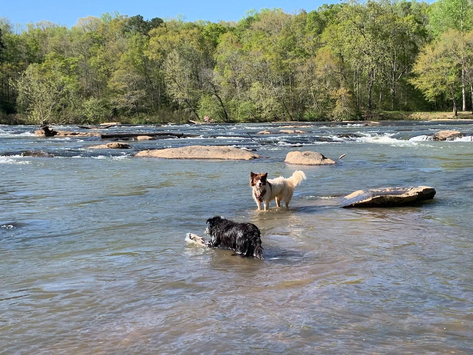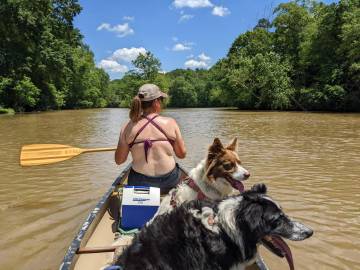 The Saluda river is right in between my apartment and Scott’s house so we took advantage of its proximity and enjoyed a few canoe trips to “Ant Island” with the dogs and a few trips down it on tubes. The dogs have turned into excellent canoe passengers and get excited about paddling with us. Ollie likes to bite at the water coming off the oars and Andi likes to stalk things from the comfort and safety of her vessel. It can be squirrely when they both decide to move around the canoe at the same time but the more often we take them out, the better they are getting at being still and sometimes will even lie down. Andi’s confidence level swimming has increased since we got her a doggy life vest. Although she still needs some coaxing, she is now more comfortable swimming back and forth between Scott and I. She enjoys investigating the little island and Ollie loves standing in the water, smacking, splashing, and barking at it.