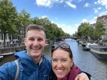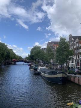 Having consumed the frites, we then wandered around the city. We explored many of the side streets and then made our way to the canals. We were amazed by the sheer amount of bicycles that we encountered- it seemed that the bike traffic may have outnumbered the foot traffic and you had to keep your head on a swivel to avoid veering into the path of speeding bikes hurtling at you. The episode of Ted Lasso that depicts a team trip to Amsterdam captures this chaos perfectly when Rebecca ends up in a canal dodging bikes! The bridges over each of the canals were decorated with flowers in pretty planters and were adorned with even more bicycles- those that were not currently being ridden around the city. We enjoyed seeing all of the different flavors and styles of houseboats docked along the canals and sat for a bit and watched the boat traffic inside the canals- its own little highway.