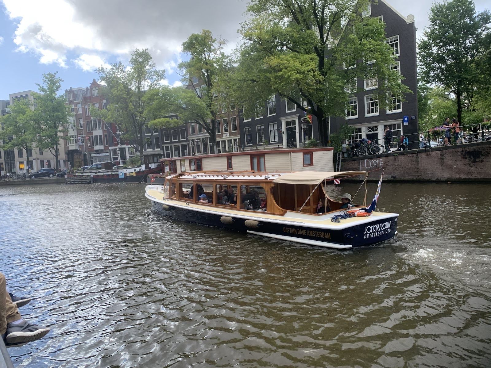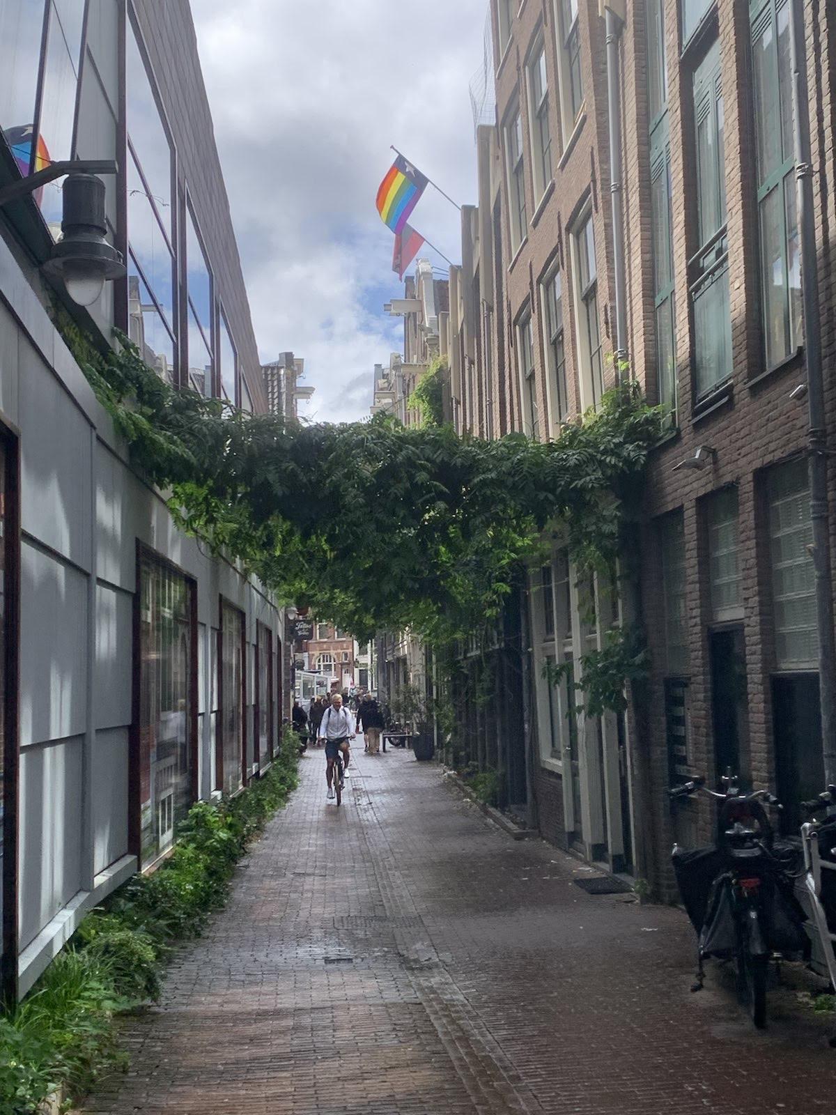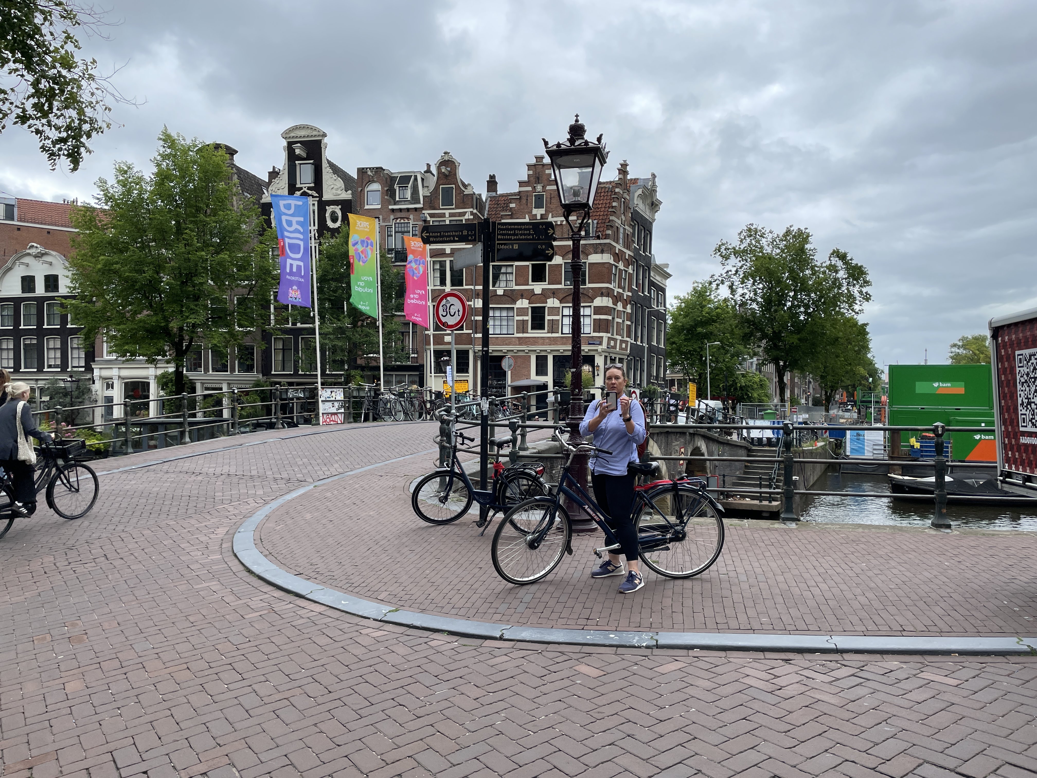 Having consumed the frites, we then wandered around the city. We explored many of the side streets and then made our way to the canals. We were amazed by the sheer amount of bicycles that we encountered- it seemed that the bike traffic may have outnumbered the foot traffic and you had to keep your head on a swivel to avoid veering into the path of speeding bikes hurtling at you. The episode of Ted Lasso that depicts a team trip to Amsterdam captures this chaos perfectly when Rebecca ends up in a canal dodging bikes! The bridges over each of the canals were decorated with flowers in pretty planters and were adorned with even more bicycles- those that were not currently being ridden around the city. We enjoyed seeing all of the different flavors and styles of houseboats docked along the canals and sat for a bit and watched the boat traffic inside the canals- its own little highway.