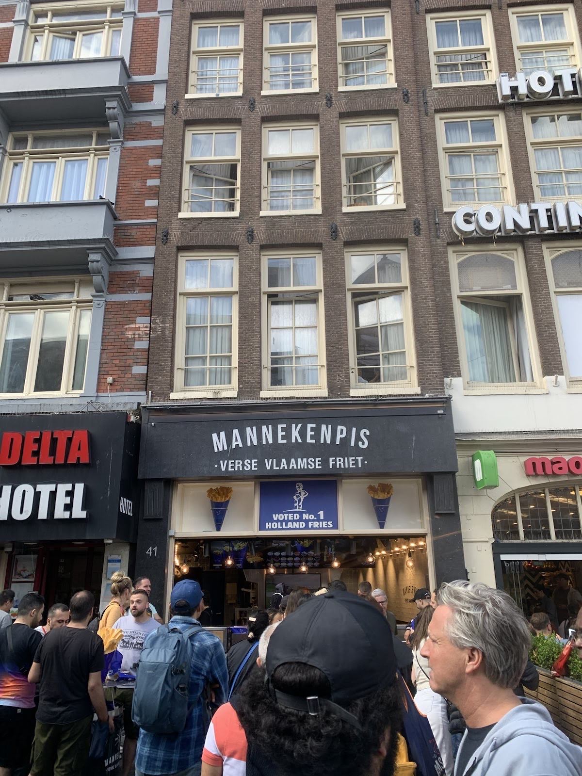 We took a quick shower (careful not to bend over to wash our feet, lest we pop the shower door open with our behinds, and instead very carefully lifted our feet up to our hands in a yoga-like sort of fashion to wash them instead) then a quick nap to get refreshed and be able to go out and tackle Amsterdam. Feeling somewhat rejuvenated and human again, we left our hotel room- the first order of business was to go get some frites (aka french fries).