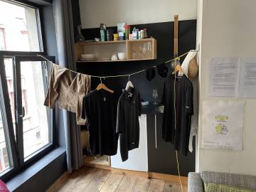 Scott was excited to check out his shower laundry experiment as soon as we got back to the apartment. Leading up to the trip he had researched what sort of laundry detergent was the best option for travel and settled on a bar of Fels-Naptha laundry soap. Determined to pack as light as possible (I was lucky to get him to bring a wedding appropriate outfit and also thankfully talked him into bringing his gym shoes rather than just walking around Europe in his dress shoes that he was bringing for the wedding) he figured that he needed the ability to do some laundry. The night before he went into the shower fully clothed, Fels-Naptha in hand, and proceeded to scrub-a-dub-dub the clothes he was wearing. He then strung the length of paracord that he had packed for a drying line up in the apartment and hung the clothes on it, hoping that they would dry in a somewhat timely manner. He was happy to see that the socks and shirts were dry and that just his pants needed more time. (This then sparked a whole quest-for-the-perfect-travel-tee event when we returned home.)