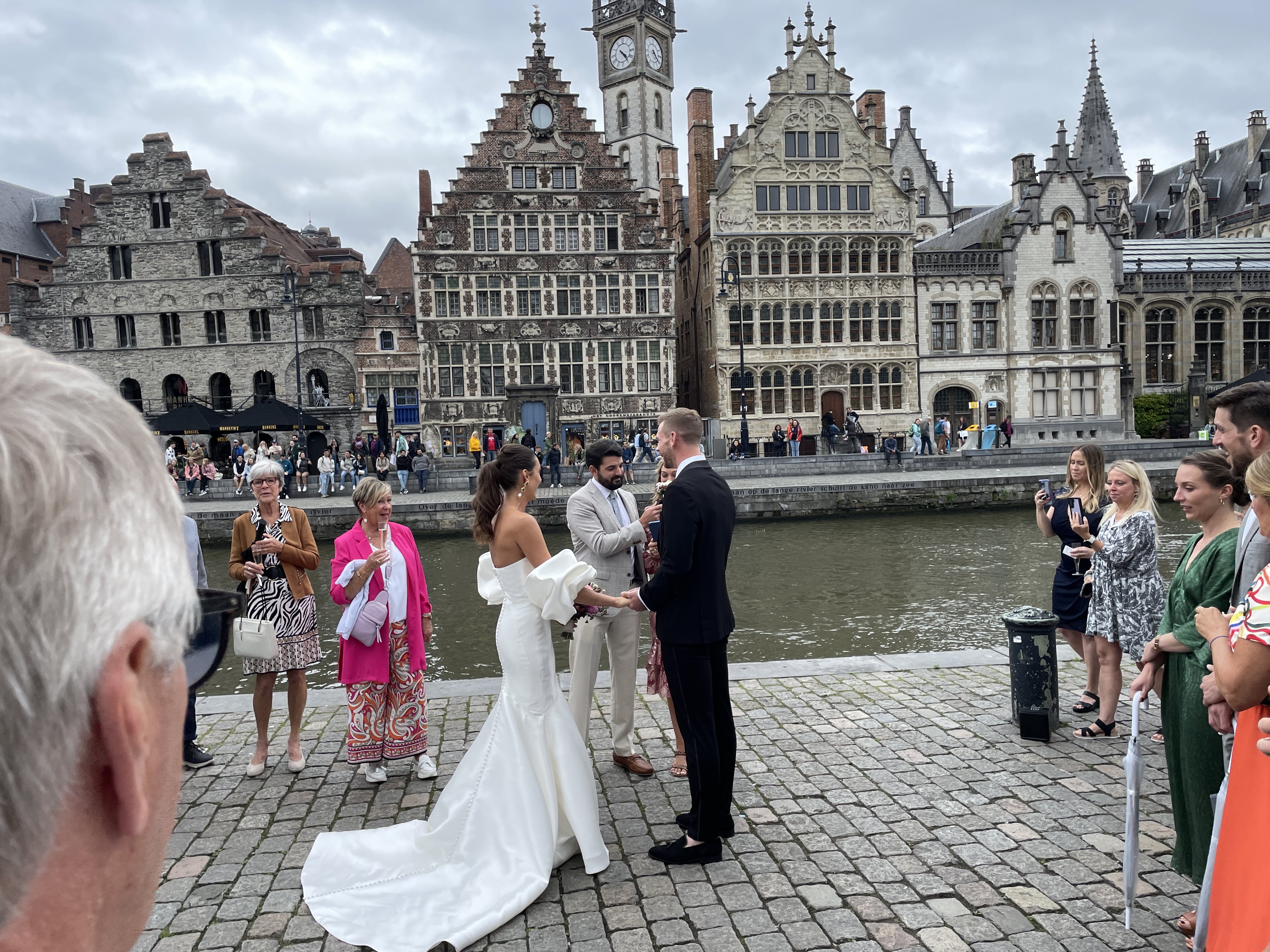 Freshly showered, performing anti-rain dances, and ready to celebrate the union of Sara and Joey, we took a short walk over to one of the picturesque canals outside the Marriot where they would be getting married. The walk in heels on the cobblestones was dicey and I had to constantly rein Scott in and remind him to slow down and wait for me. We made it without issues and the weather was polite and the rain held off.