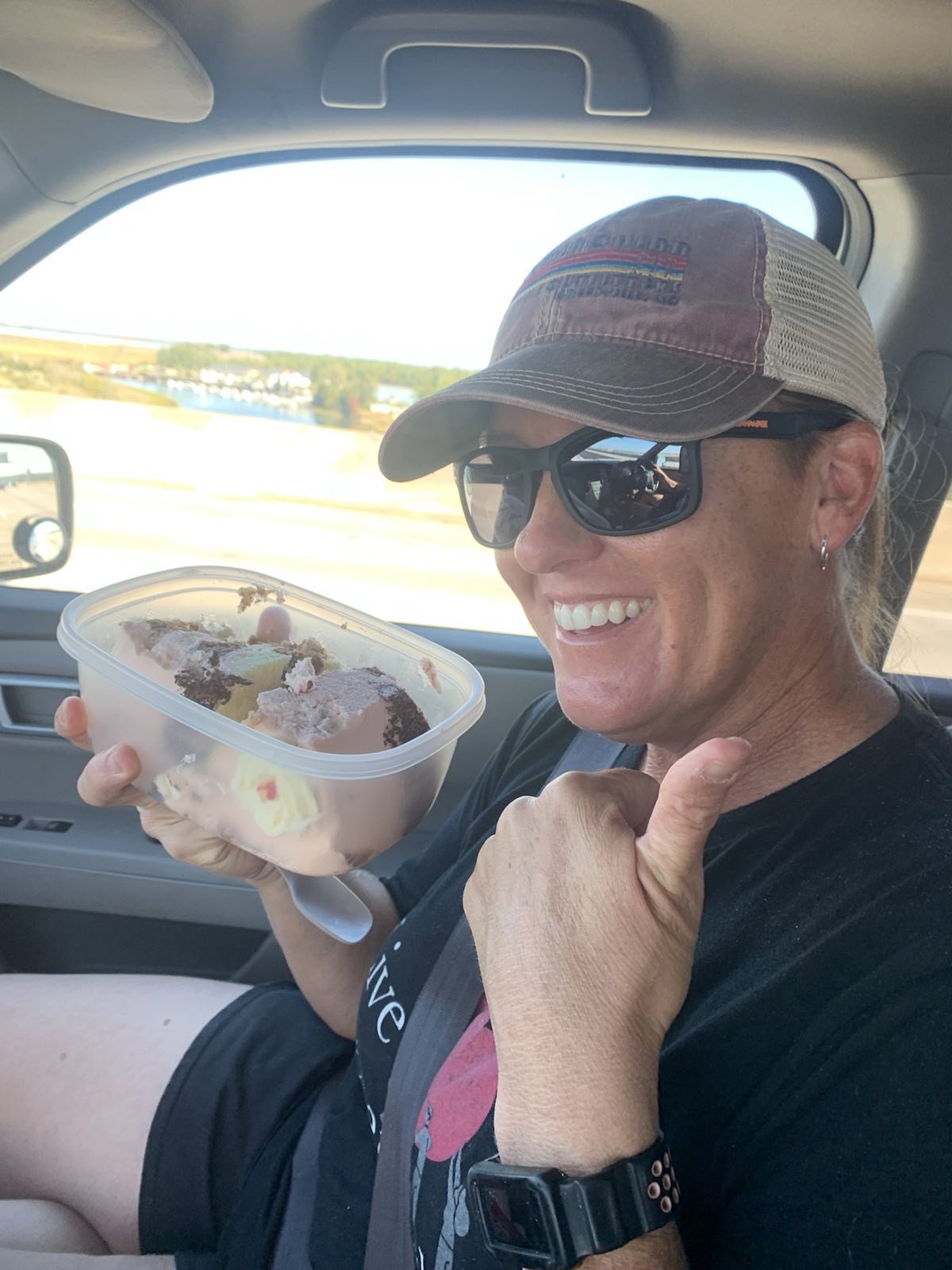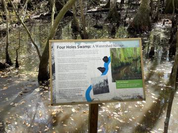 On our way back to the visitor’s center an employee appeared on the boardwalk about 50 yards in front of us and very calmly but firmly announced for us to stop because there was a water moccasin somewhere between us and him. We didn’t have to be told twice and stopped in our tracks, heads on a swivel. Snake stick in hand, the employee inched forward along the boardwalk in search of the snake. What he found (about 10 yards in front of us) was a nonvenomous, shy, and very common, brown water snake. A visitor that had passed by her previously had made the common mistake of misidentifying her. He invited us up to her and pointed out the features that often get them confused with water moccasins (a long mouth which enables them to grip onto fish gives them more of a triangular head which people mistake for a venomous snake as well as their shorter and wider body). She seemed nonplussed by our impromptu nature class and lay politely coiled so we could learn about her. The employee decided she was fine where she was and didn’t need to be shooed off the boardwalk since the center was about to close for the day. We headed back to the car and plugged in Becky’s address into the GPS.