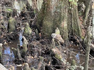 On the way down to Charleston and Becky’s we stopped to visit Beidler Forest, an 18,000 acre nature preserve owned by the Audubon Society. I had always wanted to see it but had never gotten the chance. We spent about 2 hours walking along the boardwalk that passes over top of the old-growth cypress-tupelo swamp forest and enjoyed learning about this unique ecosystem and looking for the birds and animals that inhabit it. We had been lent binoculars at the visitor’s center and were thankful to have them because it let us zoom in on a sun basking alligator in a pond. Immediately after we saw the alligator a barred owl landed just a few feet away from us, its lunch, some sort of rodent, in its talons. It was seemingly unphased by us and chowed down on its meal right next to us before flying off to a nearby tree to rest and digest. Its wingspan was impressive!