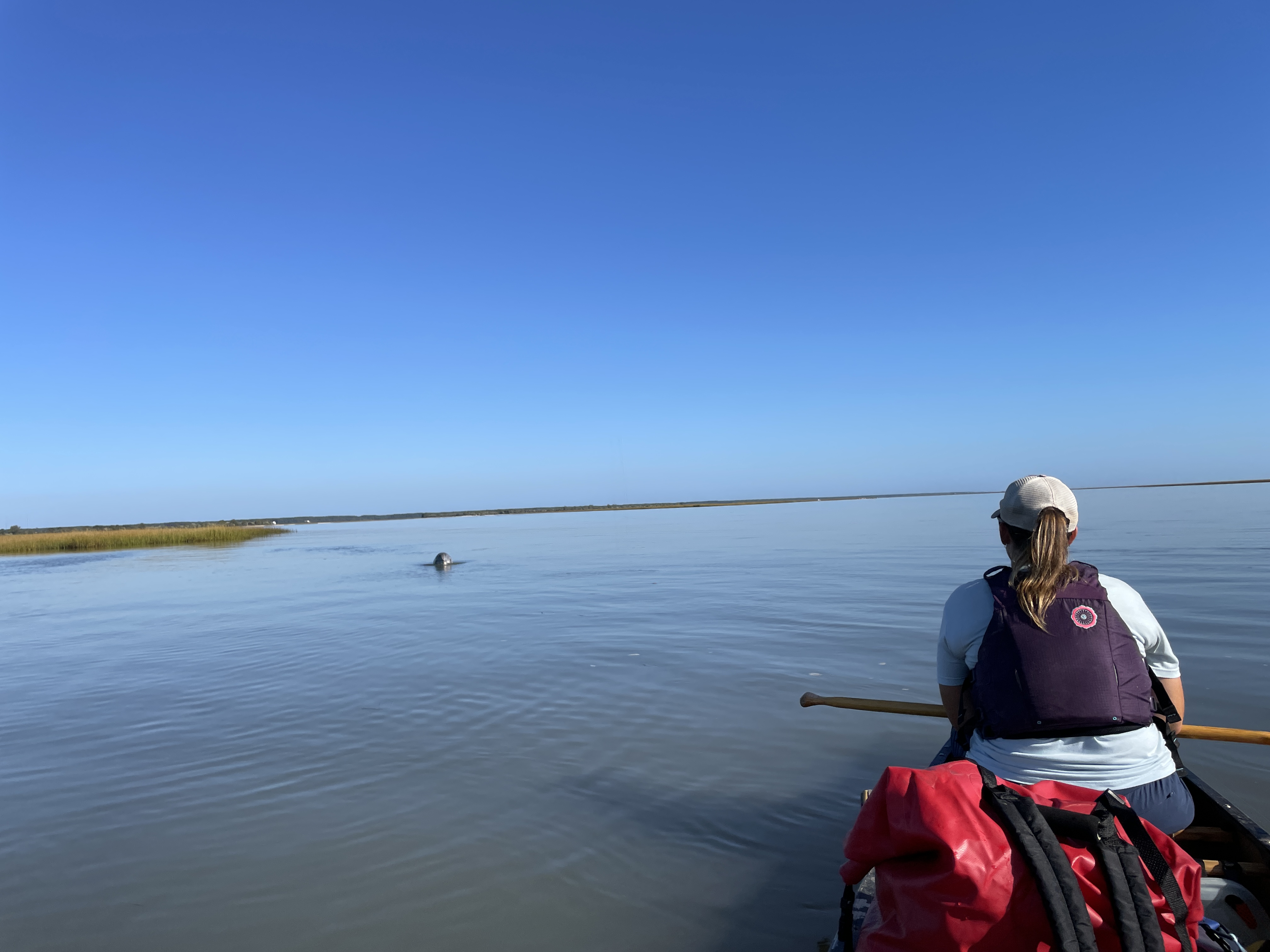 We got into our somewhat free of water boats and started the paddle back to Mount Pleasant. Joey had pointed out a red roof on the shoreline the day before that would be a helpful beacon and we used it to guide us through the maze of marshes and tidal creeks. Just a little ways into our paddle we were treated to another dolphin show, this time it appeared that an entire pod was nearby from the looks of it. We stopped for a bit to watch them, just as mesmerized as we had been yesterday.