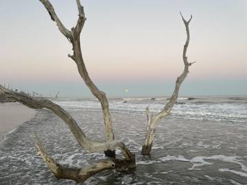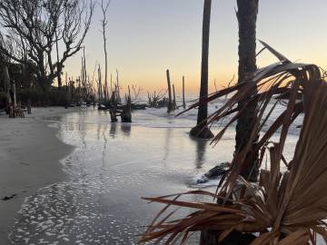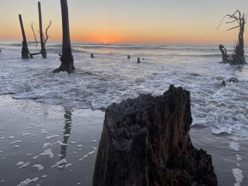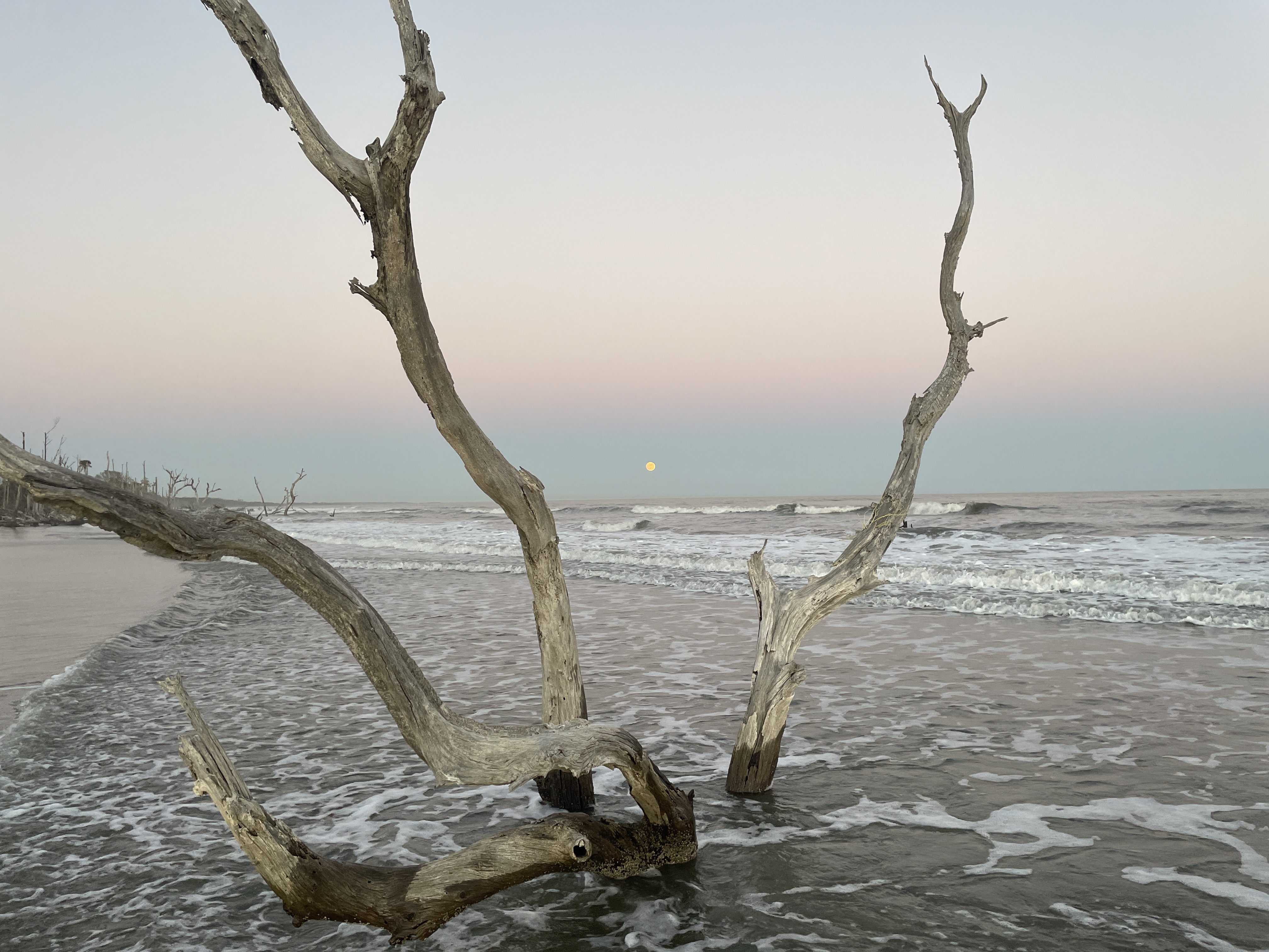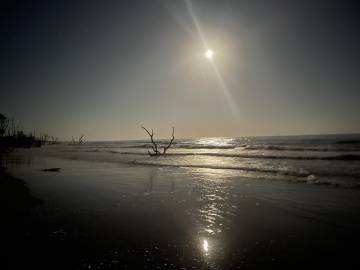We had been advised by some campers already on the island to avoid the wooded area because the mosquitos were worse there because of the vegetation. Scott and I picked an area that was above the high tide line and not too close to the woods and Joey found some trees a little outside the woods to hang his camping hammock. We did a quick camp setup and then went to check out the “boneyard” beach which is an area of the island where the shore has been eroded away by the tides, winds, and hurricanes and have left dead trees on the shore. Some are still rooted and are in varying degrees of uprightness, and some are driftwood. At high tide the waves crash dramatically into the trees. The overall effect at either tide is a little eerie and looks like an abstract art exhibit.