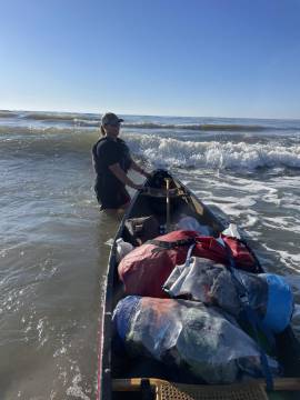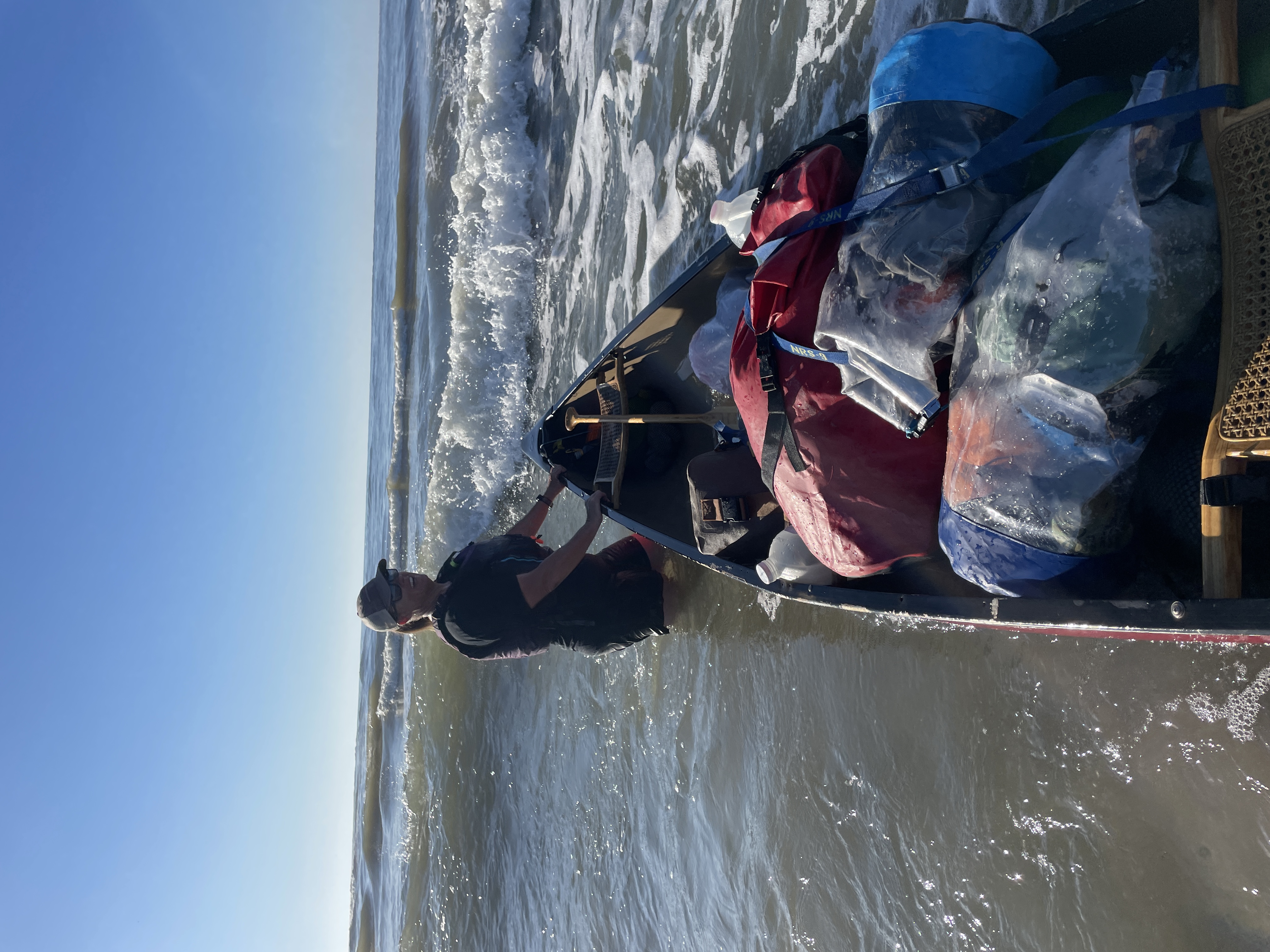 Everything was covered in sand and the mosquitos were still out in full force which made packing less than enjoyable but we got it done. We decided to hand walk our boats to the end of the island to avoid the breakers that were assaulting us as best we could which was still quite the task. The waves were determined to knock us off our feet and swamp our canoe and Joey didn’t have that much of an easier time. When we got around the corner of the island to the calmer channel, we beached the boats to bail them out. Thankfully both Joey and Scott had good bilge pumps and we were able to get enough water out to make them usable again. As we were pumping out the boats we spotted a bald eagle on a telephone pole near us, seemingly gazing down on us and watching what we were doing. A few minutes later another one flew by it and they vocalized to each other. (They don’t sound like TV and the movies make them sound like- they are much more high pitched and whistley. Fun fact- usually the sound you hear them making on TV, commercials, or movies is actually a red-tailed hawk call dubbed over their own calls.)