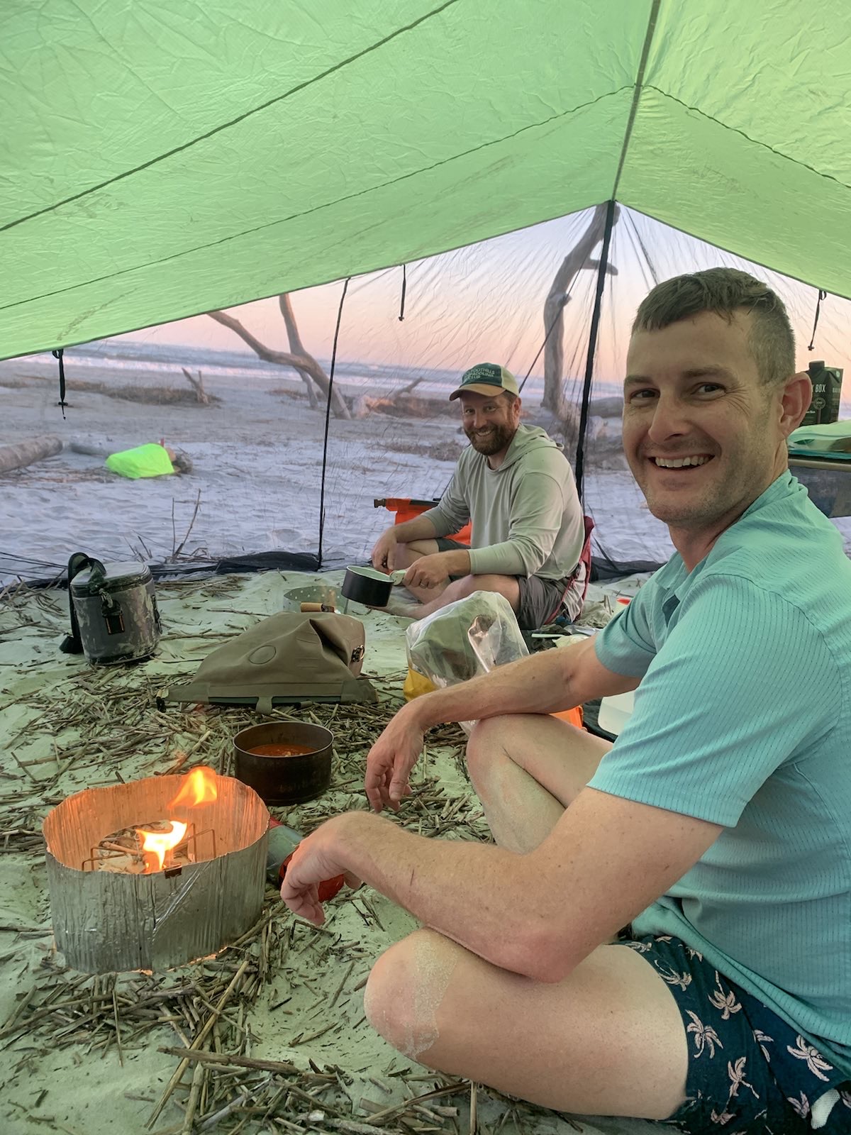 We relaxed for the rest of the afternoon, entertaining ourselves with hammocking, dips in the ocean, and strolls down the beach. The mosquitos that we had been warned of appeared about 5 pm and Scott and Joey set up the Nemo Bugout tent that Scott had brought to give us respite from the little vampires who were relentless in their pursuit of our blood. From our safe haven we were able to make our dinners and still enjoy the beach and waves. We made a little campfire outside the tent which in theory helped deter the mosquitos, but in reality I don’t think they were discouraged one bit. Despite the mosquitos we were still able to enjoy the sunset and the changing colors over the ocean and island as the sun retreated were beautiful. After the sunset, we retired to our tents and hammocks, tired but satisfied after a fun day.