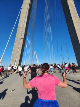 Sunday morning we said our goodbyes and Scott and I went to check out Isle of Palms. As we drove over the bridge it was fun to revel in our accomplishment from the day before and despite a very tired and sore body I was elated with how I had run and how I felt while doing it. It was nice taking a leisurely barefoot walk on the cool wet sand and seeing the Bridge in the distance. We were treated to a dolphin show and hung out and watched them feeding for a few minutes before heading back to the car. We drove through Sullivan’s Island to check it out and then went to Shem Creek for an early lunch, stopping at a restaurant we enjoy, Red’s Ice House. Full, tired, a little sore, but very content, we drove back home to Greenville, already thinking about the 2025 Bridge Run.