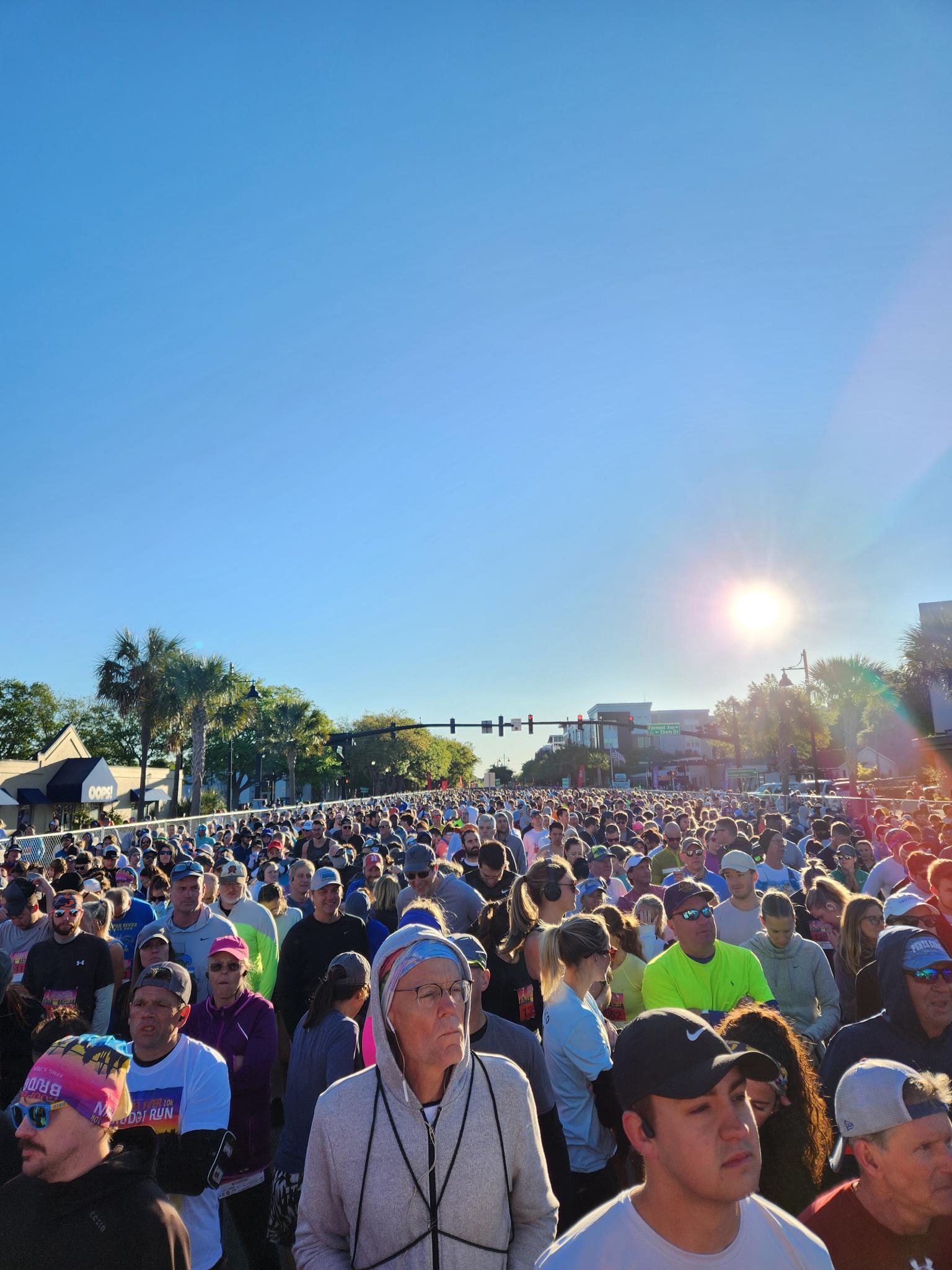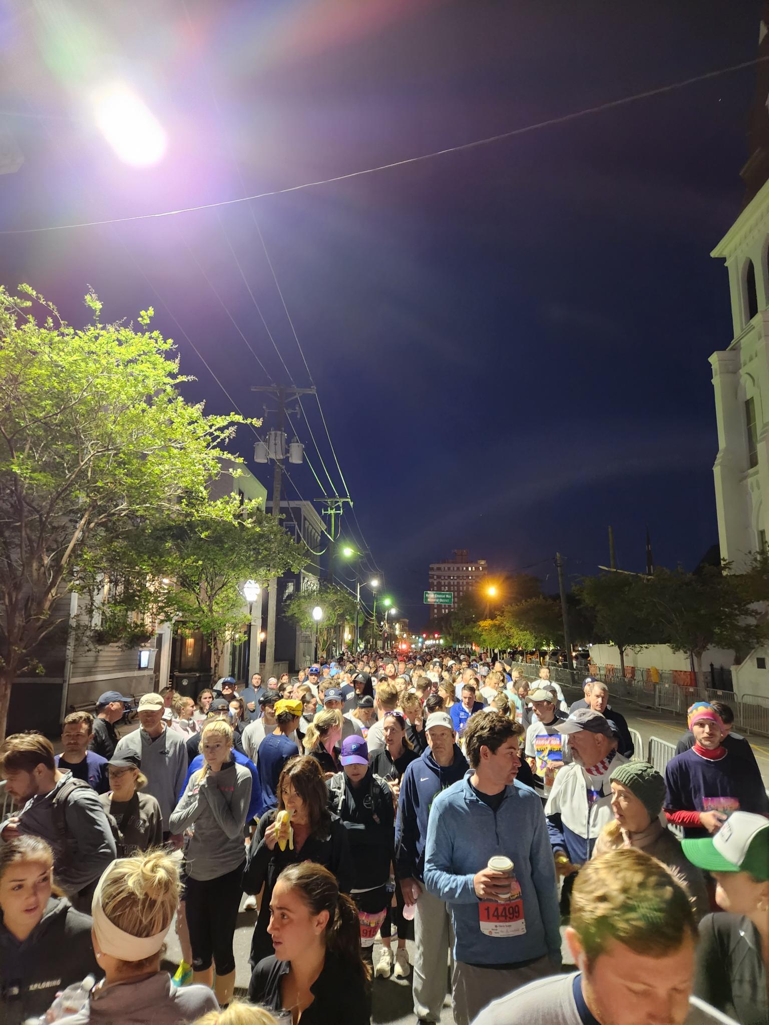 We arrived in Mt P with just enough time to walk past all the holding corrals and up to view the start (we were assigned corral D based on our estimated completion time and the corrals stretch nearly a mile and went all the way back to K I believe) and for one last potty stop where the lines for the banks of porta potties were purported via one of my Facebook running groups to be less crowded than the ones towards the back corrals and I think that was accurate. (Observation: I seem to talk about bathrooms a lot in this blog.)