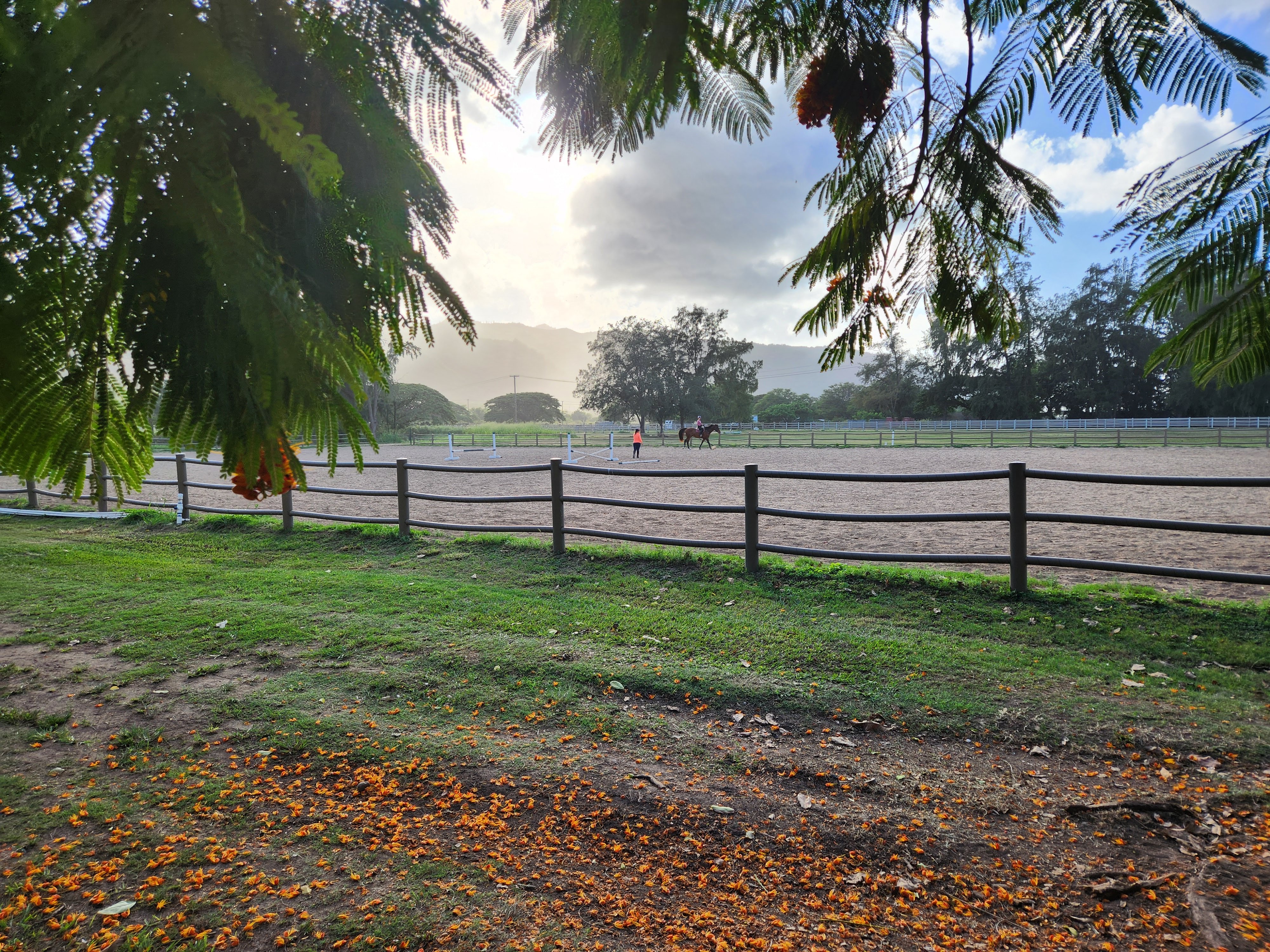 When I had originally spoken to the organizer of the Hawaii region certifications about staying on and teaching, I was envisioning several days of traditional “mounted meeting” type clinics where I would be teaching back-to-back lessons at a facility from morning until late afternoon. However, what actually transpired was very different, and I was not at all sad about it because it meant I had lots of time to play and explore on the island! Had we come to Oahu at a time when kids were off of school this might have been different but the timing of our visit meant that I was somewhat limited to teaching the adults that had flexible work schedules and the kids after school. Today was one of my busier teaching days and I was scheduled to go back and forth between two barns on the North Shore for several lessons.