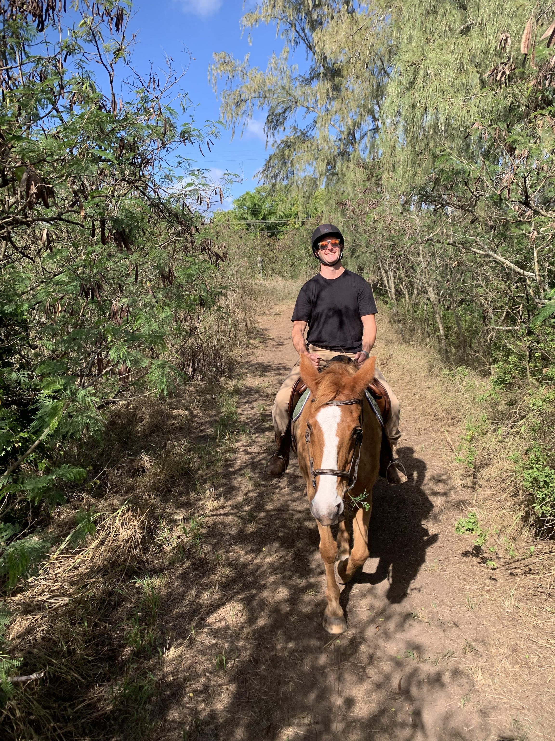 The organizer of the certifications and clinics had generously invited Scott and I to go on a trail ride while we were at Dillingham and we were excited about the opportunity. Her daughter Minnie was our trail guide and we all rode their family’s horses. We didn’t get to go on the beach but we got a nice tour of the sprawling Dillingham Ranch and it was fun to see Scott get to ride. He was on a big Belgian warmblood mare named Sadie that had come over at some point from Virginia. She was quiet and steady and they made a nice pair. Scott looked right at home and remembered everything I had taught him from his previous rides. When we were walking along some of the more wooded paths his steed decided she was in need of a snack and started grabbing leaves from the trees along the way. Scott asked if this was ok and Minnie said yes. Sadie then took this as an opportunity to turn the ride into a full blown buffet and we had to explain to Scott how to keep her walking as she grabbed bites instead of letting her just stop and munch to her heart’s content.