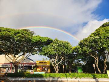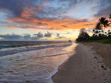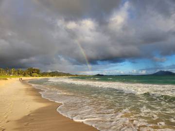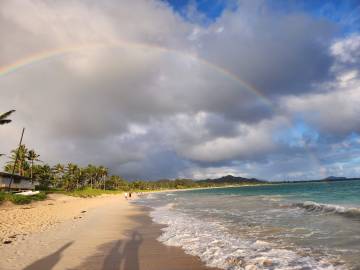 The certification didn’t start until nearly lunch time on Saturday, so Scott and I were able to get in a nice morning walk to and along the beach. This time we headed north from Kailua Beach and made our way to Kalama Beach. Along the way we were treated to a colorful sunrise and a stunning rainbow.