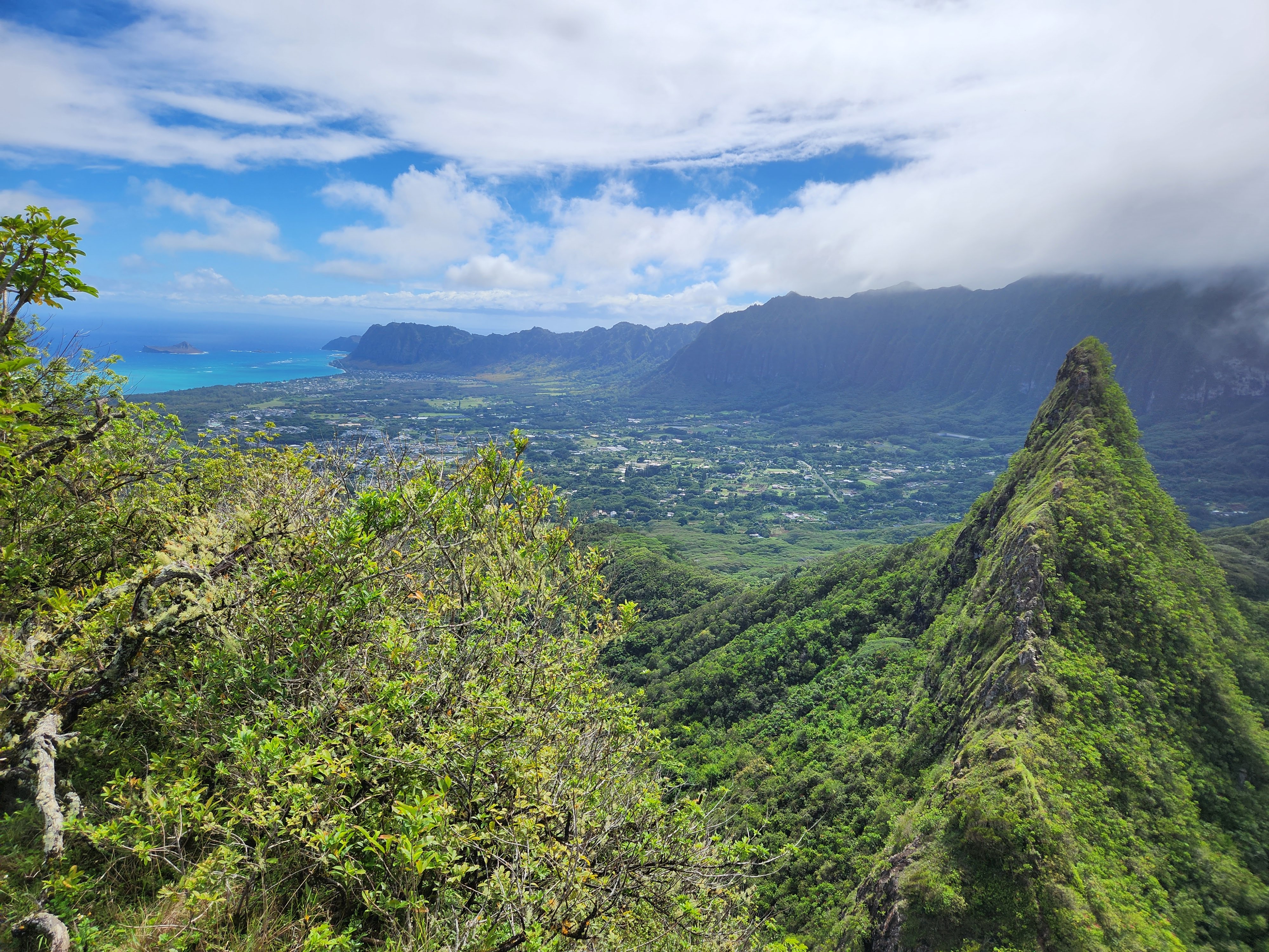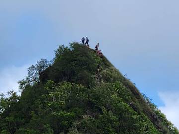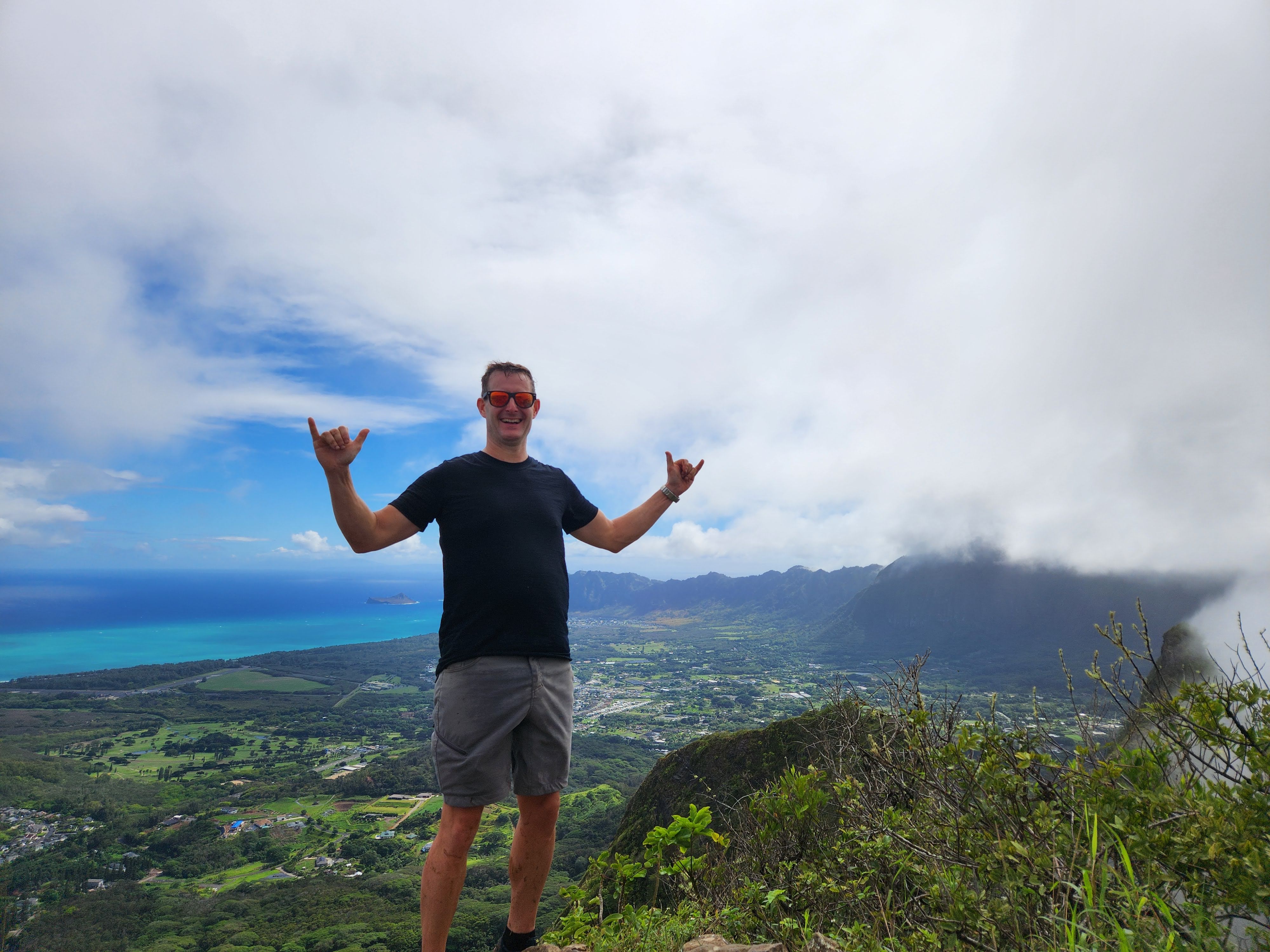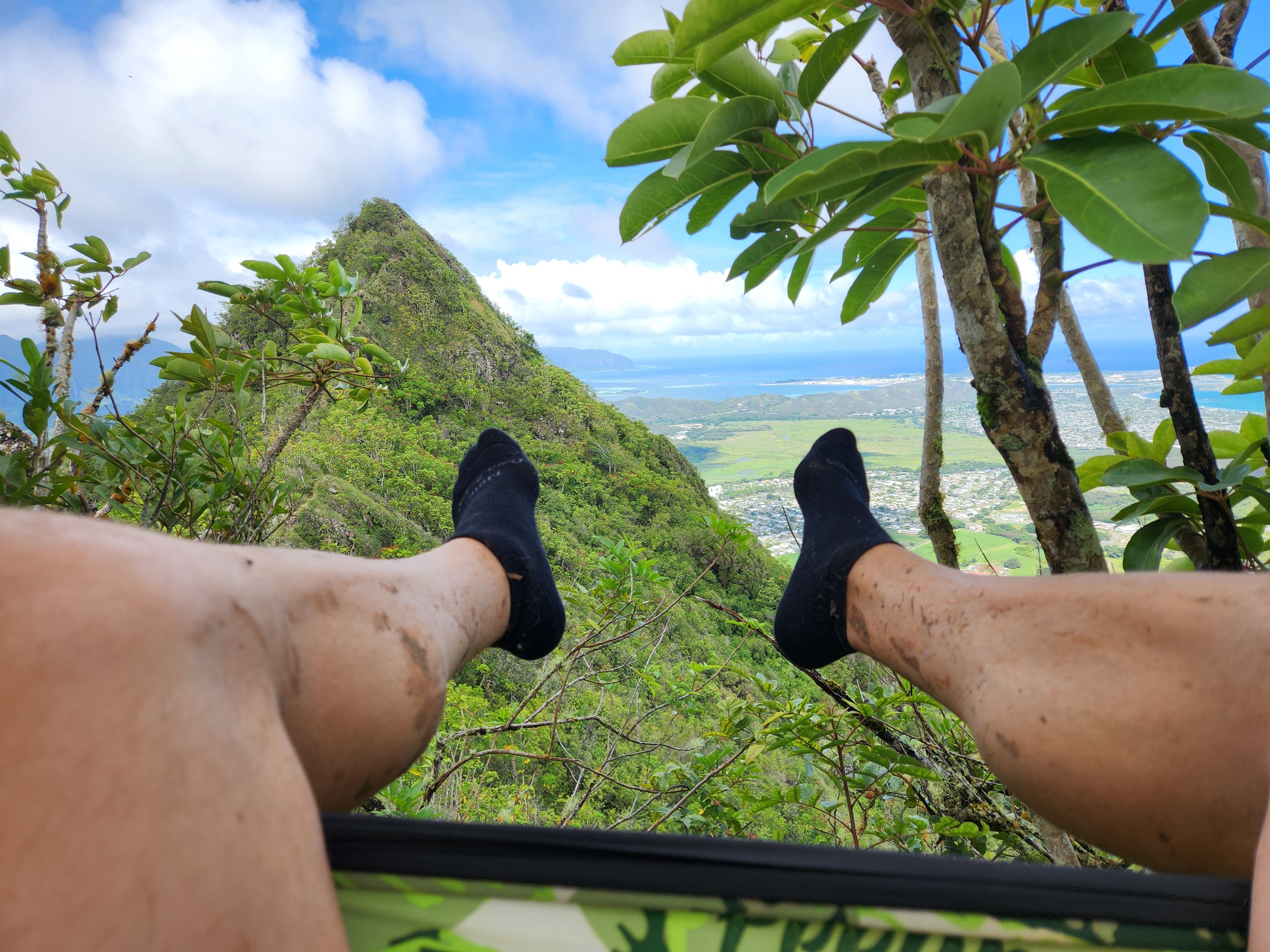 On the first day of testing Scott planned to hike Mount Olomana or Three Peaks (the hike that the Airbnb owner had warned him about) and it turns out that its trailhead was less than a half mile from Maunawili Farms. In fact, I had a view of it from the farm while Karen and I were testing. He both survived and enjoyed the hike and thankfully only did the first two peaks, avoiding the third and most dangerous. It was fairly steep and slick with mud (so much that when he got back to the Airbnb he got into the shower fully clothed to wash off his clothes!) and there were permanently affixed ropes along the way to help navigate the trails, but the spectacular panoramic view of Oahu at the top made it worth it. At the second peak he was even able to hang his hammock and enjoy a siesta atop the mountain.