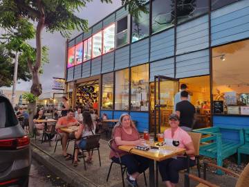When Karen and I were finished testing we headed home to write up some of our test sheets and then we connected with Scott and we all headed to dinner. I of course had spotted the local brewery- Lanikai Brewing Company, and wanted to check it out. On the drive into Kailua we were treated to a blaze orange sunset as the sun dropped behind the moutains. When we got there we saw that it had a food truck outside and I gave Karen and Scott the option of going somewhere else. They were good sports about it and said they didn’t mind. All the brewery’s beers were their own and we each got something different. Scott wandered across the street and found a taco truck to order his meal from and while he was over there also found a local artisan selling bouquets and arrangements and he bought one to give our Airbnb hostess which I found quite sweet. Poor Karen had forgotten her reading glasses so we got a good laugh over me having to read her the entire drink and food menu though, and she somehow ended up unintentionally ordering a flight of spirits that she shared with us. Scott regaled us with stories from his Three Peaks hiking adventure.