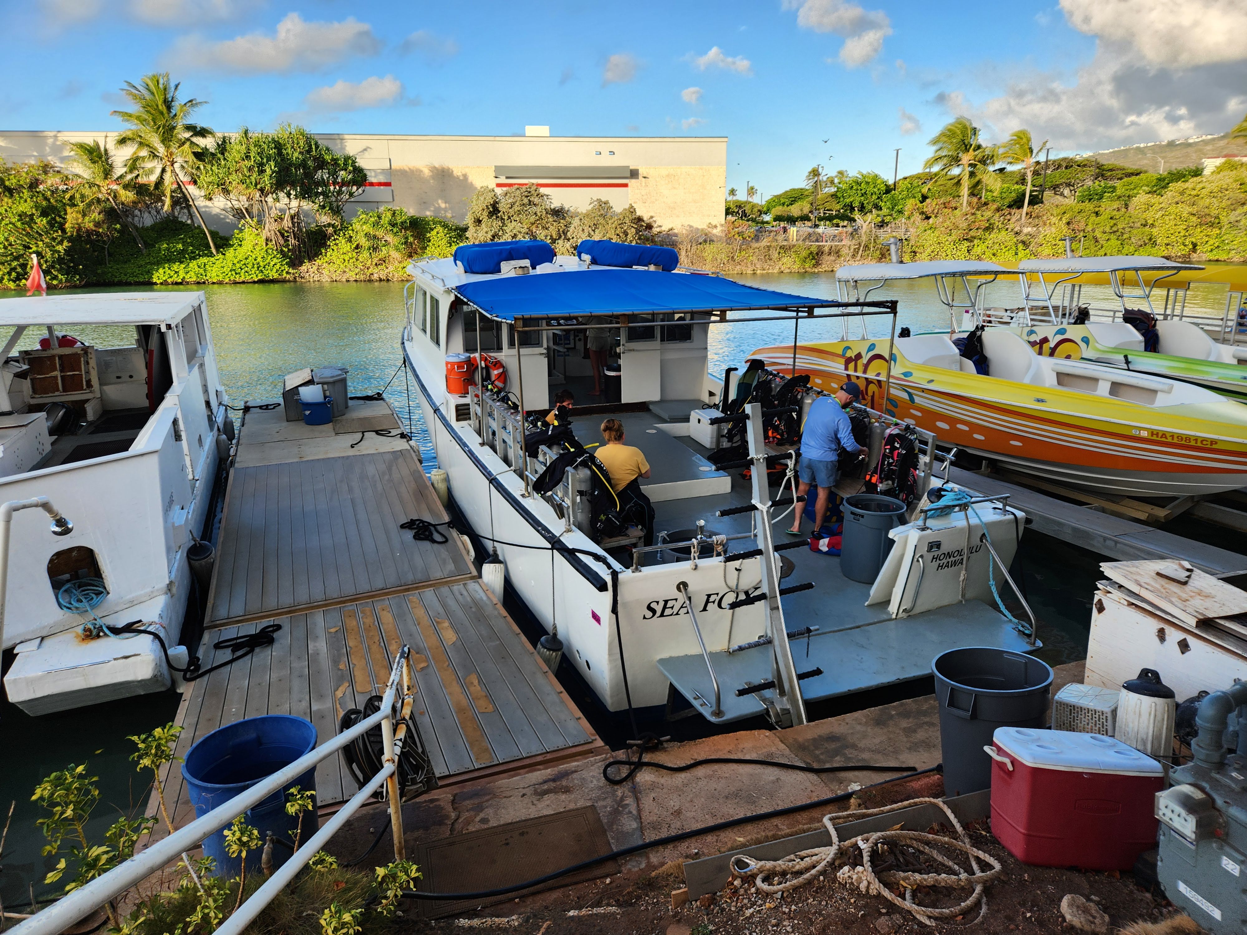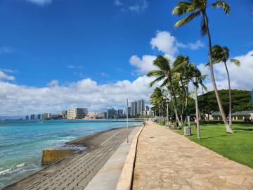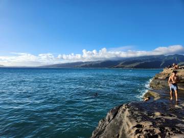 Scott here! After much research, I found a dive shop in Honolulu called “Island Divers” that was much closer to Kailua that had a dive charter package that worked with our schedule. It provided three dives on one charter, all in nearby Maunalua Bay. The first dive was at a crashed Corsair airplane at about 115 fteet. The plane had gone down in the 1940’s (the pilot was ok). The water was warm and the visibility was good so I was able to explore the decayed and coral covered wreck for about 40 minutes and saw lots of schooling fish that were attracted to it. The next dive was only about 15 minutes away and we sat around talking and waiting until we had an appropriate surface interval before we dove again. The second dive was called New Barge and was eventful because we saw a six foot long whitetip reef shark swimming along the ocean floor. It was another short boat ride to the next dive site which was a drift dive which means the boat drops you off and you let the current push you along. We drifted along a shallow coral ledge at about 40 feet and saw two moray eels and some puffer fish. We got back early afternoon and from there I headed to Waikiki where I did a little hammocking and walked along the beach. While hammocking, I called a small kayak outfitter that I had found and arranged to rent a two-person sea kayak so that we could kayak later in the week. On the way back I stopped at China Walls and jumped off of its cliff and swam. I’m handing it back to Janna now.