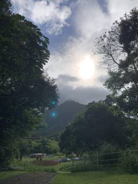 Both testings were about ten minutes away from our Airbnb at Maunawili Farms. Maunawili was a beautiful facility and Karen and I enjoyed testing there. The arena was picturesque and was shaded by giant “monkeypod” trees, which looked like an overgrown and more impressive sprawling Mimosa tree, with the same delicate and feathery pink flowers (and of course they are invasive, just like everything in Hawaii it seems). The property manager, who was also one of our Dressage candidates, told us that she and her son had planted them 30+ years ago.