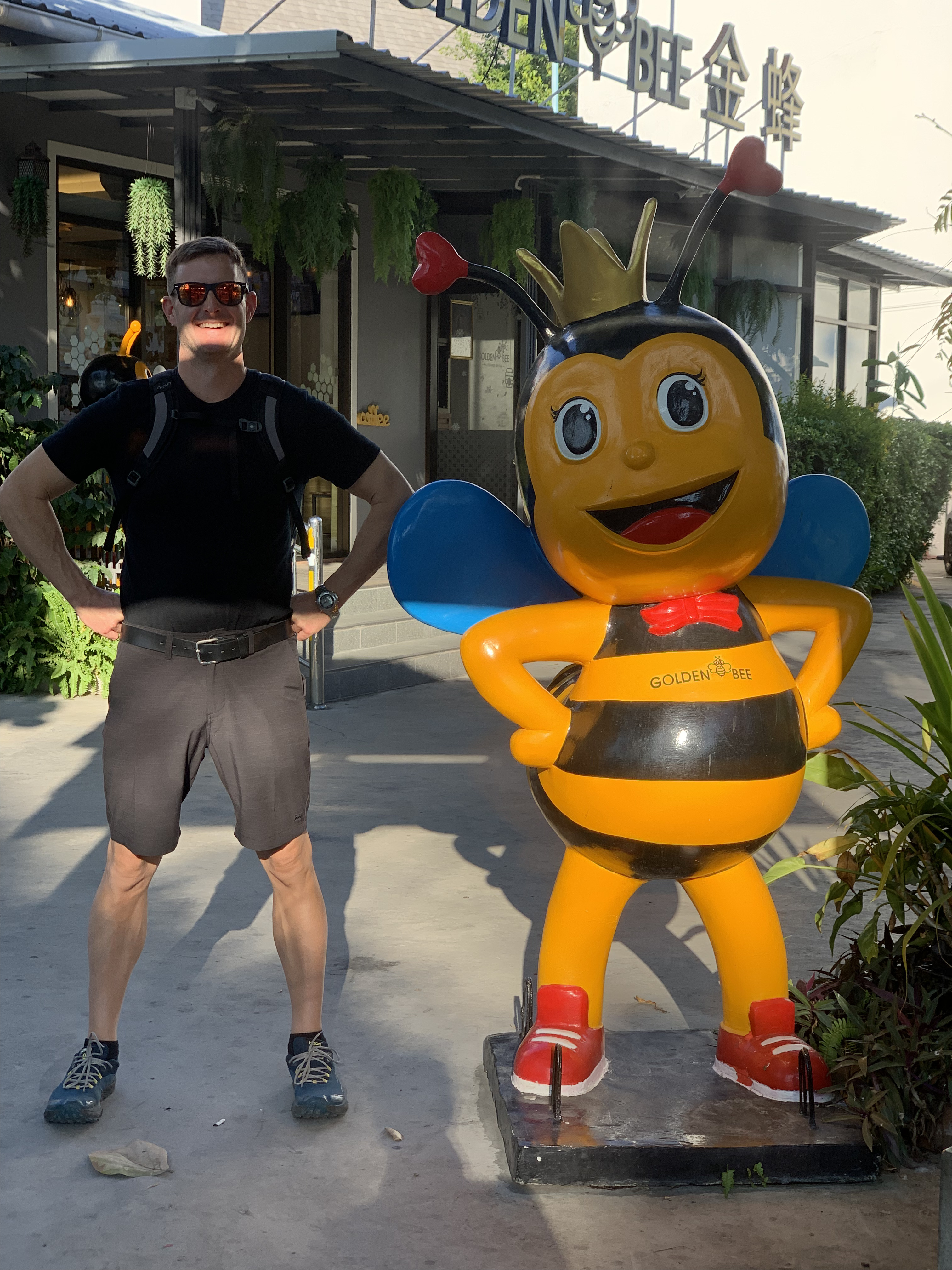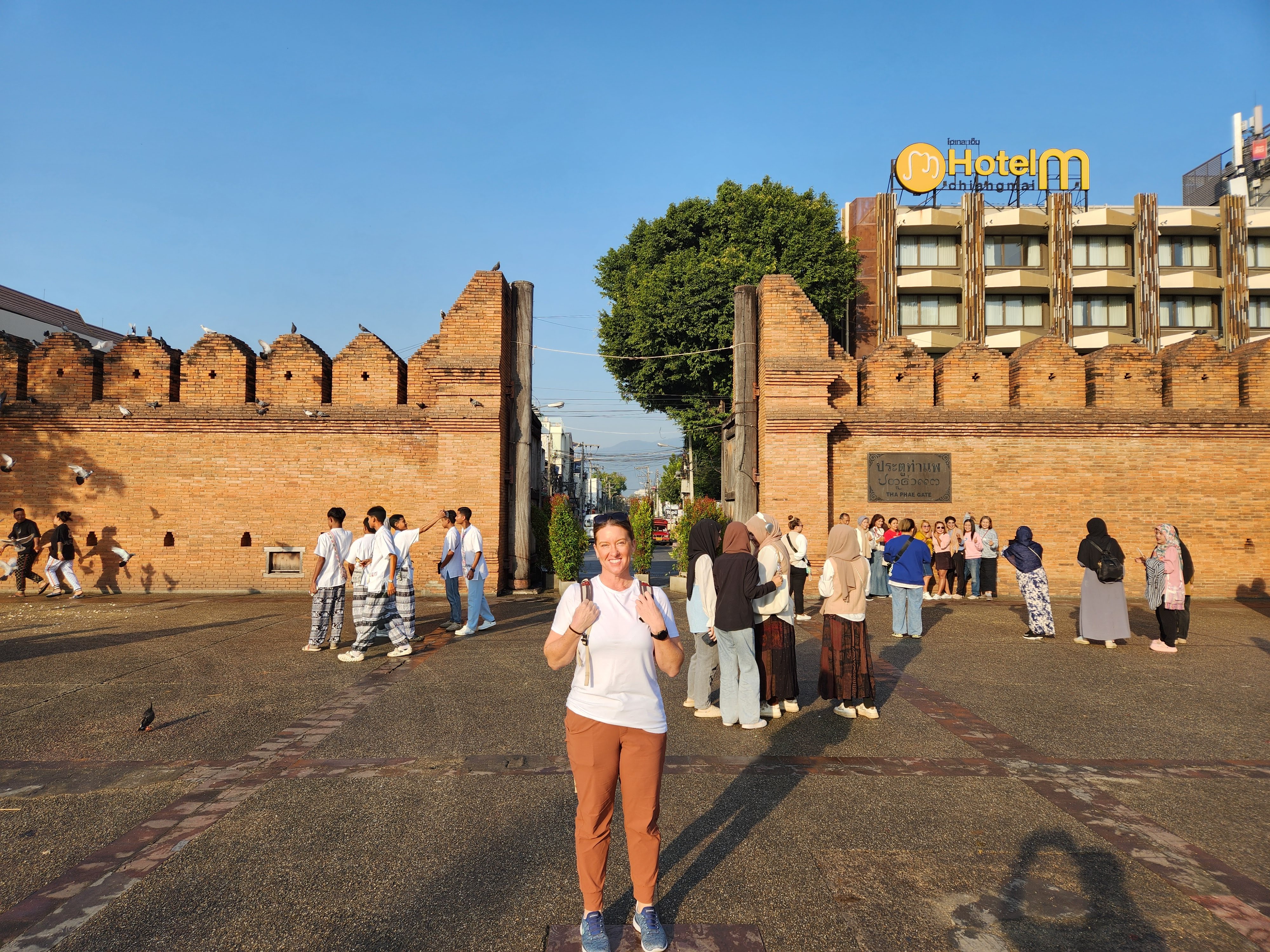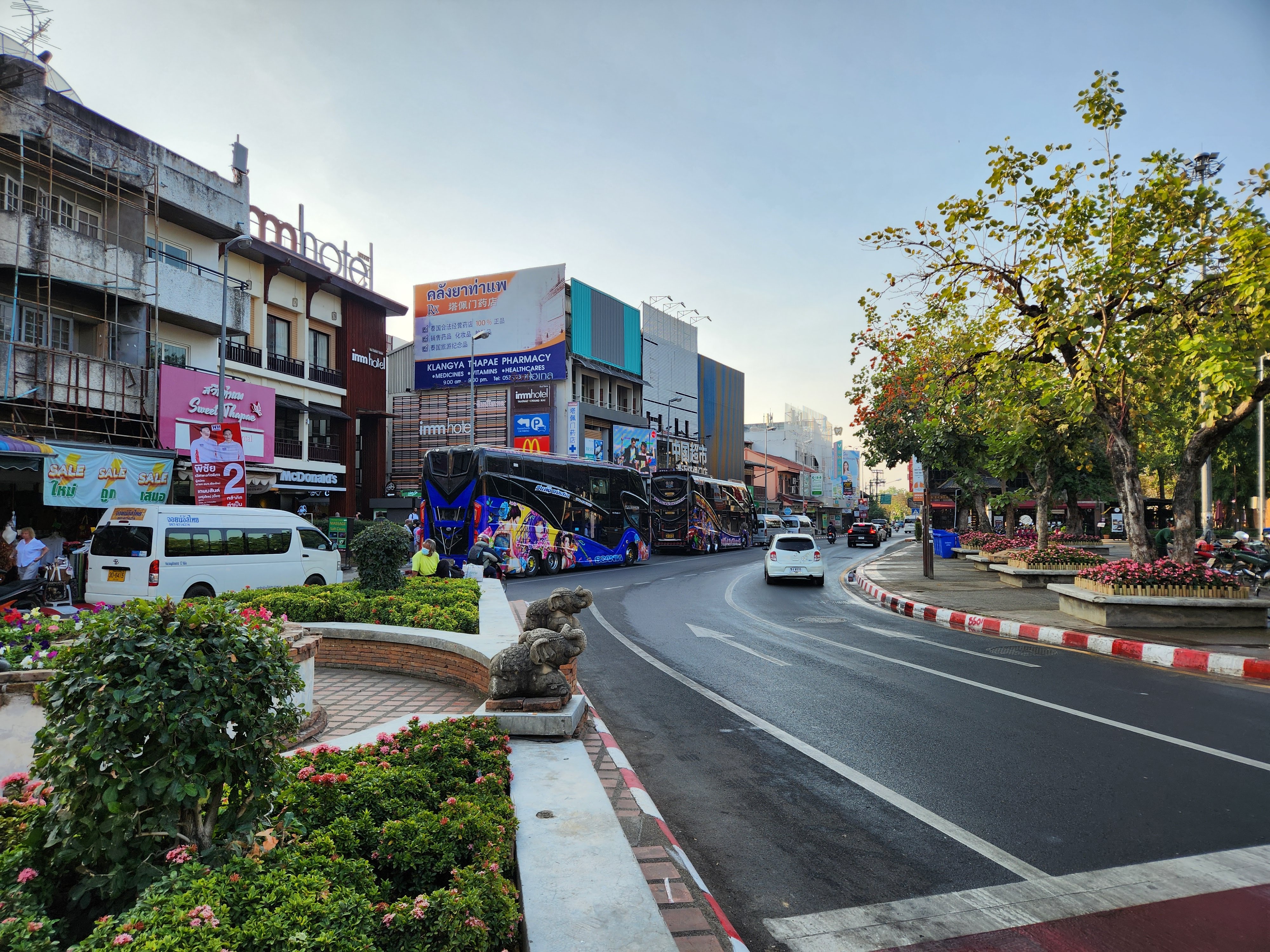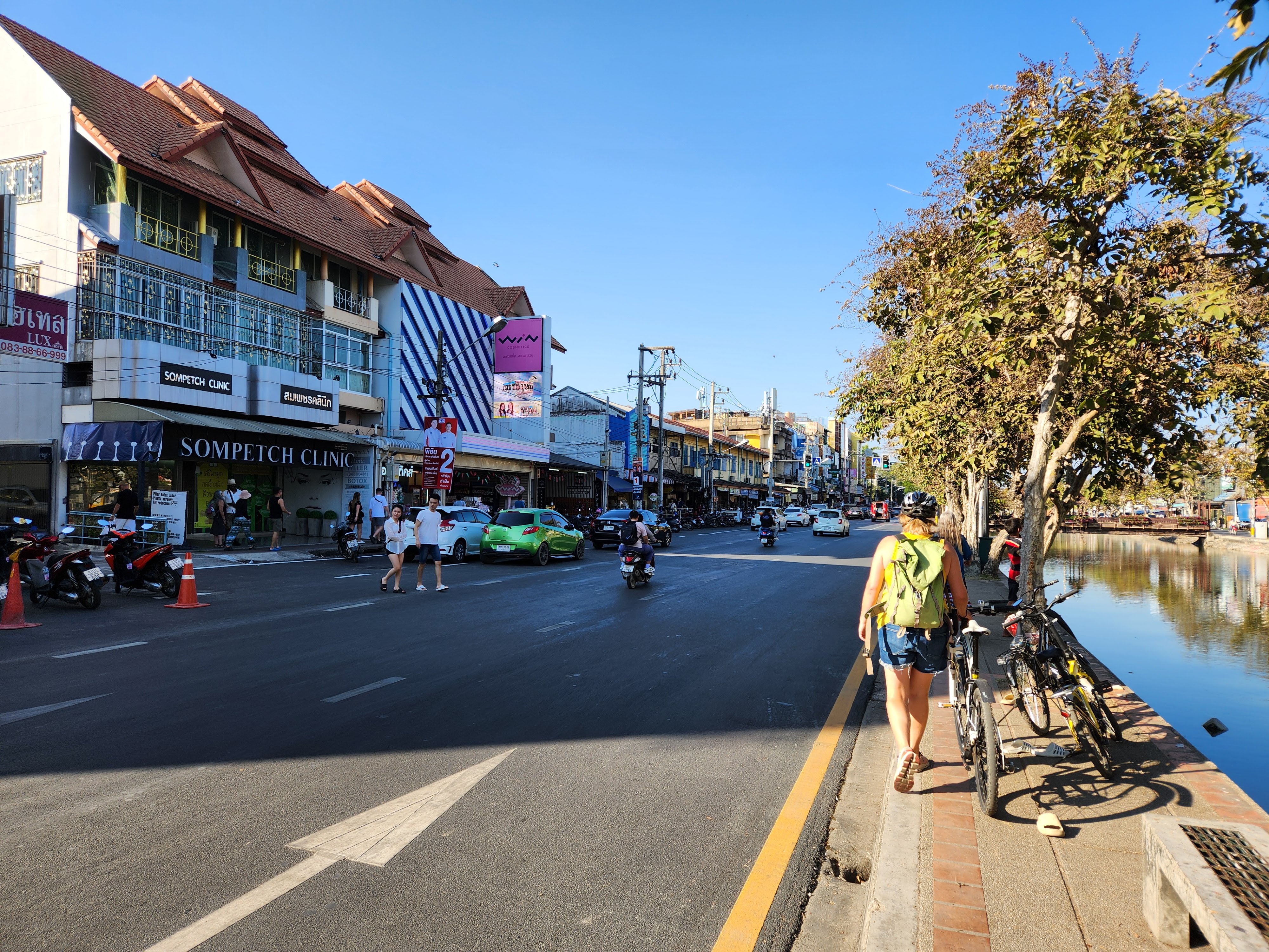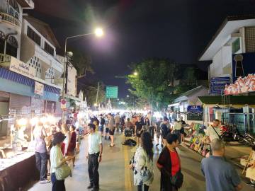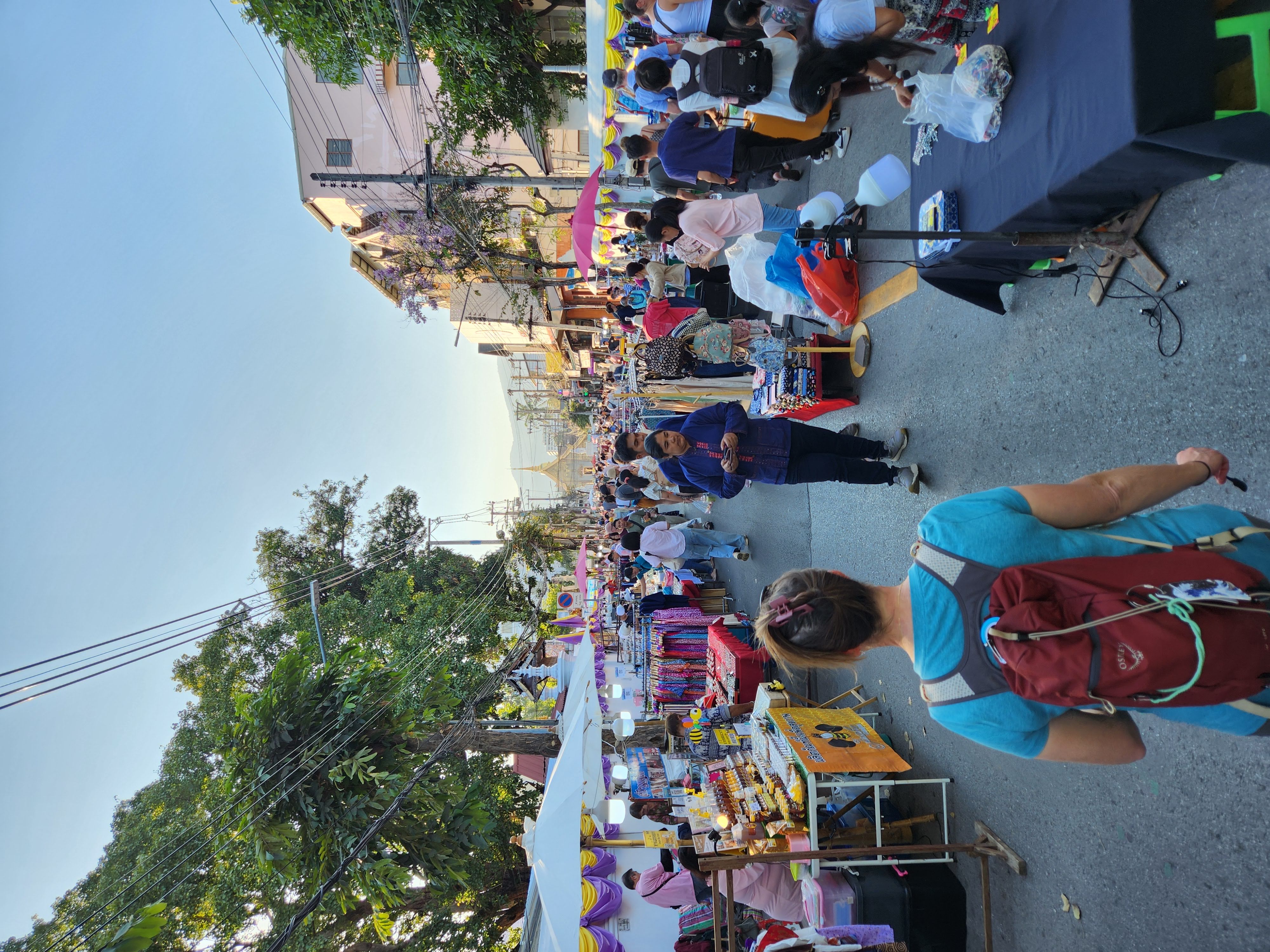 We headed back to our hotel. I decided a nap was in order and Scott decided that he wanted to explore more of Chiang Mai. He wandered northeast where we hadn’t ventured yet and first ended up in an area with several clothing stores. He decided to see if any of them carried the “Made in Thailand” Woolly brand merino wool shirts that he wears and specifically picked for travel due to their quick drying properties and their ability to repel odor. No luck. So he continued along and found an art gallery, the local Muay Thai boxing arena, popped into a McDonald’s to see how their prices compared to back home, saw the night bazaar being set up, and then got a lime smoothie. He reported that the lime smoothie made for a rather “puckering experience.” I eventually texted him inquiring as to his whereabouts and he started heading back to Fang Chiang Mai, walking along the canal.