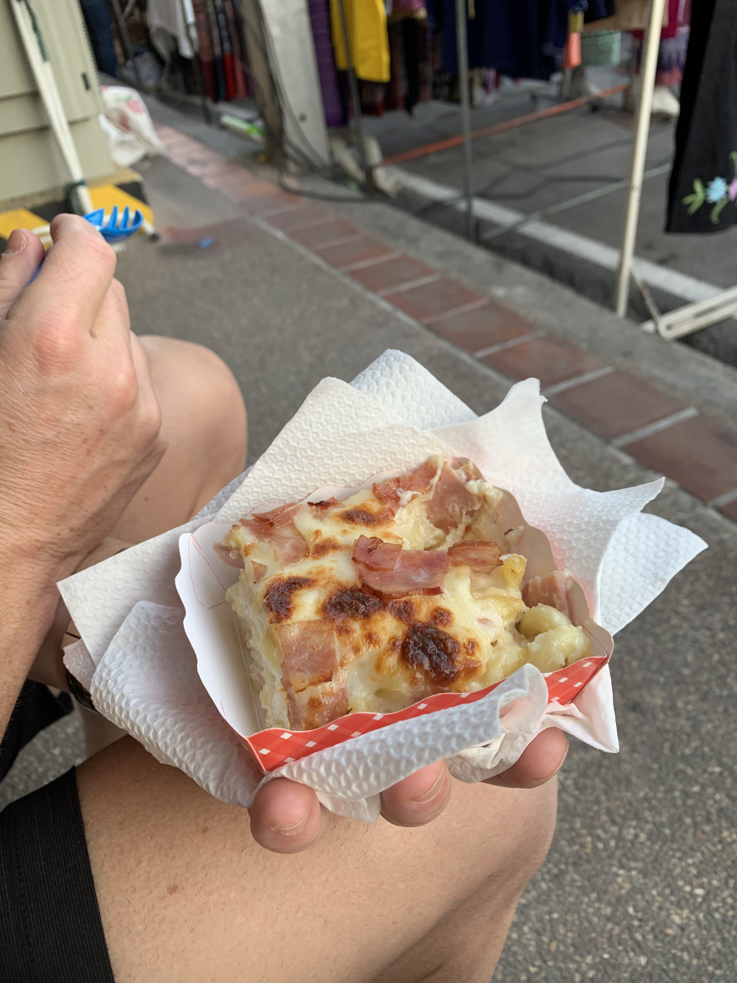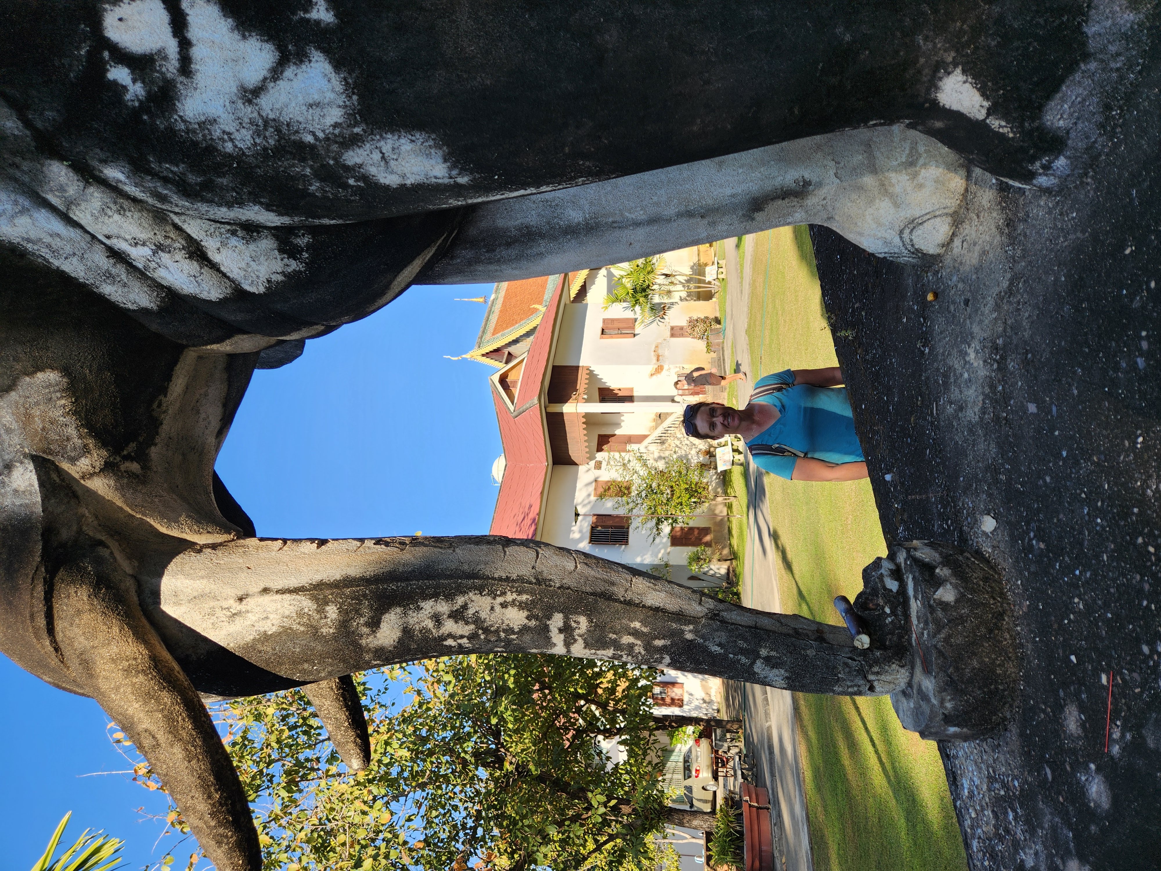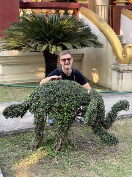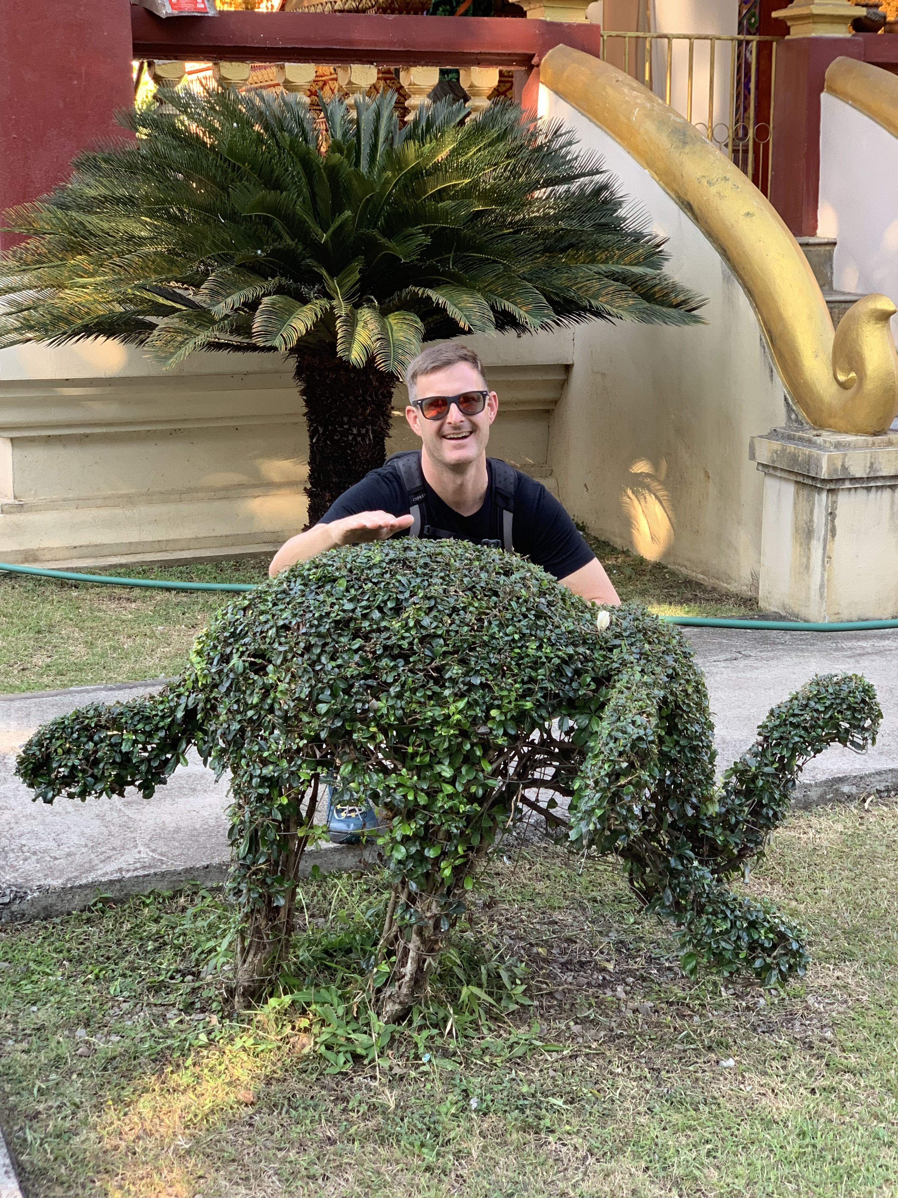 We came across a popular and crowded street market as we were working our way from wat to wat, and we strolled through it and found a few snacks. Most notable was the coconut ice cream that was pleasingly served in a coconut half-shell, and little individual serving size lasagnes. I also found a cute little faux leather elephant keychain and some pajama pants, and shockingly, Scott found a fun button-down shirt with a palm tree print. (He very seldom buys clothes and certainly not on a whim!)