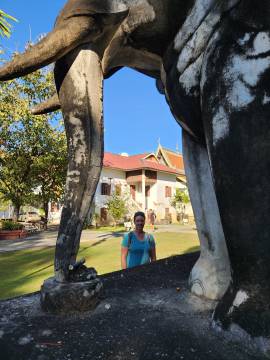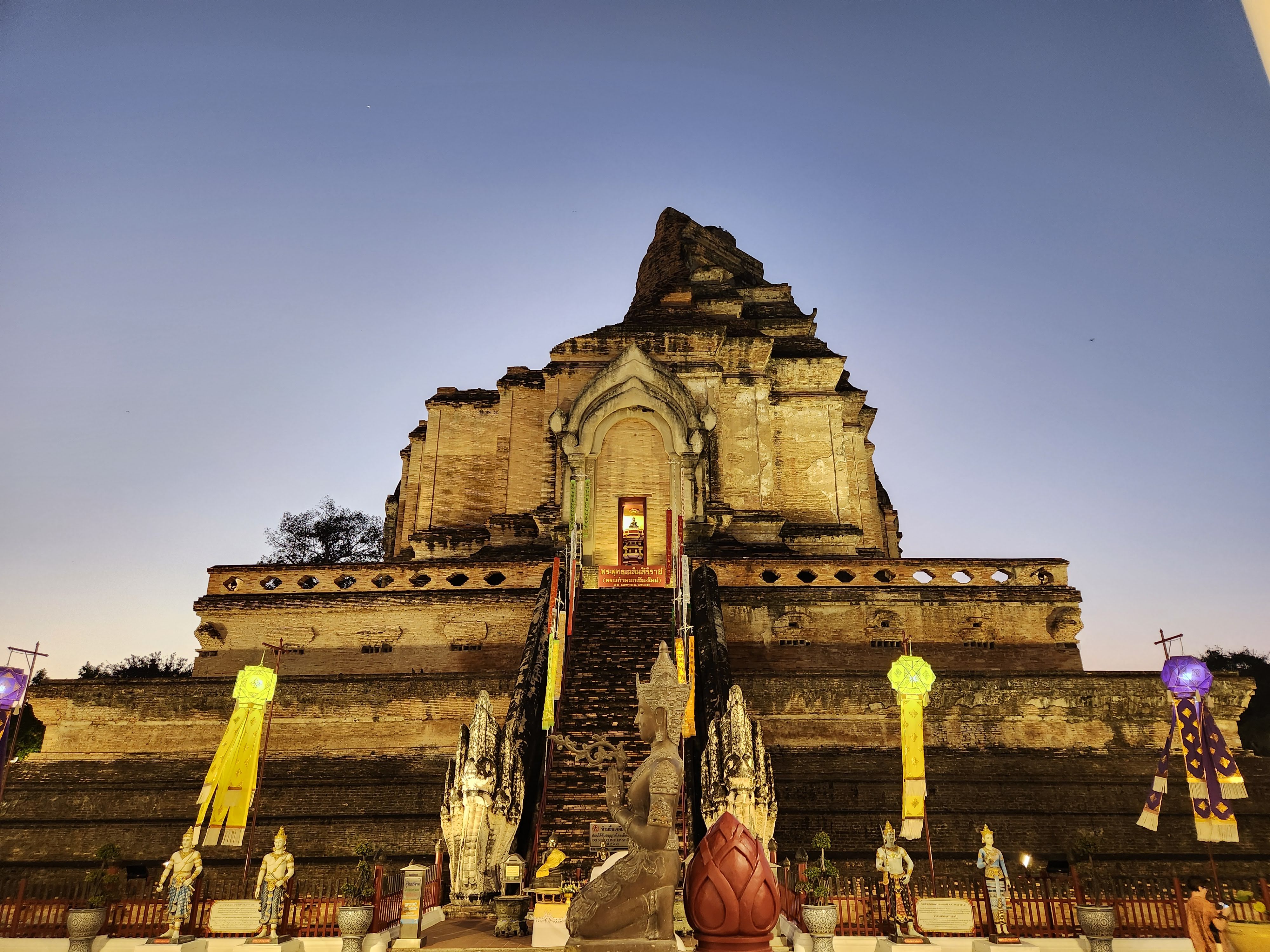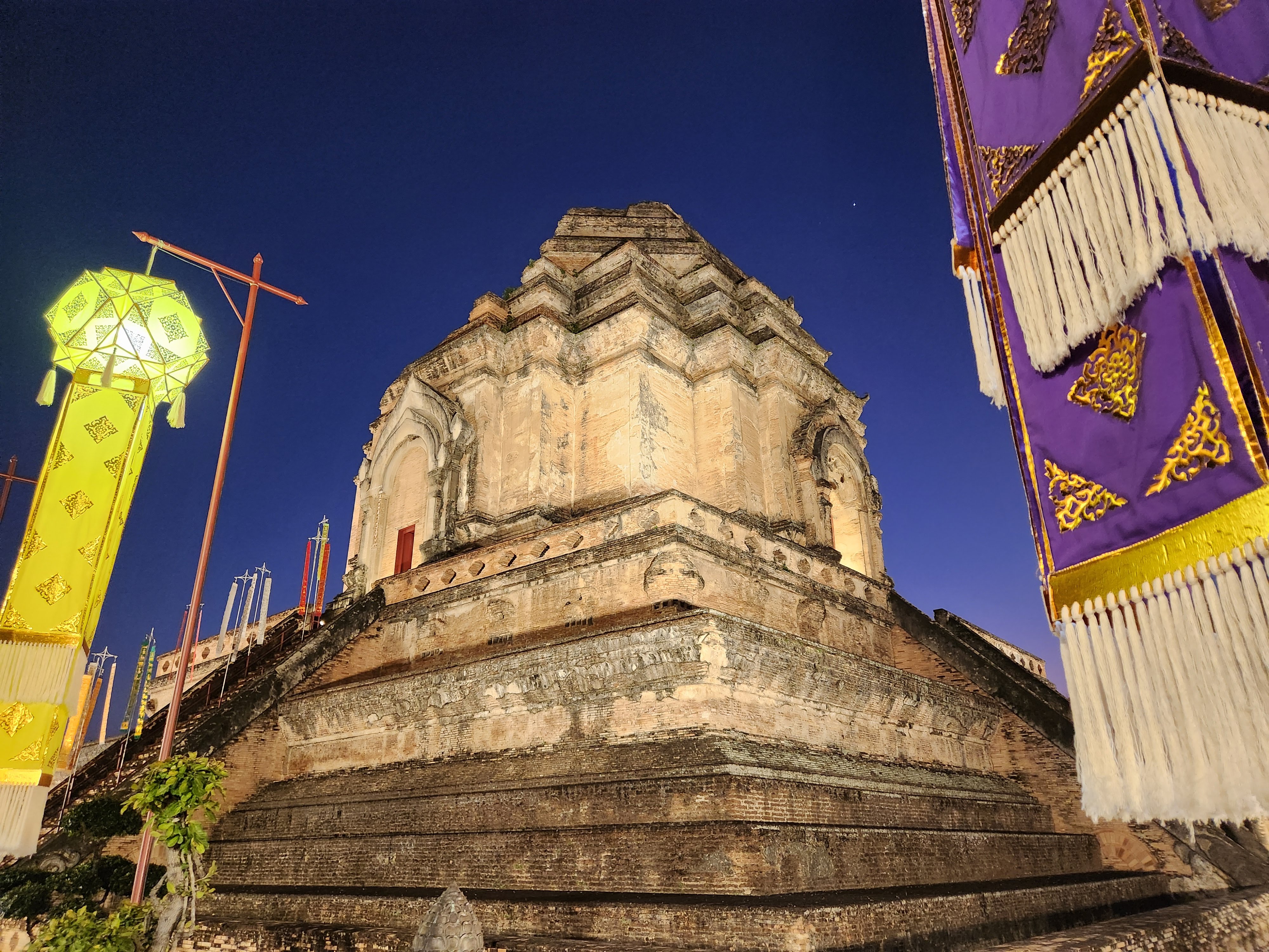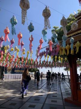 Wat Chedi Luang: This one might be my favorite because it had an asymmetry that gave it character- the top of the tall structure was missing, lost to an earthquake in 1545. It also had stone elephants around the temple. It was impressive because of its height and the grounds were decorated with elaborate colorful fabric lanterns.