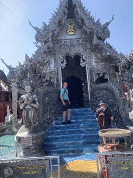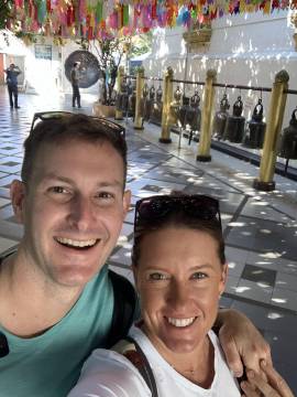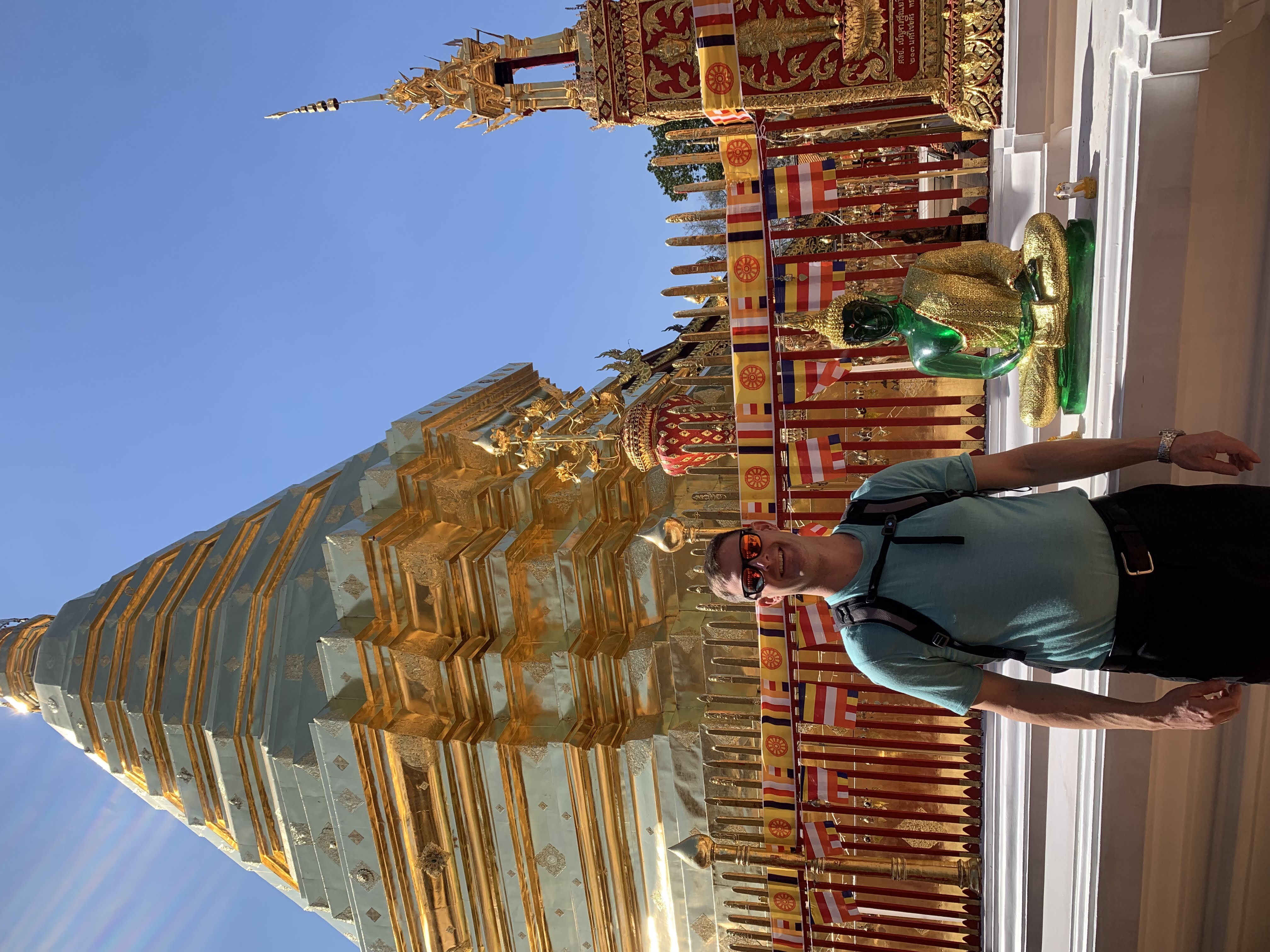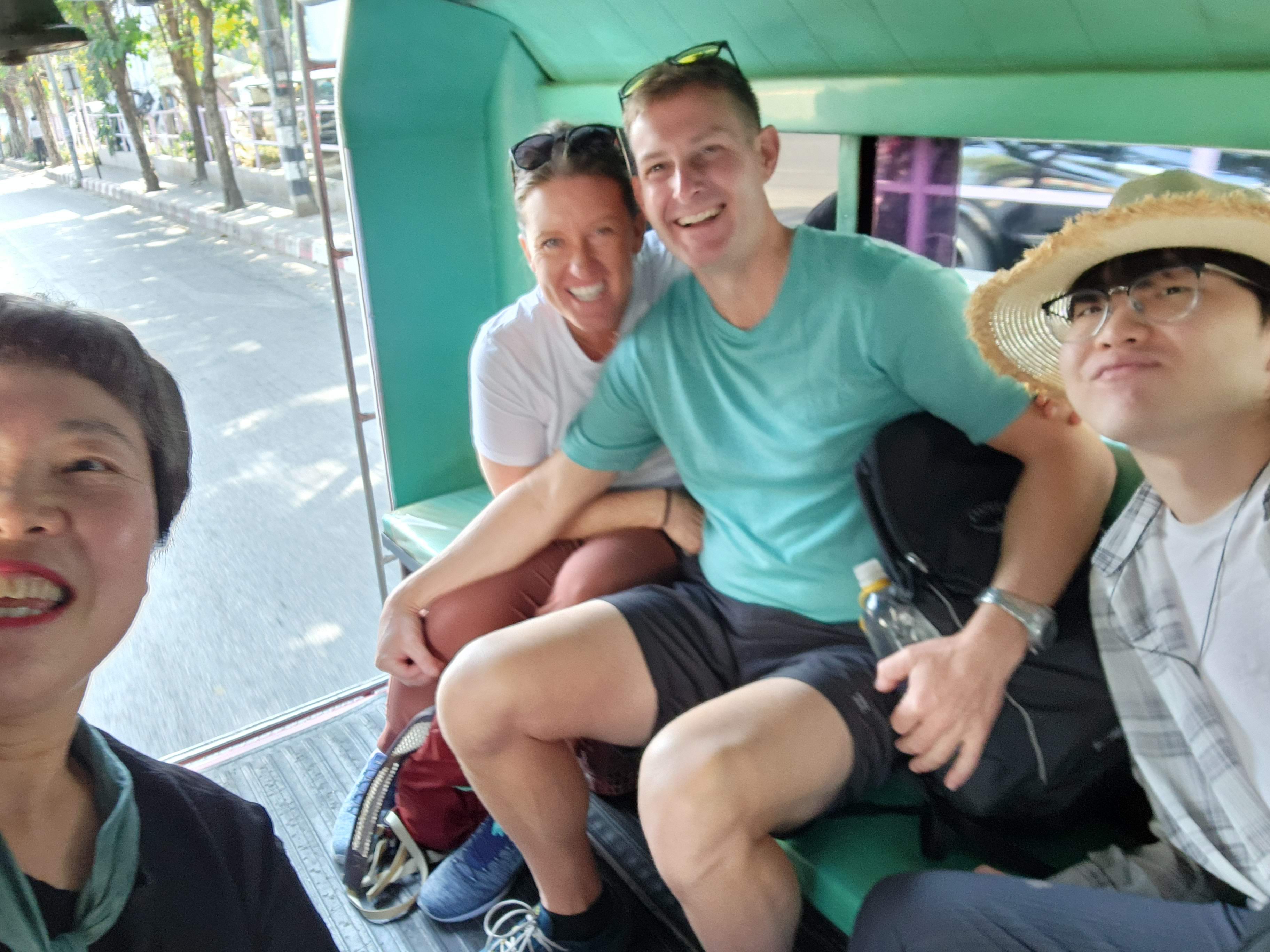 The wife/mother was a teacher in South Korea and spoke good enough English that we were able to communicate. We each inquired about the other’s time in Thailand thus far and found out about their occupations (she was an elementary school teacher and had the same elementary school teacher vibes of every American teacher- we quickly discovered that this energy is universal and has no ties or allegiance to any one particular country). We shared information about what part of our respective countries we were from, as well as the weather back home (they were also escaping the cold). She told us that her family’s favorite part of their Thai vacation so far was the cheap massages and they each had gotten one a day during their trip. Scott and I got a kick out of this authentic interaction and the family seemed to as well; in fact, we took selfies along the route with them and had our taxi driver take a group picture of us when we reached Doi Suthep.
