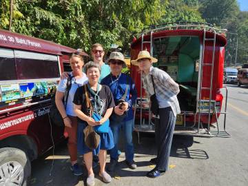 We made our way back to a street corner where many of the red truck taxis were gathered to see what sort of price we could secure for a trip up and back, and had the good fortune of timing our arrival to the taxi rank with a family of three from South Korea that was also haggling out the details of a trip to Doi Suthep. The red truck taxis can fit about eight people and the cost per person is lower the more people are inside it, so we asked the family if they wanted us to join them. They were happy to have us and we quickly made friends during the ride.