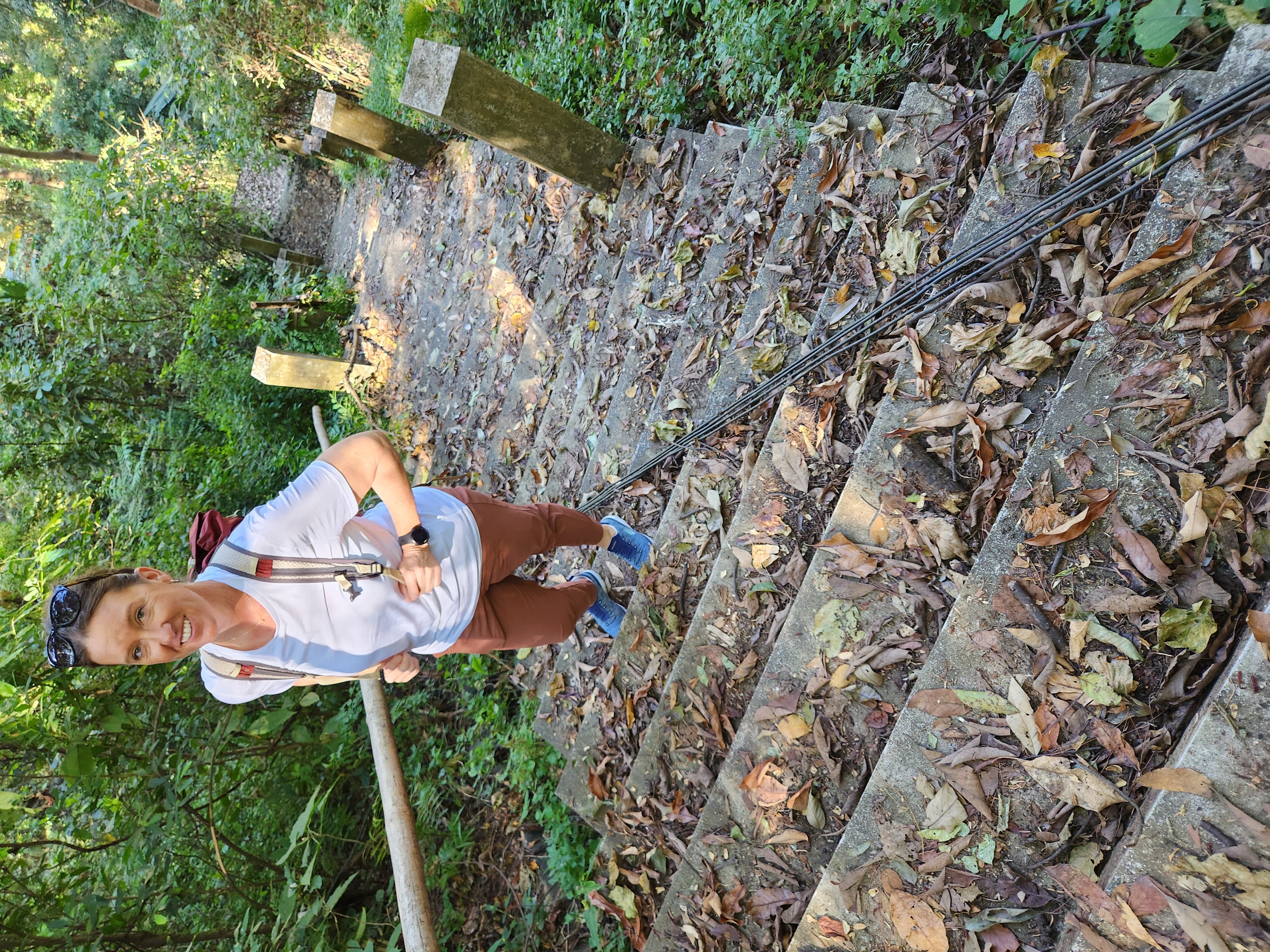 We saw a somewhat homemade looking sign to Doi Suthep and followed the path it was indicating, but we noticed that there weren’t many (and eventually, any) other people on it. For a moment we thought that we might be falling victim to another “common scam in Thailand” where an enterprising con artist has their own entrance to a temple or other point of interest and charges admission, when it turns out that there is actually no admission charge. But we carried on because Scott spied some derelict and somewhat looking abandoned steps in the distance that appeared to go to the temple. We survived the stairs, huffing and puffing our way up the steep ascent, and then all of a sudden we were inside a monastery and saw that we were at a side entrance to the temple. The monk who we surprised did a double take and then gave us a smile and a thumbs up; evidently he approved of our backroads sneak route to the temple.