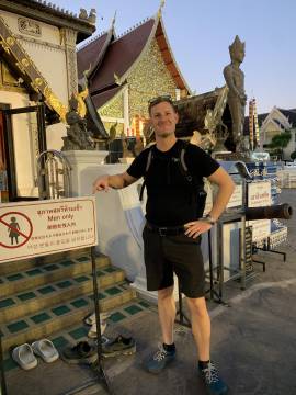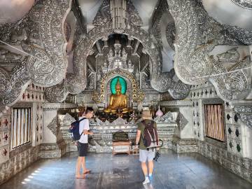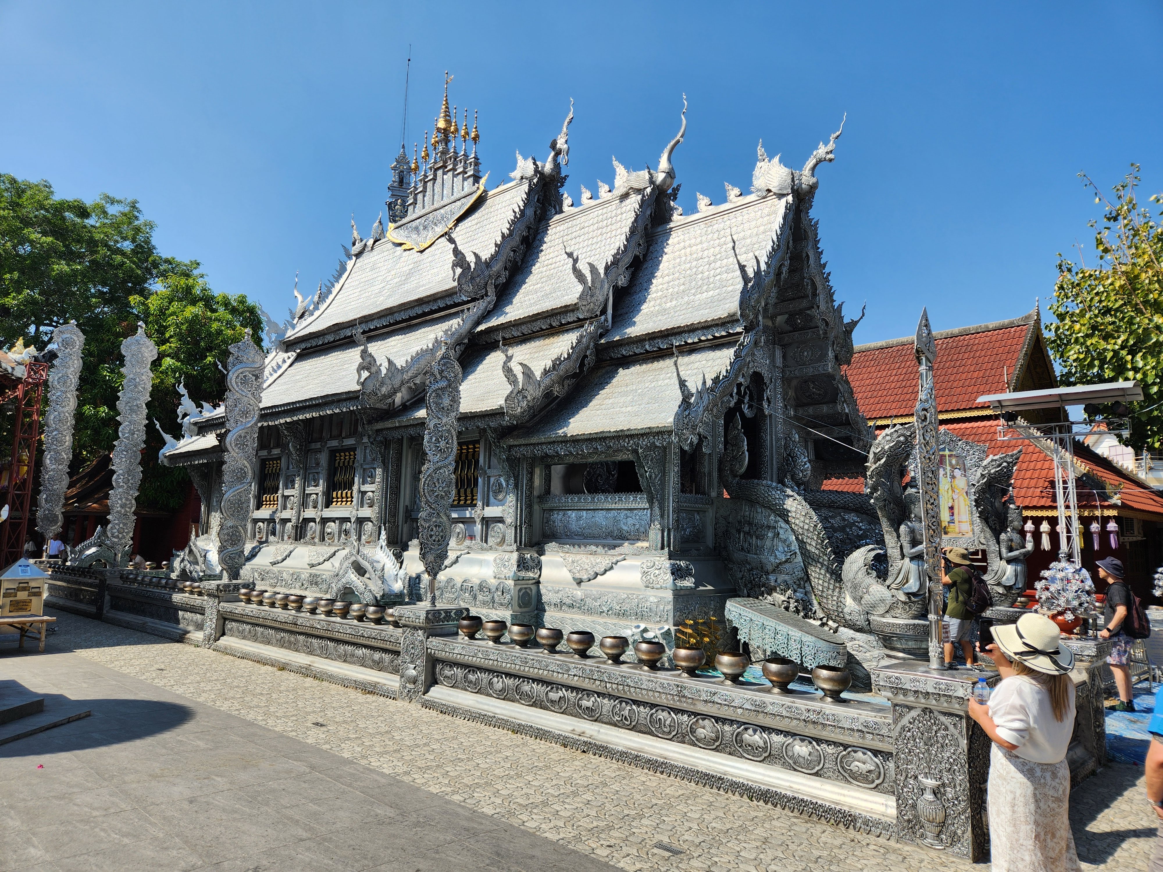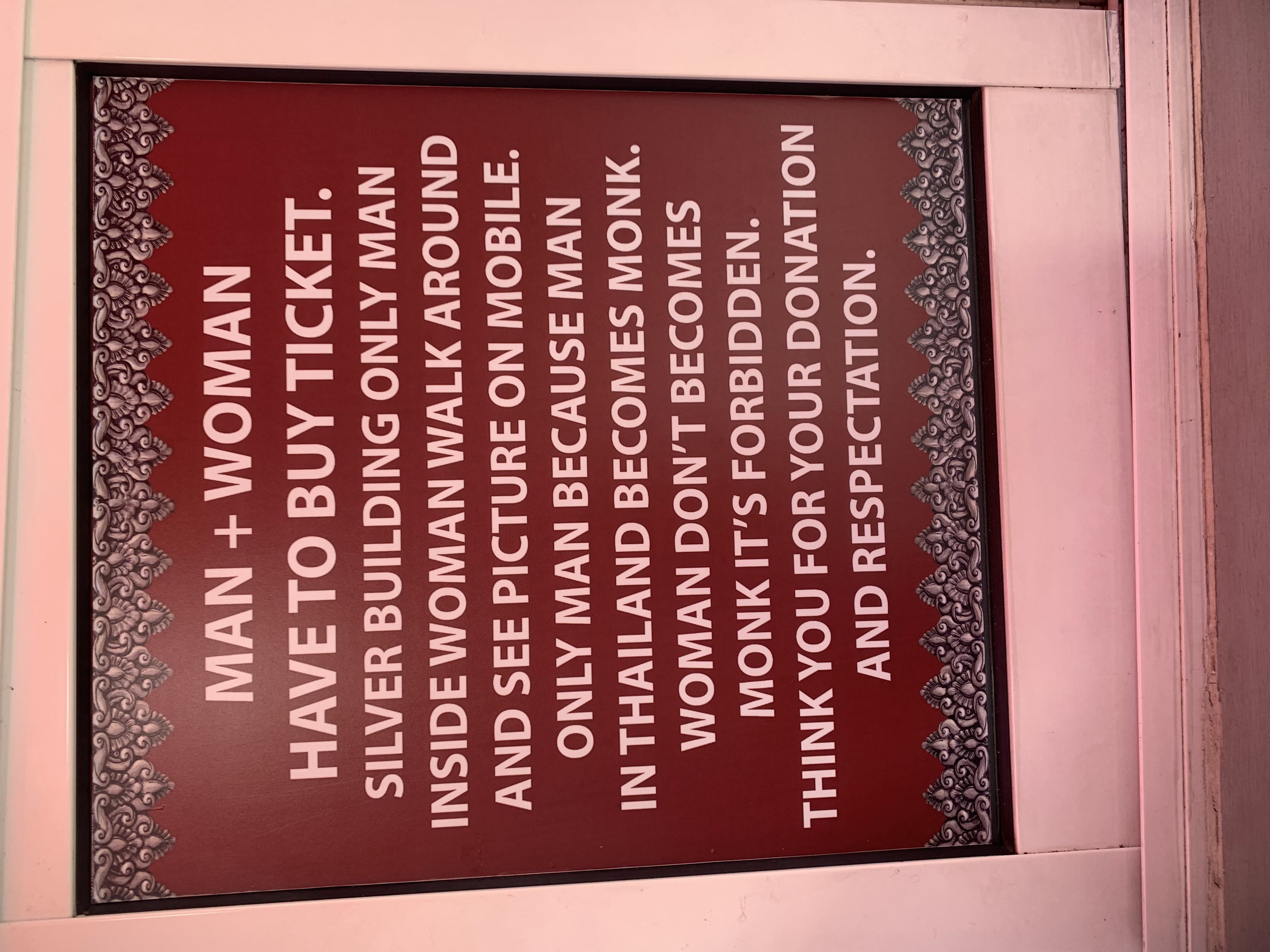 After our new friends were dropped off, Scott and I asked to be taken to the nearby Wat Sri Suphan, or the Silver Temple. We paid our admission, read the placards at the entrance, and then went in. I couldn’t tell you what the inside of the Silver Temple looks like because “SILVER BUILDING ONLY MAN INSIDE WOMAN WALK AROUND AND SEE PICTURE ON MOBILE. ONLY MAN BECAUSE MAN IN THAILAND BECOMES MONK. WOMAN DON’T BECOMES MONK ITS FORBIDDEN. THINK YOU FOR YOUR DONATION AND RESPECTATION.” I didn’t bother looking it up on my mobile and sat outside and took pictures of Scott who was cheekily posing with the “Only Men Inside” signs. (His report: “It looked like all the other wats. There was a buddha and pssst… it wasn’t even silver, it was gold.”)1 We did happen to see a woman trying to go inside the forbidden temple and an apoplectic employee quickly intercept her as he chastened her and explained to her the error of her ways.