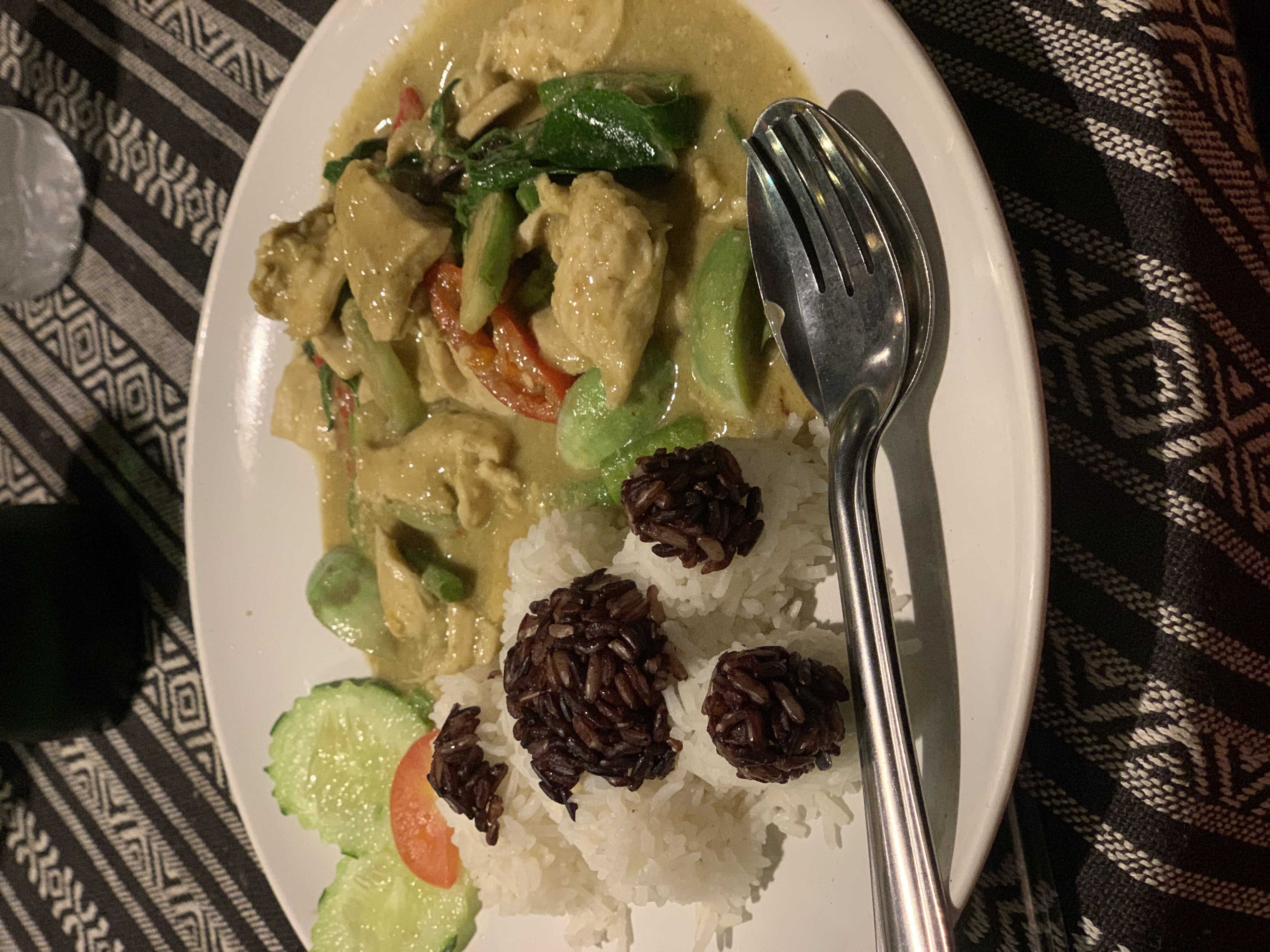 We had decided to try out Tikky Cafe for dinner, based on the recommendation from American travellers that we had met on our first night in Chiang Mai. We chose to walk the 3.5 km there to see more of the city. Along the way we passed a “Women’s Massage Center by Ex-Prisoners” and were perplexed as to what the heck that meant. Massages only for women? Or by women? Women “ex-prisoners” I suppose? So many questions. (Ahh, a quick Google search reveals that it is staffed by women who were formerly incarcerated and received vocational Thai massage training in prison.) We reached the restaurant and sat outside to wait for a table because it was quite crowded (always a good sign).