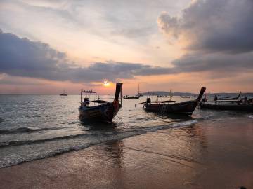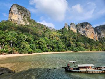 The beach was absolutely packed which made for interesting people watching and the longtail boat traffic was wild. There was a steady stream of them constantly coming and going, and while we had learned from YouTube travel videos that they were prolific in their numbers and in their racket, we didn’t get a true sense of it until we saw it in person. They would pull up onto the beach and throw their anchors at the water’s edge, deposit some passengers who then waded to shore, wait a few minutes, then load their next haul of passengers and take off across the horizon to some other place- most likely Railay Beach which was close by.
