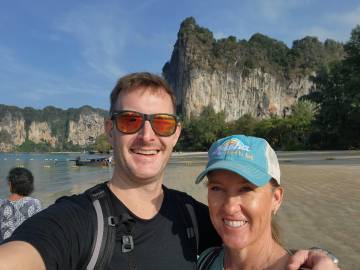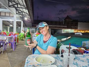 We hung out on the beach and in our hammocks long enough to catch the sunset over the bay and then decided to go in search of some dinner. Scott had read about a food market near the beach so we went in search of it. As we walked through the beachtown of Ao Nang we quickly sensed that we were in the Thai equivalent of Myrtle Beach, just with better scenery, with the iconic limestone karsts as a charmingly redeeming backdrop and antidote to the seediness of the town. I might have been hangry by this point so it felt like we walked for miles, but we finally found the food market and picked a stall to order from. The food was good and refueled us for the walk back up the hill to our hotel.