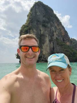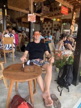 We headed back to our hotel for a shower before venturing back into town for dinner at a spot near the beach. (We walked so much this day- it was our record for most steps taken during the whole trip at almost 25,000!) On our way to the restaurant we booked a catamaran trip for the next day at a kiosk in town. We then enjoyed a sit-down dinner and after, picked up some cold Chang beers3 to sip while sitting on the beach while we were waiting for the fire show that was hosted by a local beach club to start. While waiting we actually saw that another fire show was happening further down the beach so we strolled down to watch and were suitably impressed. When that one finished we headed back up the beach and we got front row seats on the lawn and were thankful that we had, because what a show it was! These guys were unbelievable and took their fire show to the next level compared to the warmup act that we had watched a few minutes before. I even got to hold one of the props while one of the performers held the other end of the spinning ring of fire. When it ended we made the 1.5 km trek back uphill to our hotel, exhausted from all the walking but also from all the fun that we’d had exploring Ao Nang and Railay.