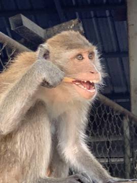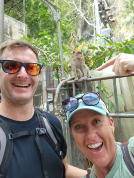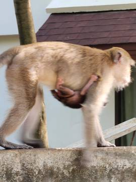 We retraced our steps and eventually reached an intersection near a floating dock and another spot where longtail boats and some other larger boats were dropping passengers off. We saw several areas where rock climbing lessons were taking place and while watching that, had our first monitor lizard and monkey spotting! The macaque monkeys would jump out of trees and land with a huge “thud” on the rooftop of the bathroom, before scrambling into the overhanging trees and climbing up the mountain. (Being inside the bathroom building while they were doing this was rather interesting and quite loud!)
