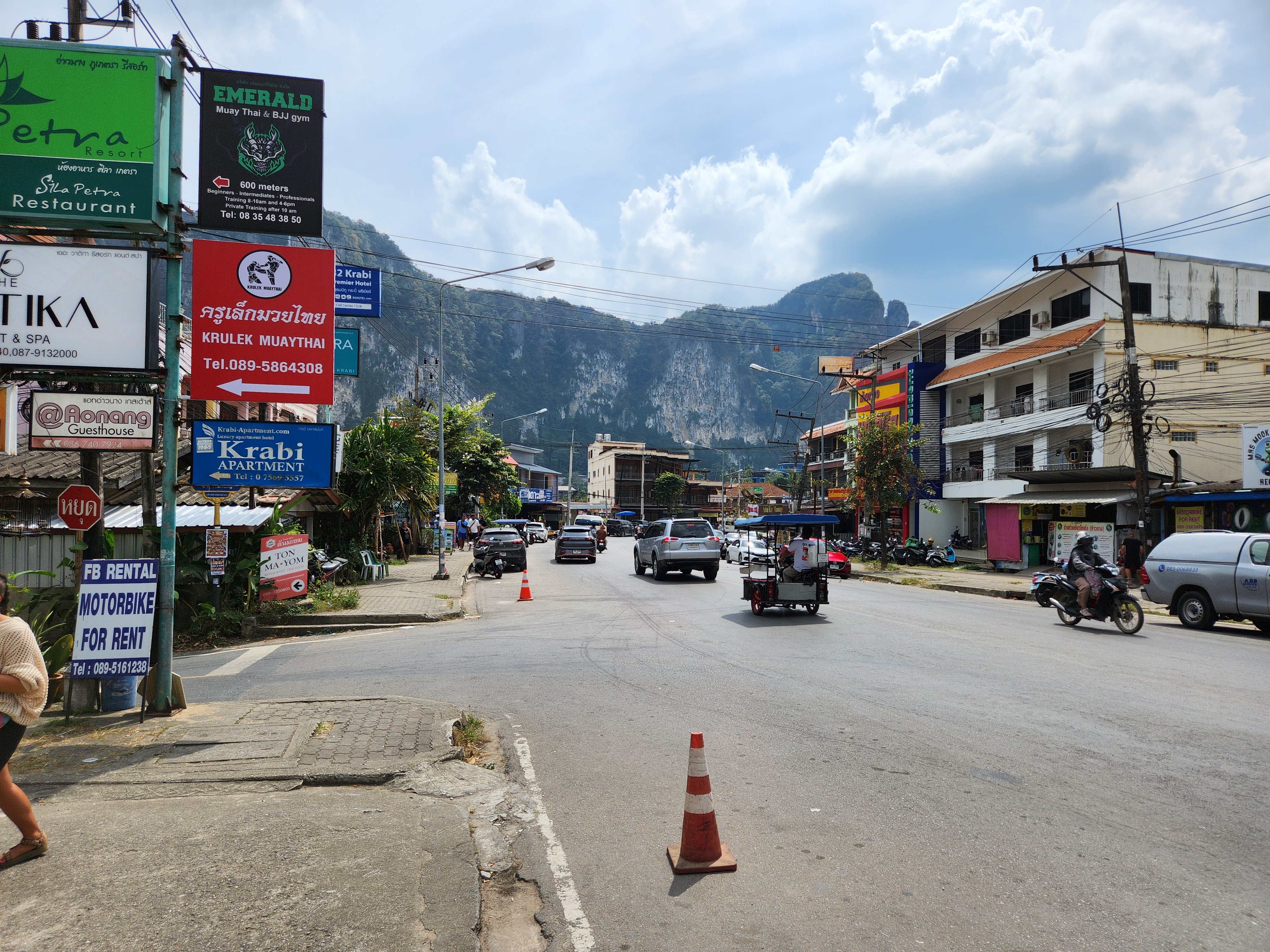When we arrived in Krabi, we were positively swarmed by aggressive cab drivers and transfer services standing in the arrivals lobby and we had to thread and shoulder our way through them. We had summoned a Grab and he was waiting for us. We put our bags into his car and then were treated to the ride of our lives. He was a risky chance taker and had some arbitrary and only known to him, time to beat for the drive to Ao Nang. It was hair-raising and wild. He was not one to wait in a line of traffic and would routinely just bypass a line of cars patiently waiting their turns to make a turn by just simply going around them, making his own lane and choosing his own adventure. I finally had to stop watching and just start reading on my phone because it was too nerve wracking to witness, so I chose the “ignorance is bliss” method instead.