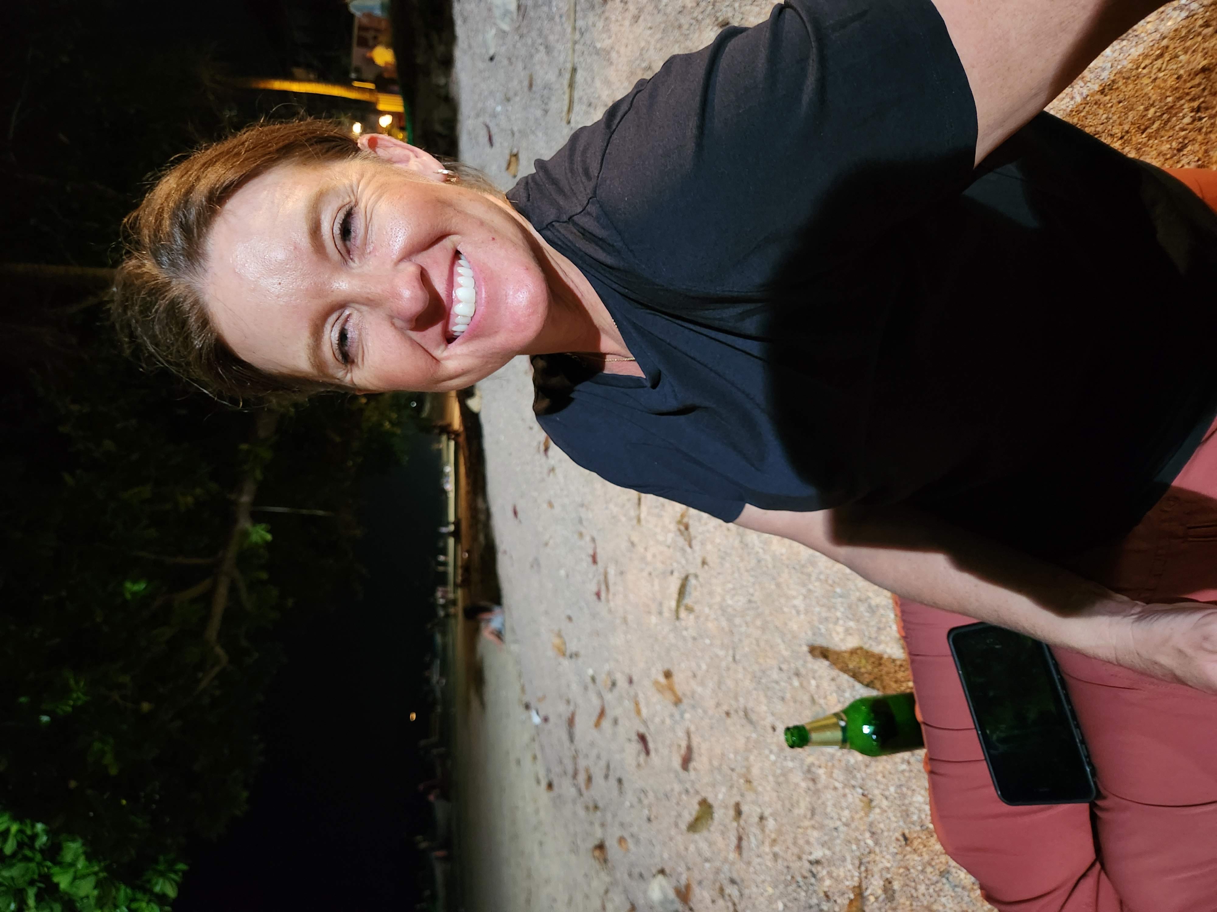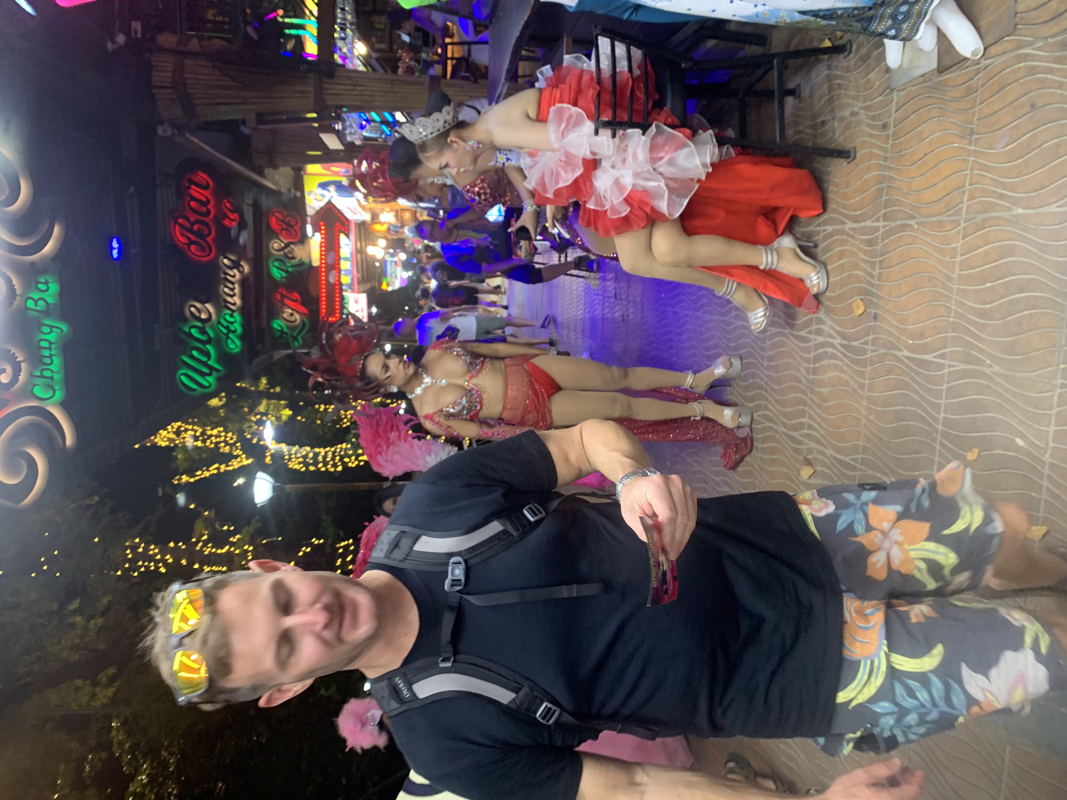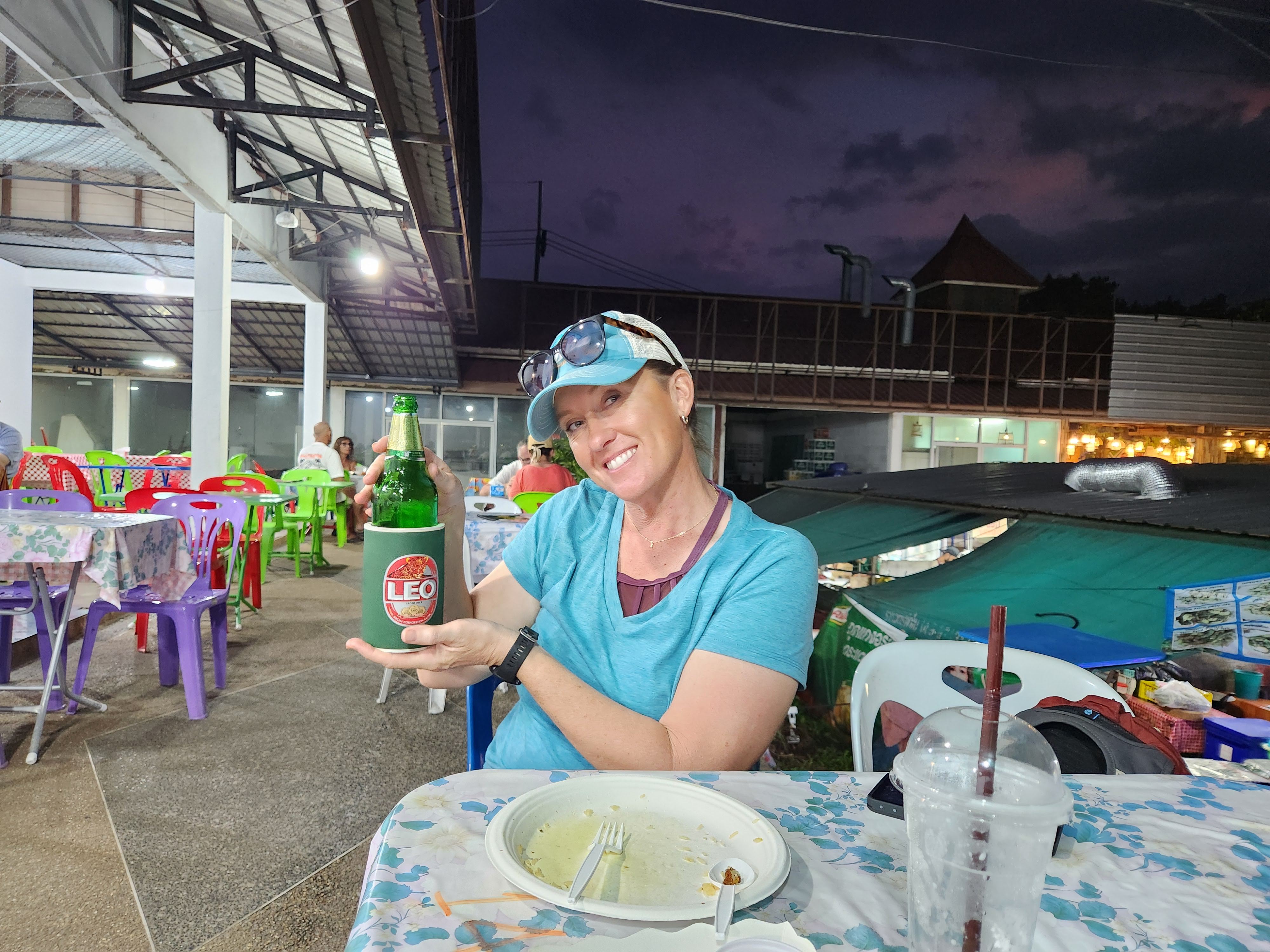 We headed back to our hotel for a shower before venturing back into town for dinner at a spot near the beach. (We walked so much this day- it was our record for most steps taken during the whole trip at almost 25,000!) On our way to the restaurant we booked a catamaran trip for the next day at a kiosk in town. We then enjoyed a sit-down dinner and after, picked up some cold Chang beers3 to sip while sitting on the beach while we were waiting for the fire show that was hosted by a local beach club to start. While waiting we actually saw that another fire show was happening further down the beach so we strolled down to watch and were suitably impressed. When that one finished we headed back up the beach and we got front row seats on the lawn and were thankful that we had, because what a show it was! These guys were unbelievable and took their fire show to the next level compared to the warmup act that we had watched a few minutes before. I even got to hold one of the props while one of the performers held the other end of the spinning ring of fire. When it ended we made the 1.5 km trek back uphill to our hotel, exhausted from all the walking but also from all the fun that we’d had exploring Ao Nang and Railay.