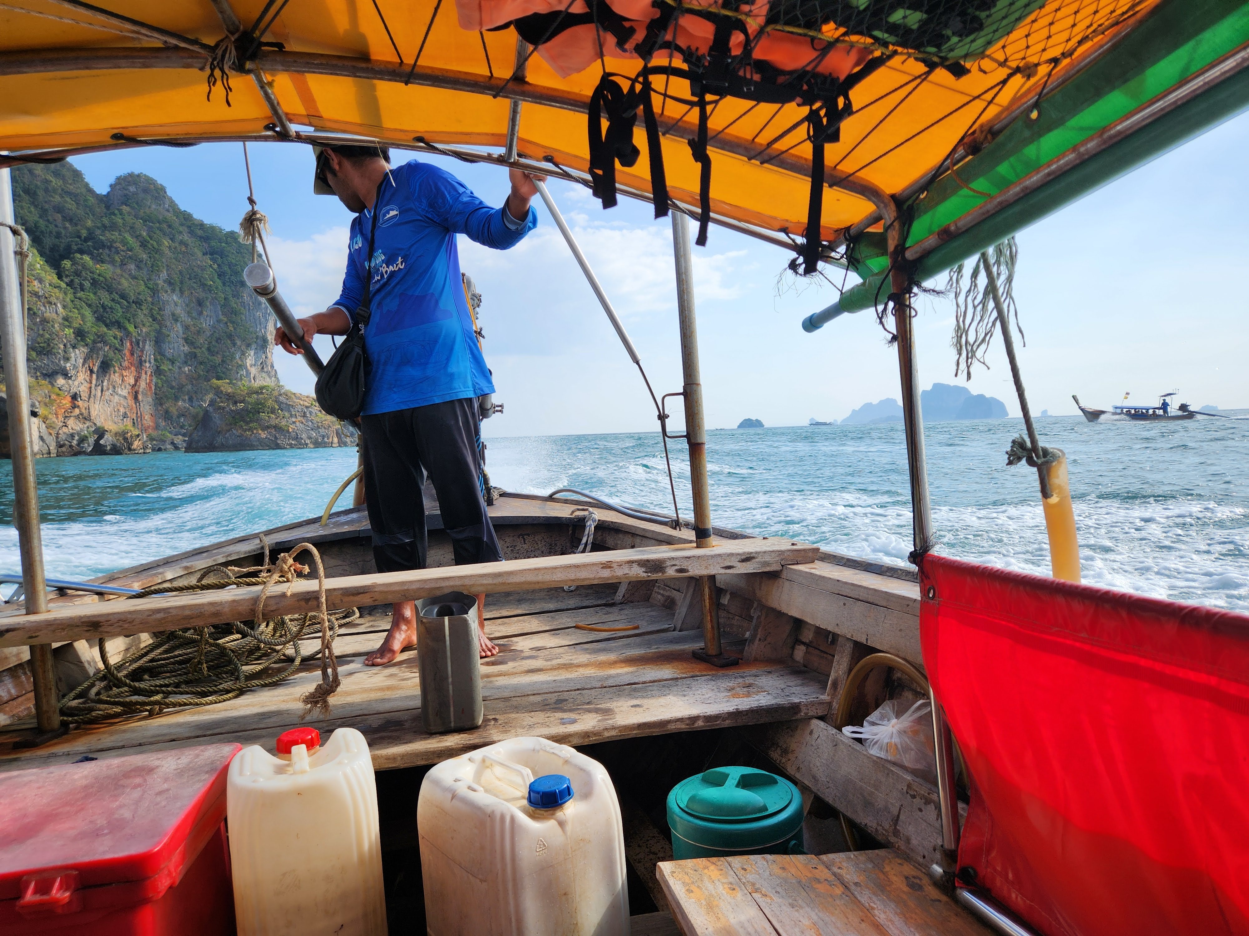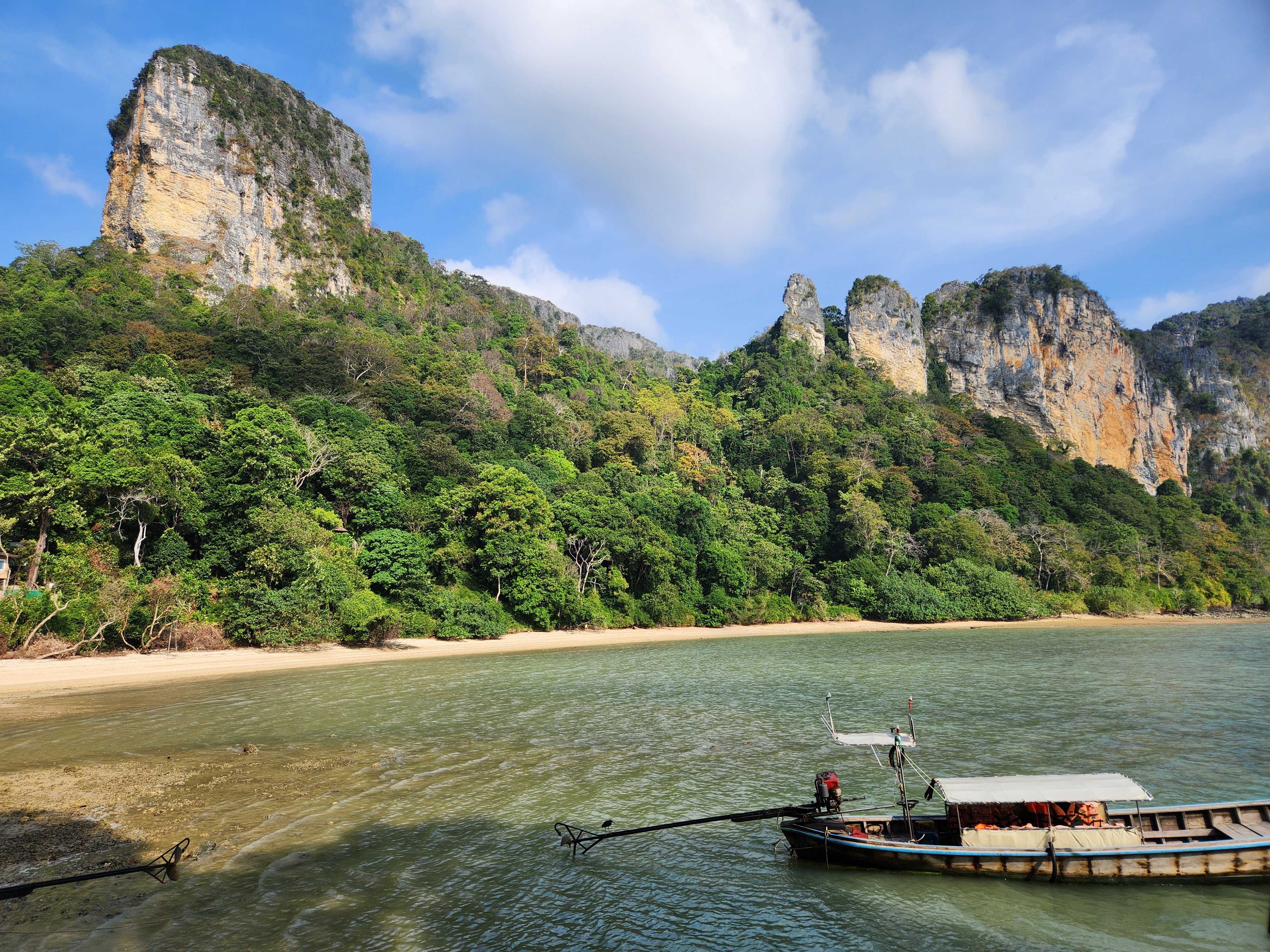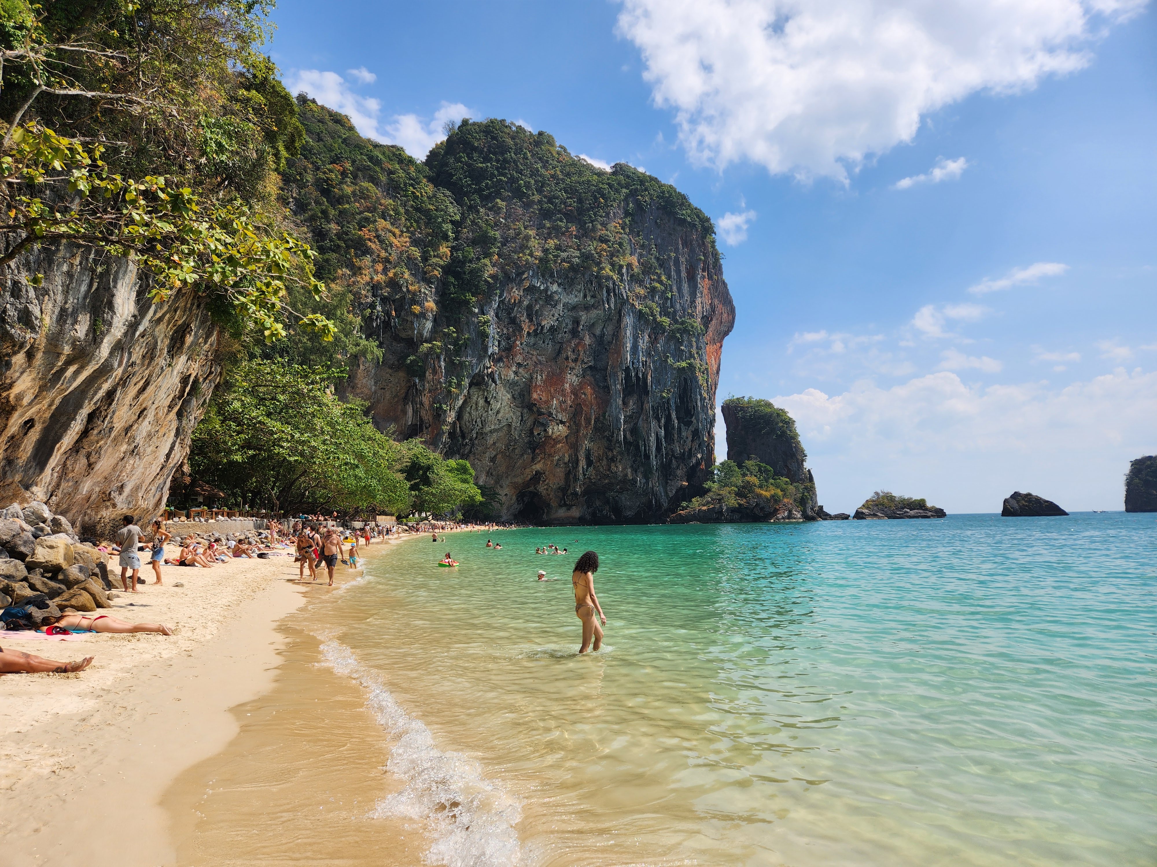 The beach was absolutely packed which made for interesting people watching and the longtail boat traffic was wild. There was a steady stream of them constantly coming and going, and while we had learned from YouTube travel videos that they were prolific in their numbers and in their racket, we didn’t get a true sense of it until we saw it in person. They would pull up onto the beach and throw their anchors at the water’s edge, deposit some passengers who then waded to shore, wait a few minutes, then load their next haul of passengers and take off across the horizon to some other place- most likely Railay Beach which was close by.