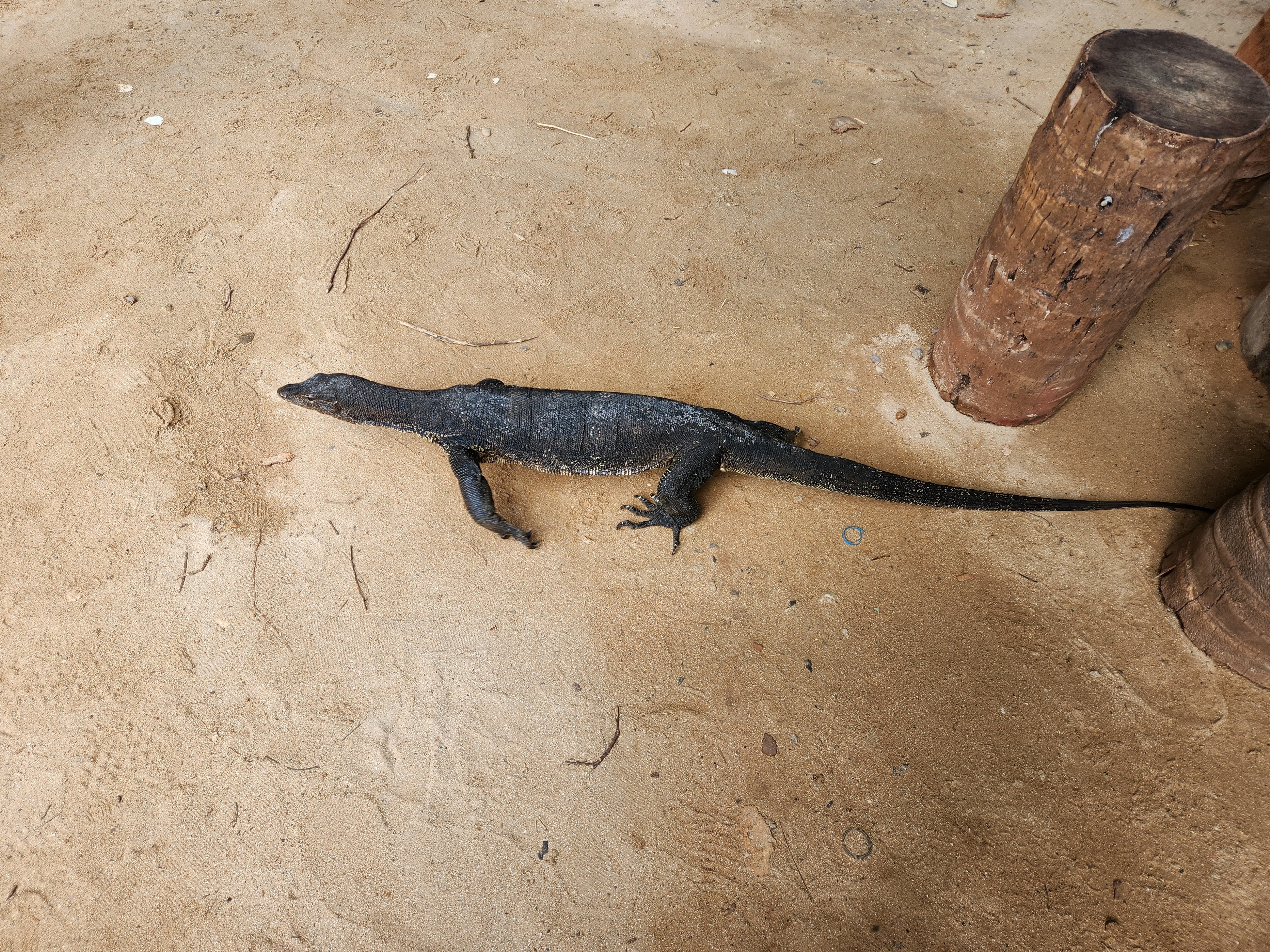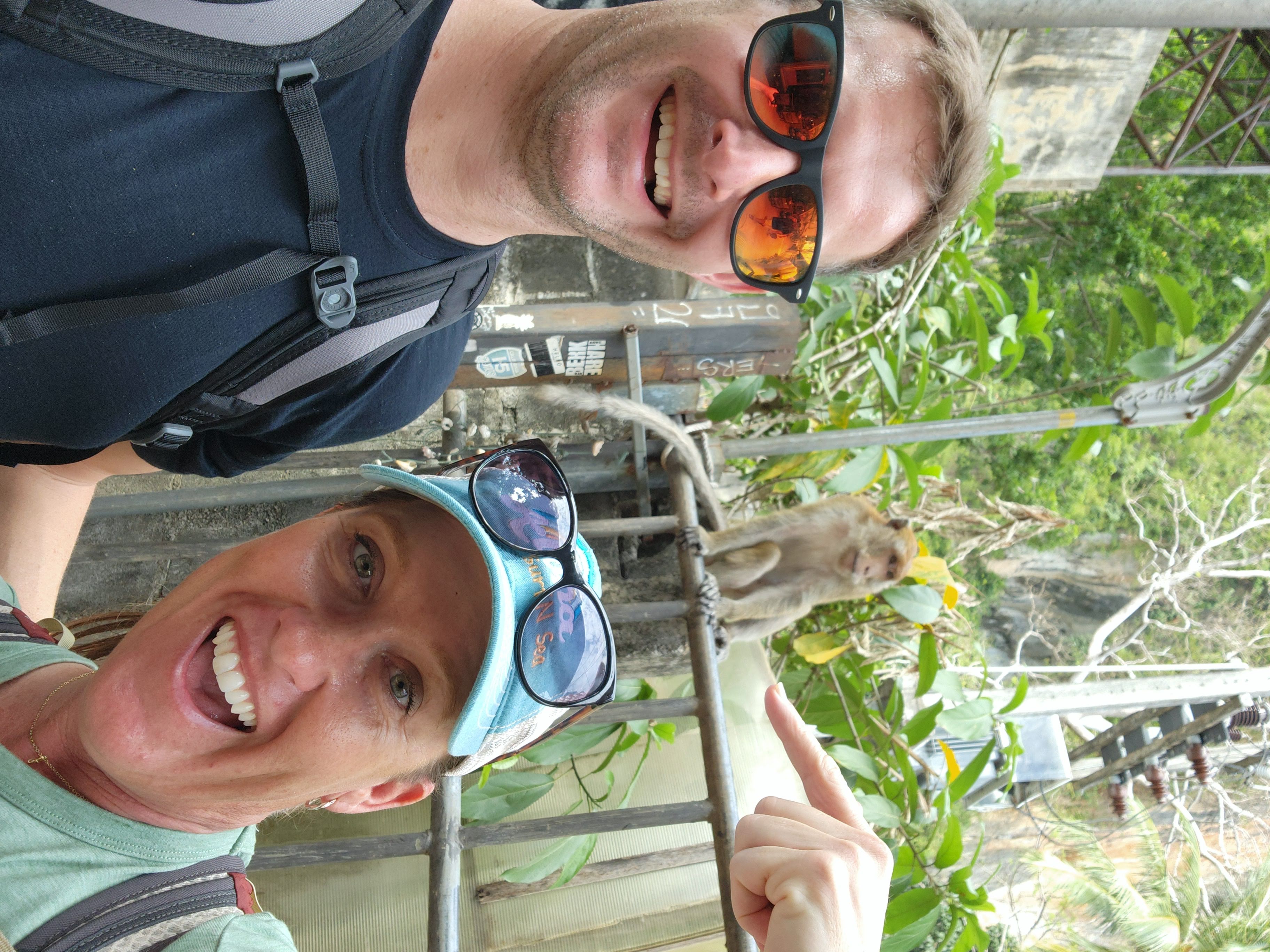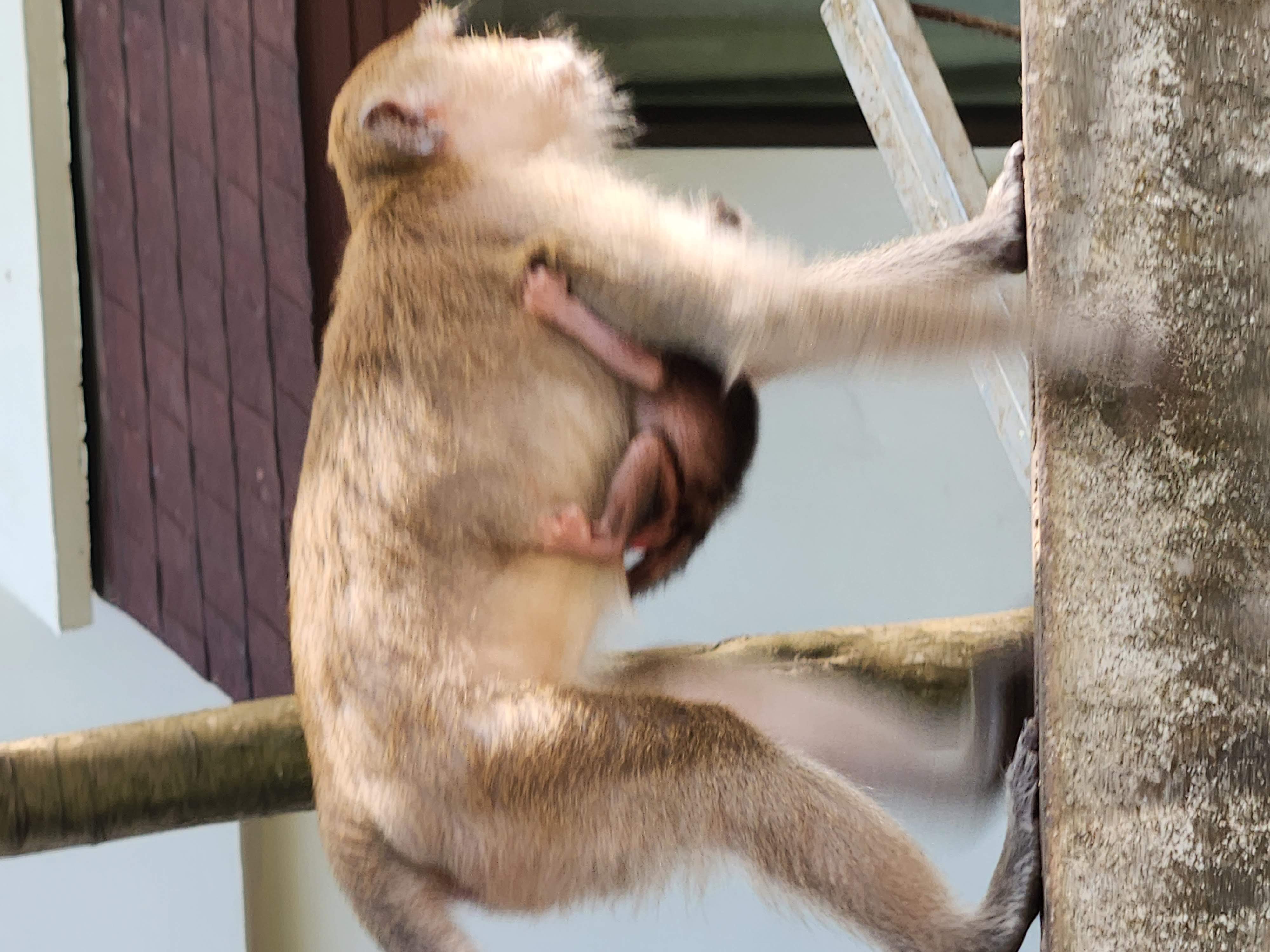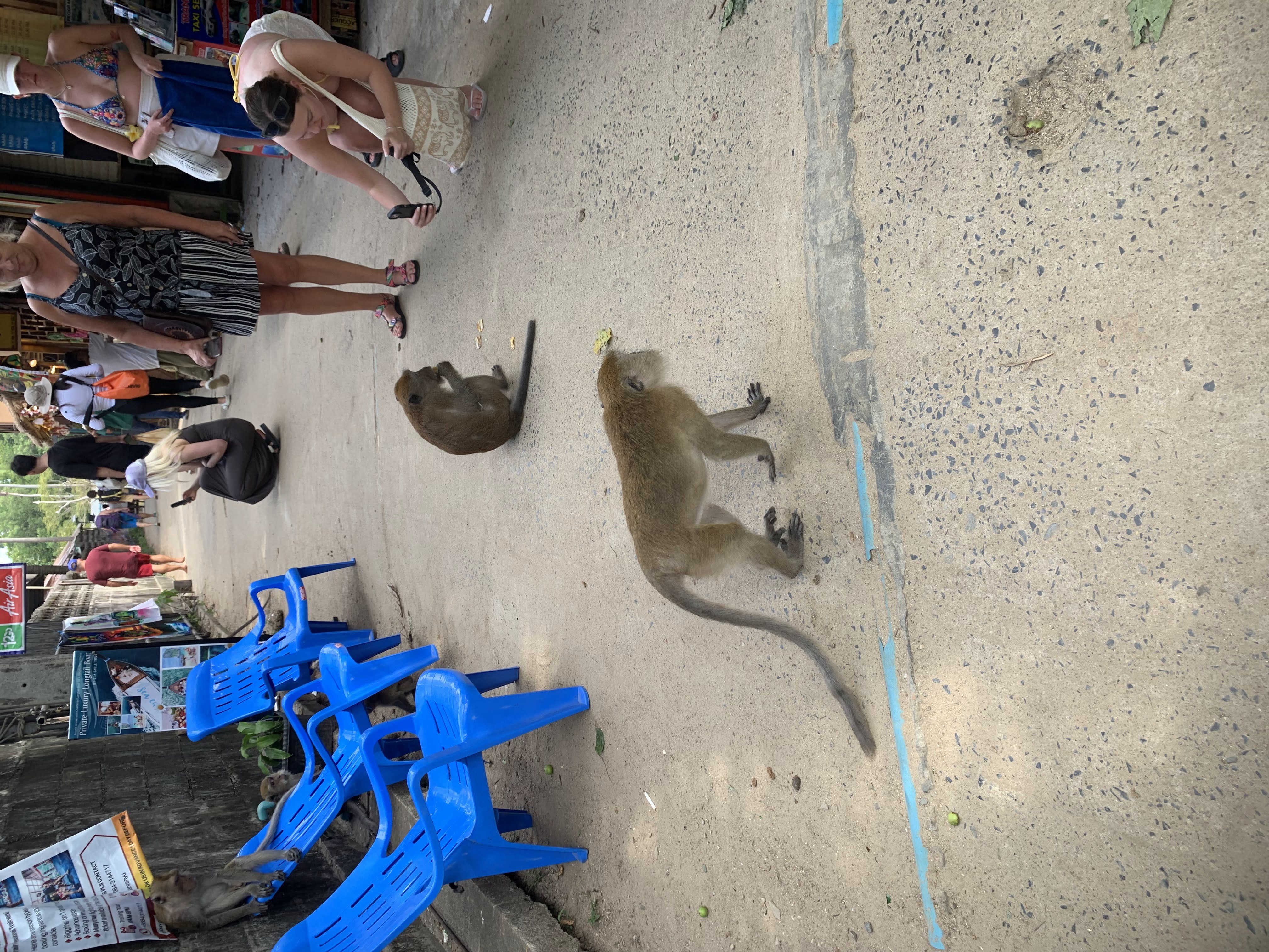 We retraced our steps and eventually reached an intersection near a floating dock and another spot where longtail boats and some other larger boats were dropping passengers off. We saw several areas where rock climbing lessons were taking place and while watching that, had our first monitor lizard and monkey spotting! The macaque monkeys would jump out of trees and land with a huge “thud” on the rooftop of the bathroom, before scrambling into the overhanging trees and climbing up the mountain. (Being inside the bathroom building while they were doing this was rather interesting and quite loud!)