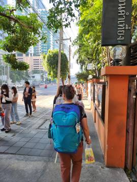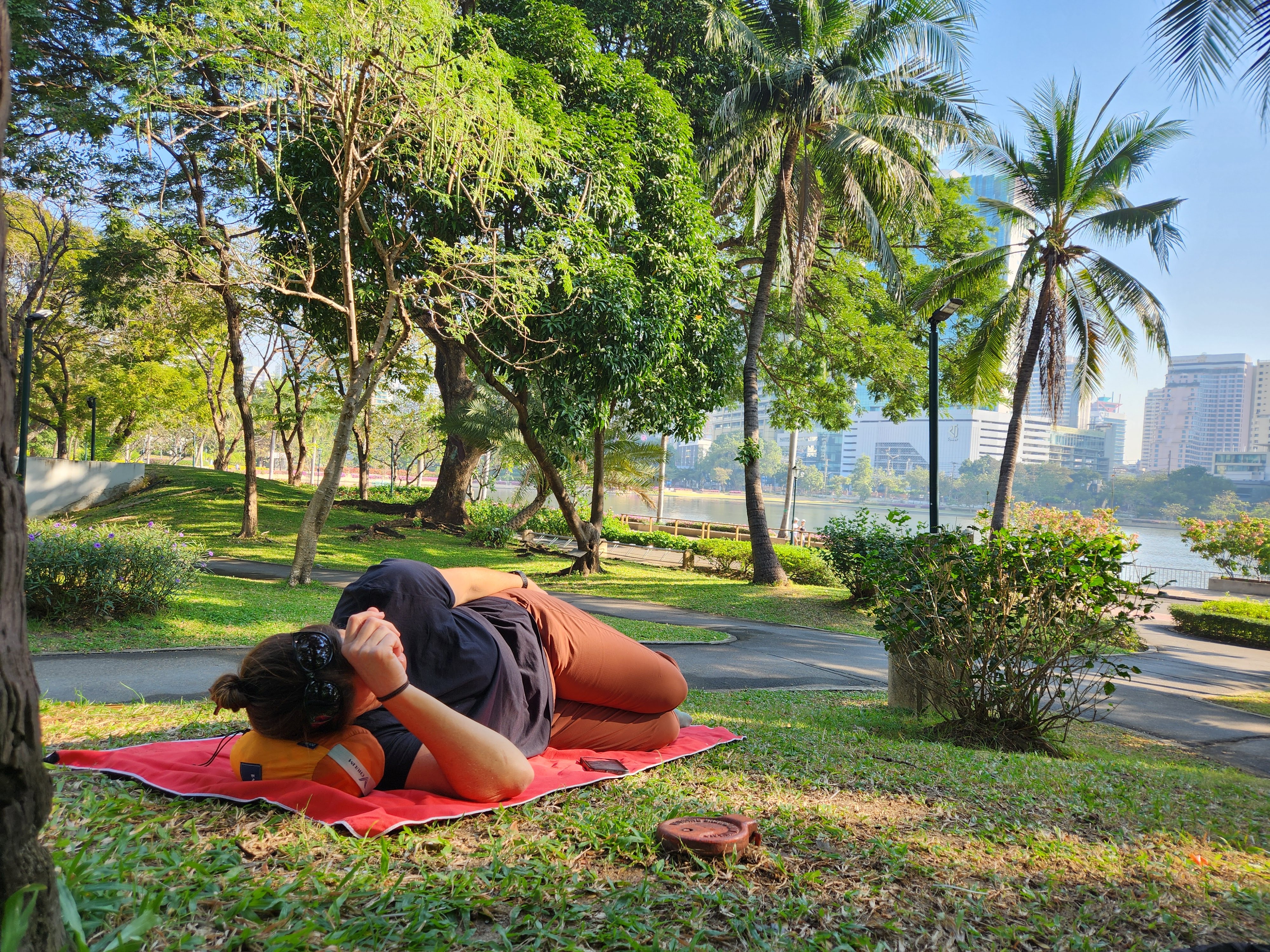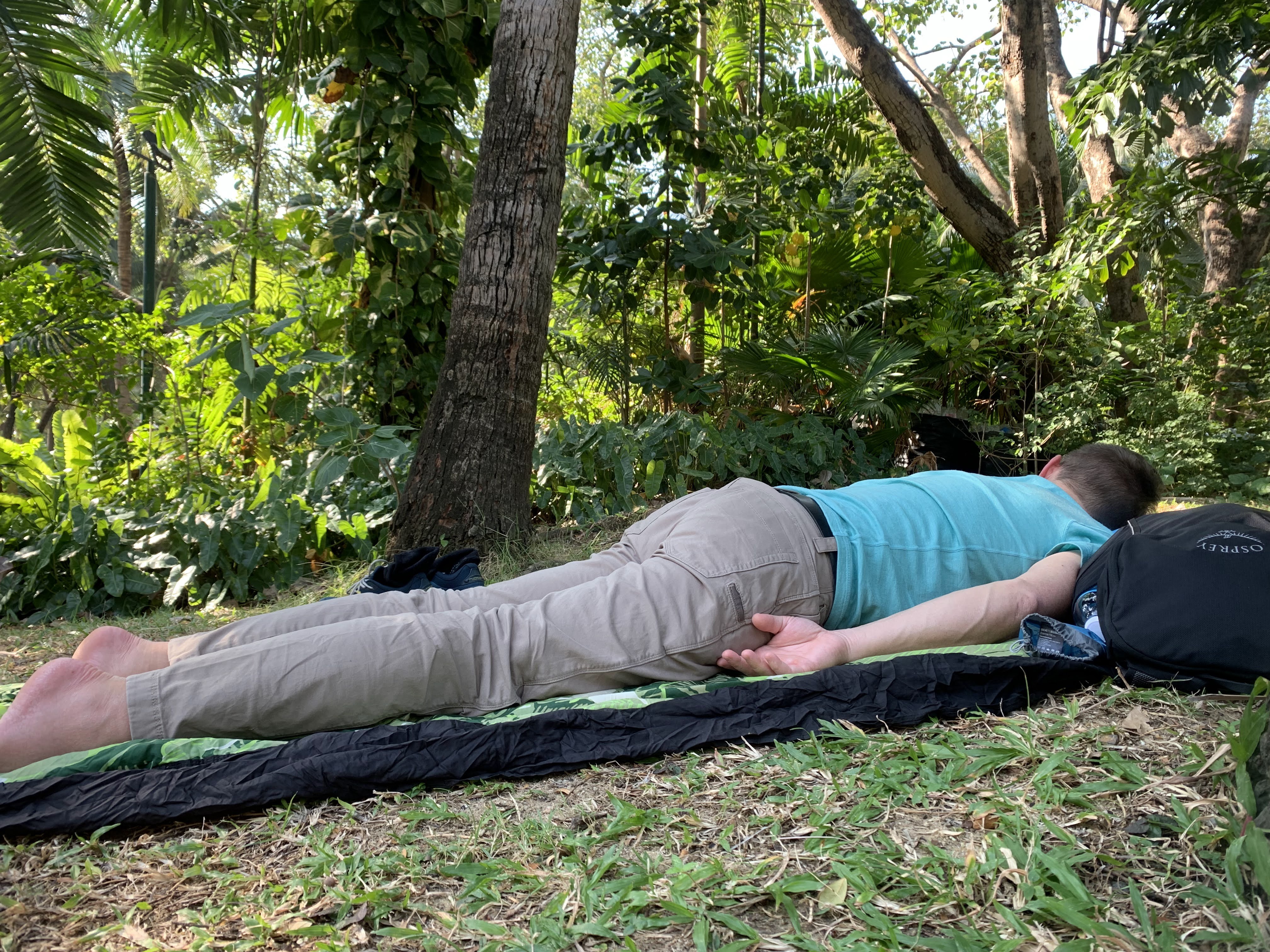 Bellies full we donned our backpacks and headed towards Benchakitti Park to kill time before we could check into our hotel. It is a beautiful green space amidst the urban madness of Bangkok. Along the way we passed the infamous Soi Cowboy. Scott had hoped to hang our hammocks in the park so we could take a much needed siesta but he was quickly shot down (verbally, not literally) by the park guard who barked a stern “NO!” in his direction as he unfurled the hammock and started stringing it up between two trees. Hammocking denied, we opted to just lay in a shady spot on the grass and rest.