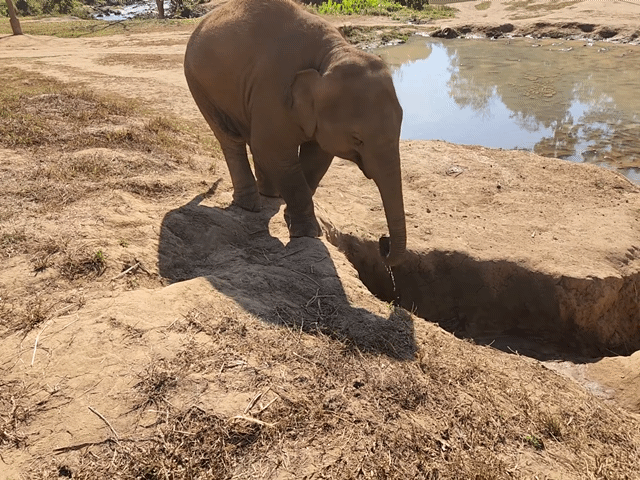 Scott happened to be near the baby elephant when she decided she was thirsty. He was able to get a video of her going over to the running water that was coming out of an irrigation pipe, take long draws of it through her trunk and then transfer it to her mouth to swallow.