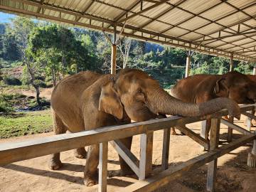 Today was Elephant Jungle Sanctuary day! A minibus from the sanctuary picked us up bright and early from our hotel and we piled into it, introducing ourselves as we climbed over people and made our way to the empty seats in the back. There were people from several different countries1 already on the bus and we were all headed about an hour and a half southwest of Chiang Mai to the sanctuary. The bus stopped about halfway along the route for everyone to have a 7-11 and toilet break before continuing on.
