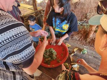 The leaders then told us to head back up to the pavilion so that we could do the next activity. We then gathered round a table and were shown how to make vitamin and mineral enriched elephant treats to supplement their diet. We took turns mashing up the pellets, tamarind beans, and bananas with a huge wooden mortar and pestle, balling up the resulting mash, and then wrapping the mash balls with banana peels. We were then sent to change into our bathing suits.