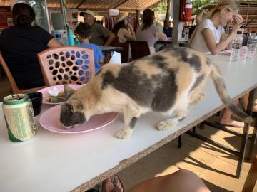 The last phase of the experience was lunch and we were treated to a spread of traditional Thai dishes- massaman curry being one of them, that Scott actually liked. (He typically doesn’t like any sort of curries but during our time in Thailand he started to come around to them.) We sat around and talked to some of the other participants and I made friends with the sanctuary’s resident cat who helpfully cleaned my plate for me when I had finished. After lunch we were escorted back into our minibus, although this time with a different driver. Our driver was out to give us an authentic experience and drove like any good professional Thai driver worth his salt would- with aggressive use of the horn, taking wild chances to pass in curves and double yellows, and tailgating anyone in front of him who dared to be attempting to share the road with us. Thankfully I had packed some Tums5 and munched on them furiously and continuously throughout the whole ride back to our hotel.