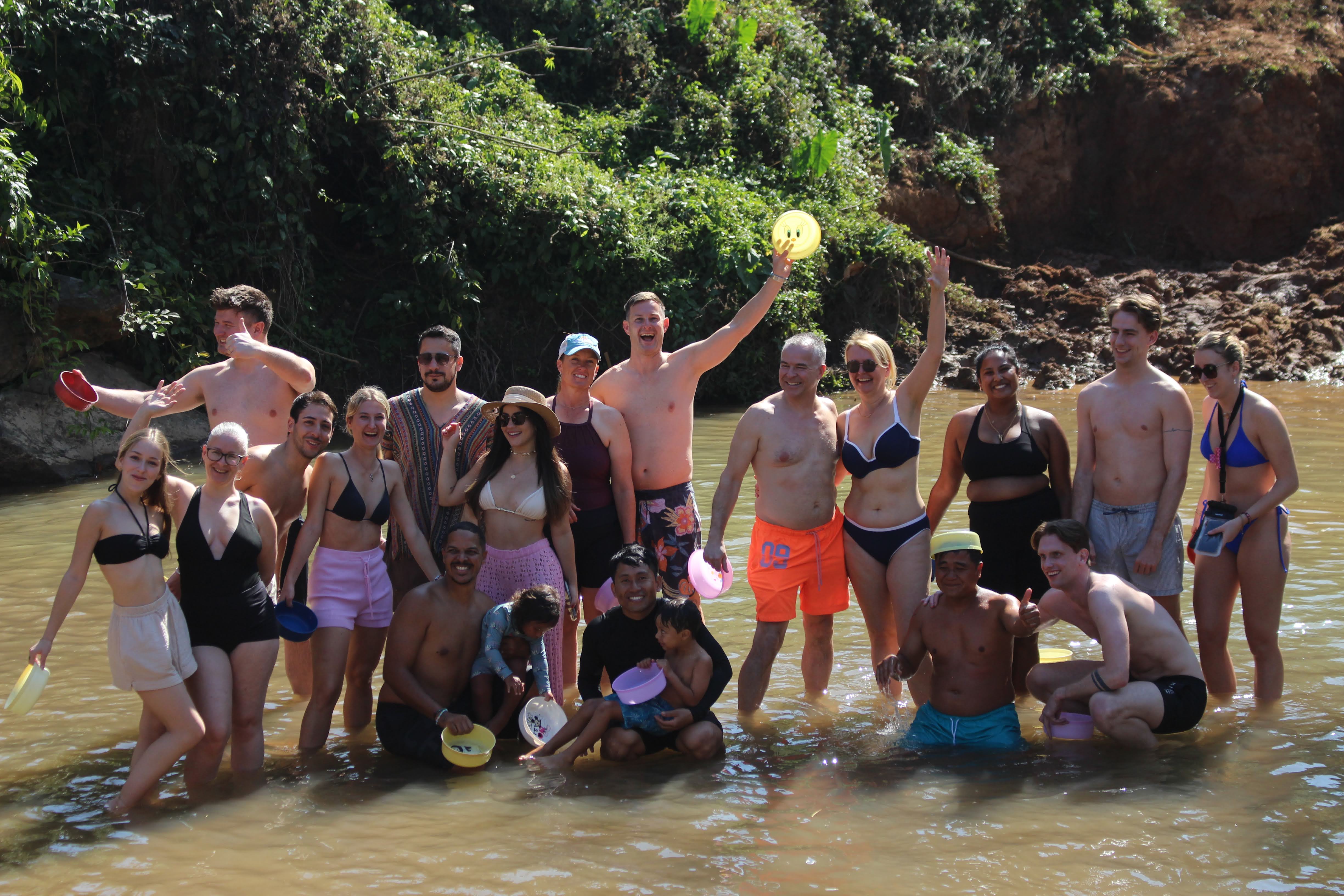 As soon as the treat balls were gone the elephants marched down to the river with the mahouts and with us trailing along. We were given bowls to splash the elephants and were told to be careful if they laid down in the river, not to get entangled with their legs, or else we would get squished when they went to stand up. Some got into the river and immediately dropped down to wet their bodies and others stayed standing. Water was flying everywhere as the group went about the business of dousing the elephants. When they were thoroughly wet, a group picture and water fight (with just humans) ensued as the mahouts guided the herd out of the river and up to the giant mud puddle for their mud bath.