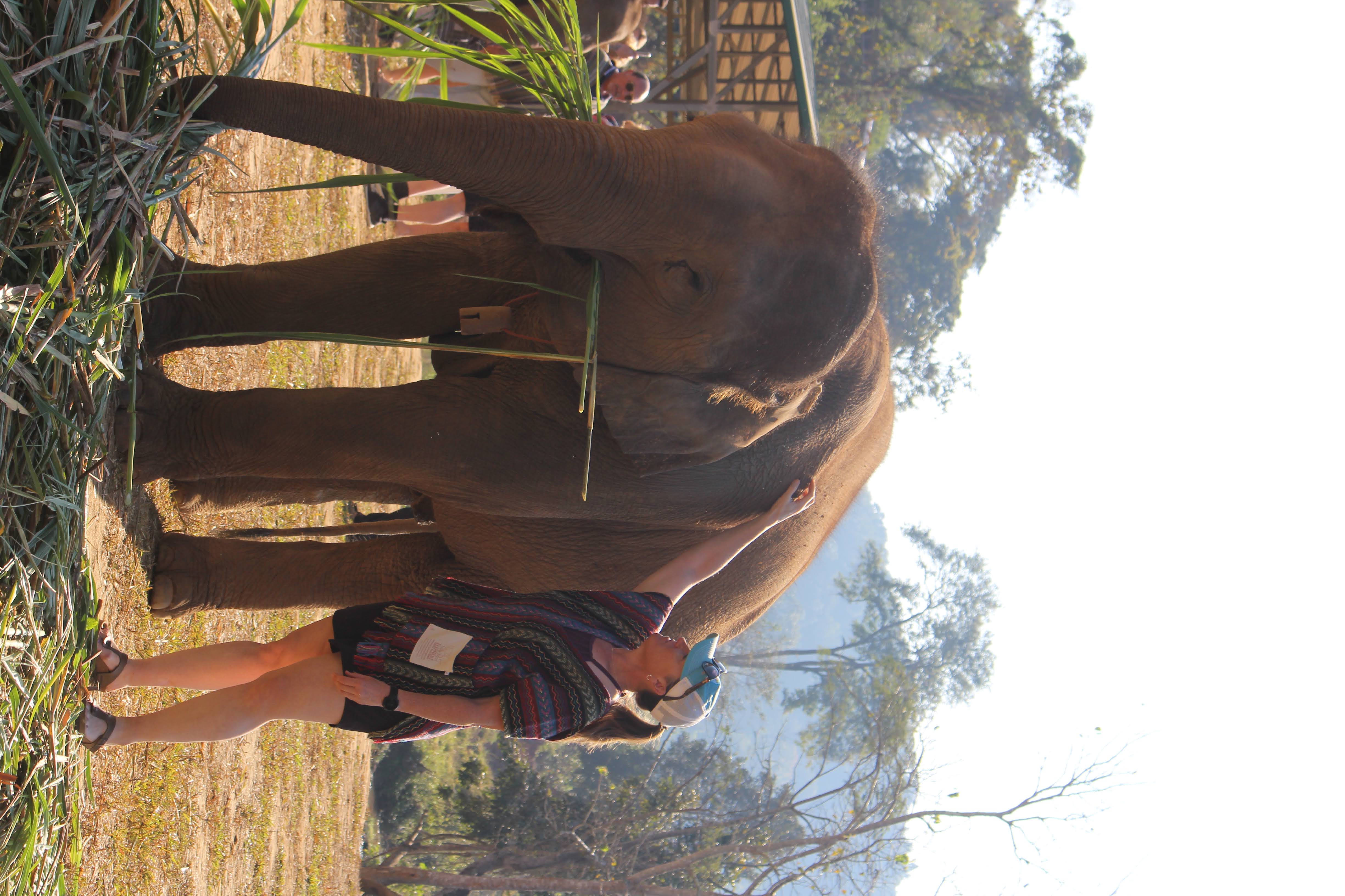 When we finally arrived at the Elephant Jungle Sanctuary facility in Mae Wang, we were instructed to make our way to the pavilion and to put on “traditional Karen wear.” Karen wear turned out to be colorful woven tunics named after the Karen tribes of the area, and they would protect us from getting muddy2 while we first fed and interacted with the elephants. We donned the tunics and then admired the herd of elephants from afar before sitting down to receive our briefing. We were given a brief informative session about Asian elephants- diet, habitat, anatomy, how they differ from African elephants, gestation, life expectancy, etc., that I of course ate up and did some follow up reading on later. The next part of the briefing focused on how to stay safe in our interactions with them. Finally it was time to make our way into their grassy pasture to feed and meet them!