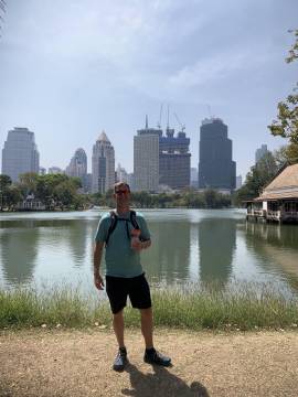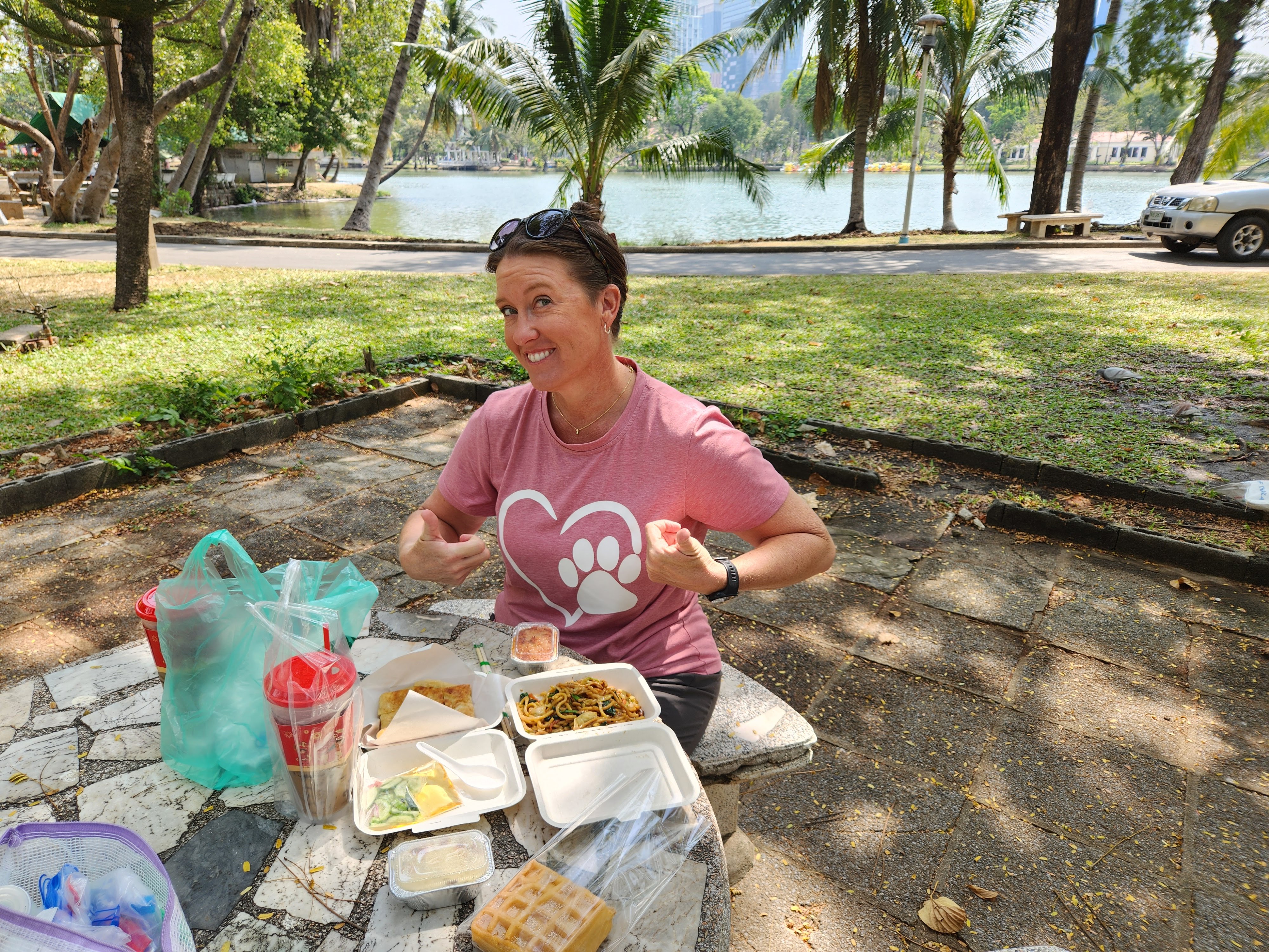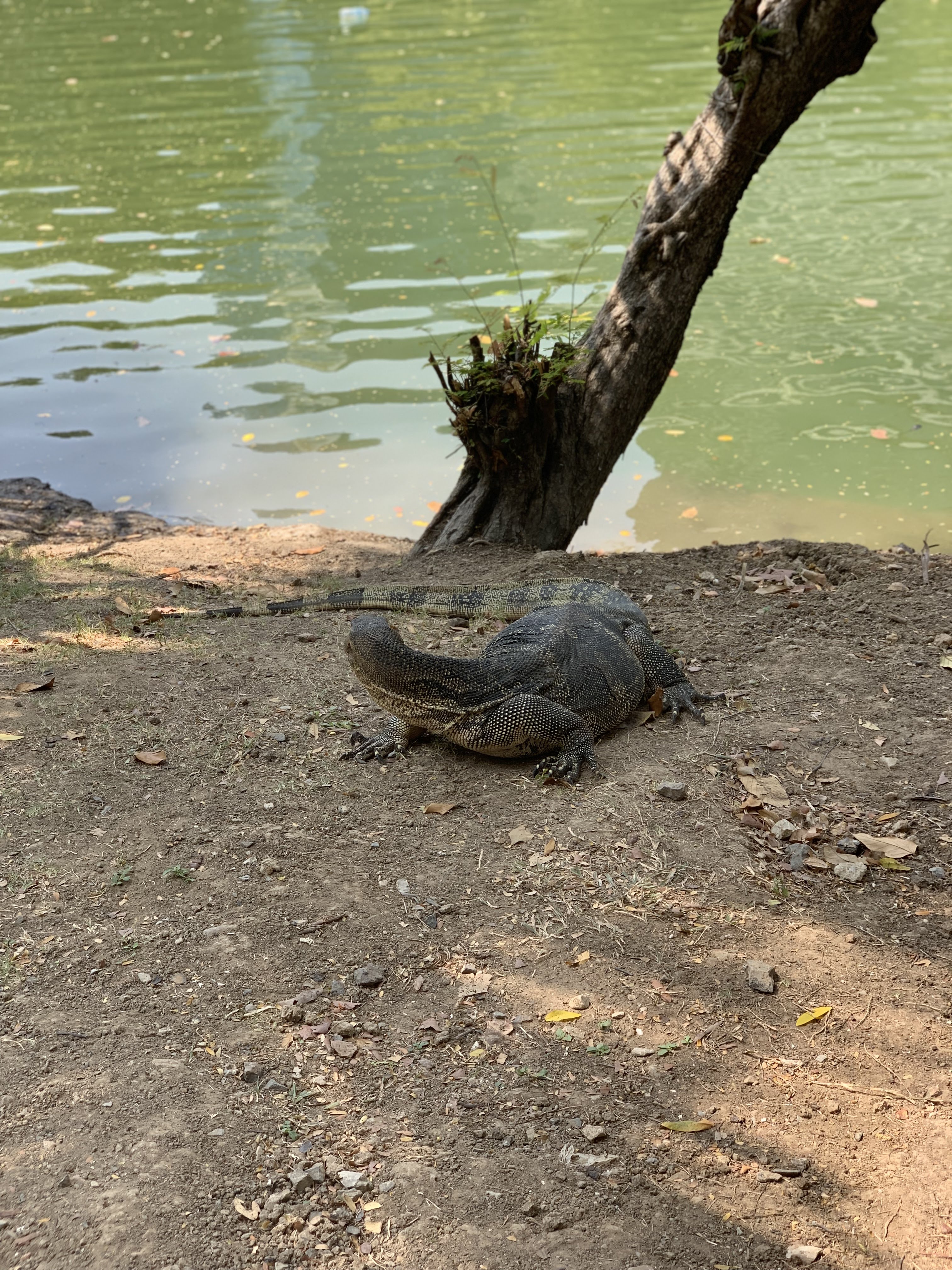 He got out of the tub rejuvenated and we decided to go to Lumphini Park for a picnic and to hopefully be able to see some of the “lumphini lizards” that it is home to. Lumphini lizards are actually Asian water monitors and are close relatives of the Komodo dragon. We had seen them referenced in a lot of the YouTube videos about Bangkok that we had watched during our trip planning and were eager to see them in person; the idea of alligator sized reptiles roaming casually around a city park piqued our interest.