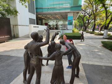 Our walk to the park took us through the beautiful Chulalongkorn University campus, or Chula University as it is more commonly known. The largest university in Thailand, its campus reminded us of a stateside school with its tree lined walkways, carefully tended gardens and lots of student activity. It hosts a medical school and we are hypothesizing that it’s because of this that the on campus outdoor food market that we visited gave the most nods to food handling safety that we had witnessed to date in Thailand. There might not have been any plastic gloves or hand washing going on but the vendors had erected a very crude sneeze-guard with saran wrap so there is that. Since this was our last day in Thailand we went a little crazy on buying Thai foods to try and got a little bit of this and a little bit of that from several stalls (all for just a few US dollars) to supply our picnic. I was hoping for some roti but unfortunately didn’t find any.