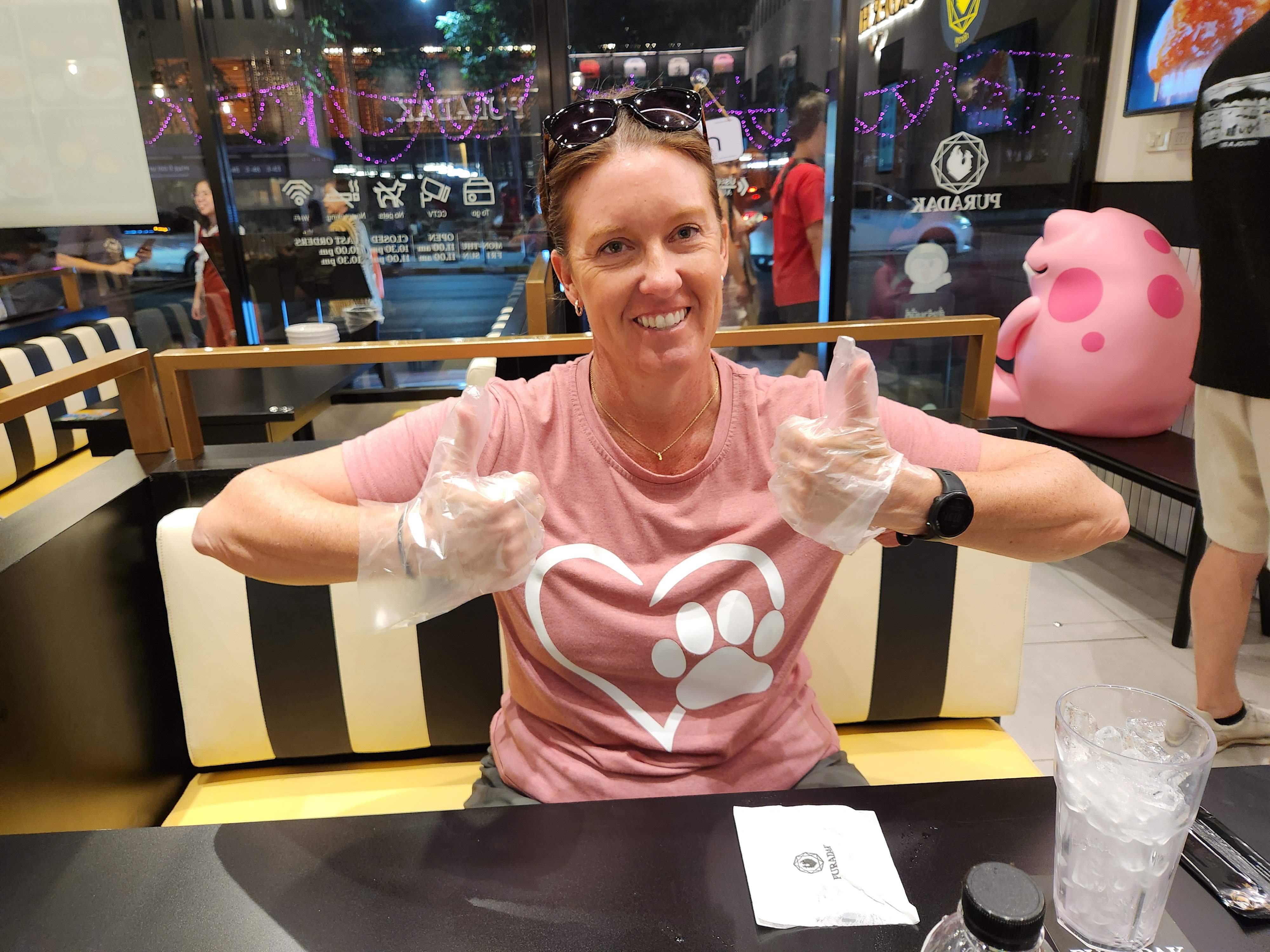 At this point I must have been whiny enough that Scott finally listened and agreed that we could leave the epicenter of the celebration. We headed back out of the chaos and towards our hotel with the intention of finding somewhere to eat dinner. (I had nixed his idea of having dinner in Chinatown- that would be like deciding to have dinner in Times Square at 11:45 pm on December 31st.) I was still holding out for roti, but sadly we never found any, and instead found a Korean chicken sit-down restaurant. They supplied plastic gloves for you to don to consume your fried chicken neatly and this pleased me greatly. Greasy chicken aside, Asia being the favorite spot for a good global pandemic to pop up and all that.