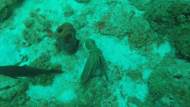 While I was teaching the morning sessions he went on his last dive at the Fredriksted cruise pier and it turned out to be his best and favorite one of the week. He was out for a little over an hour and came across a puffer fish and a little sea turtle that was perched atop some coral on one of the pier piles sleeping. His most exciting discovery of the dive was a trio of octopuses and he was able to watch them for a few moments, fascinated by their ability to change their color on demand to correspond with their surroundings as they glided around the seafloor.