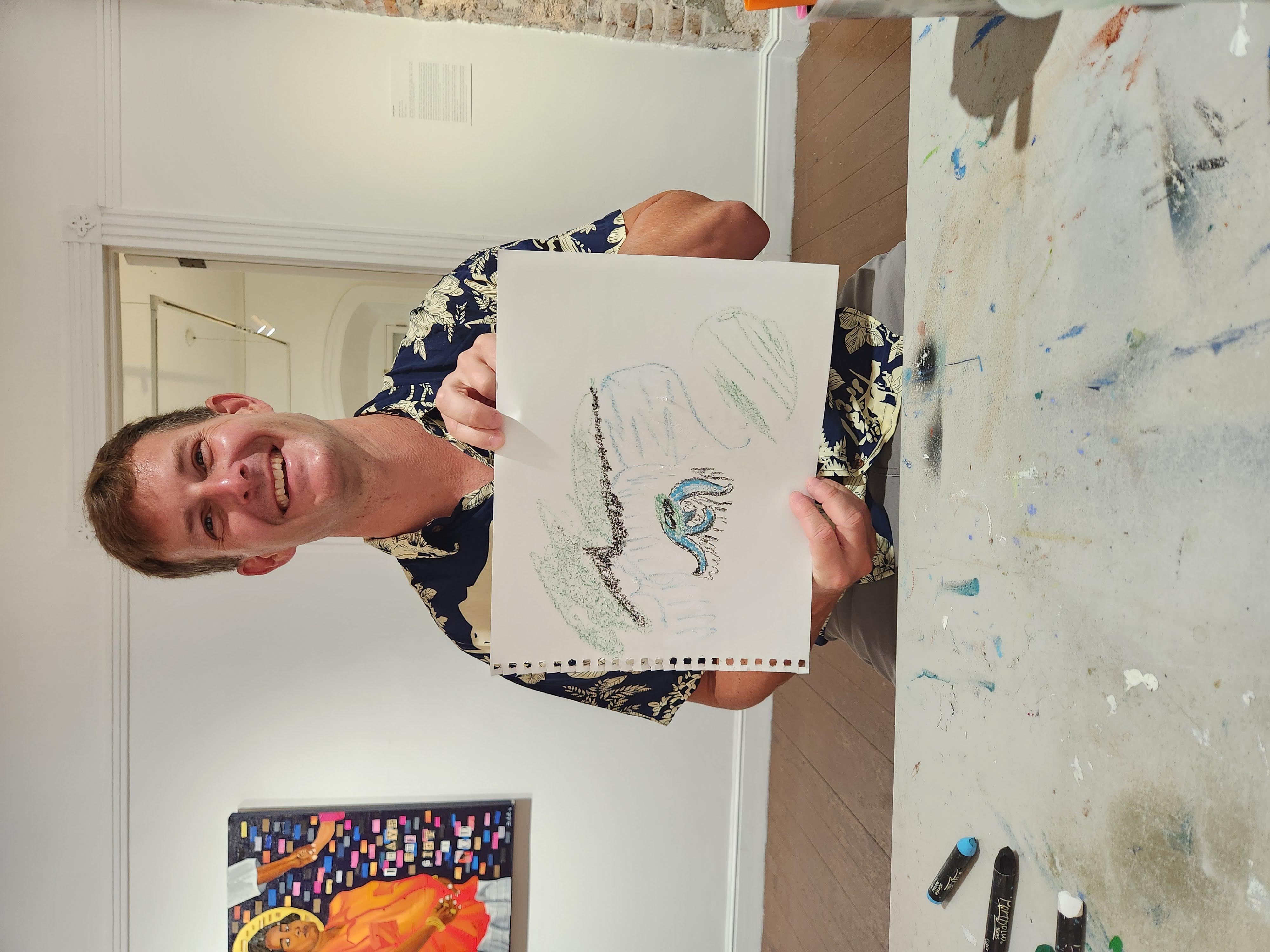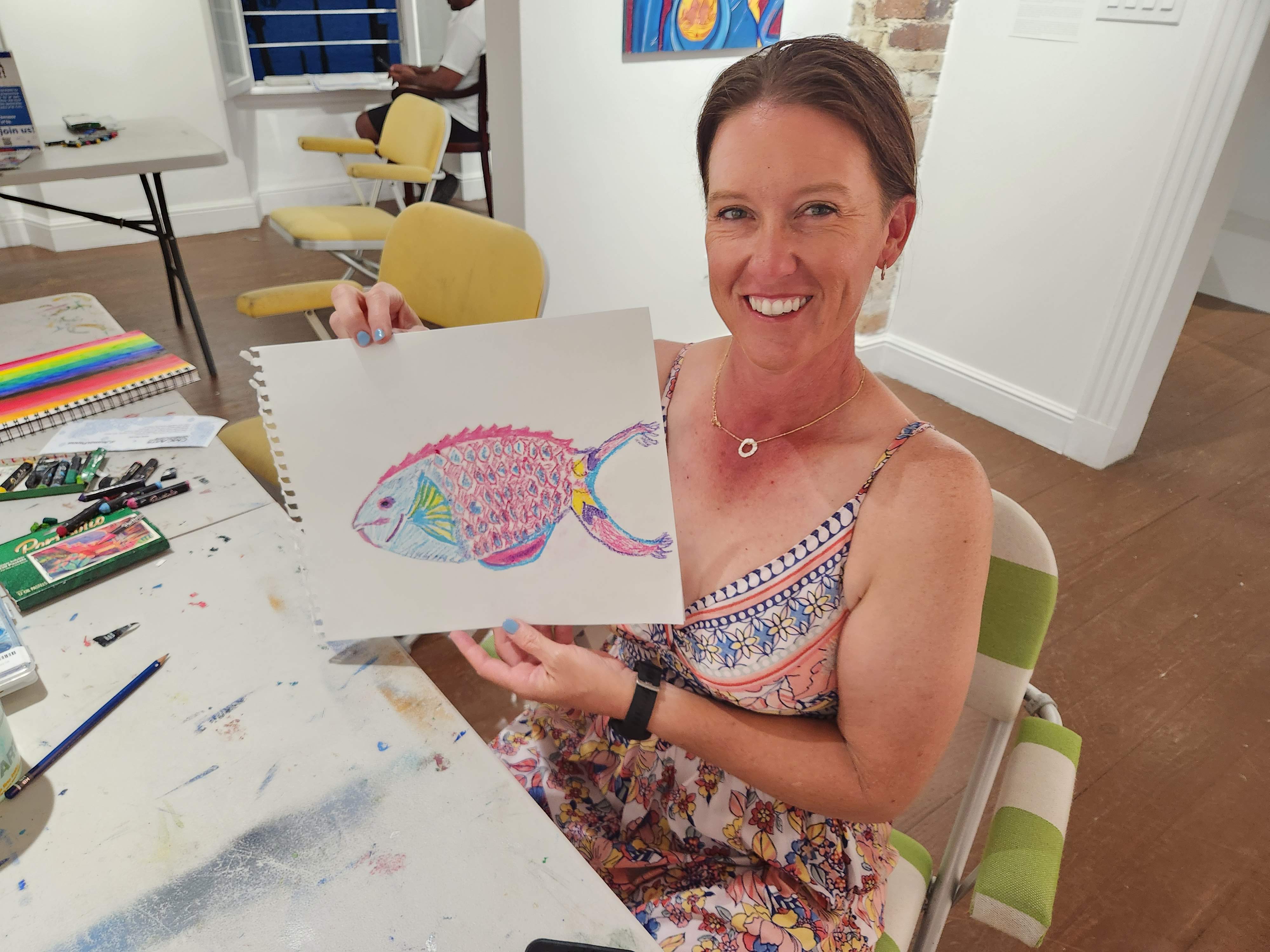 We went into the Caribbean Museum Center for the Arts, a gift shop/art gallery featuring works and pieces from local artists that I’d spied earlier in the week but never got a chance to visit since it had always been closed until this evening. Scott asked the clerk about the festival and she also told him about the “Free Flow” session they were hosting upstairs. Participants were invited to “unleash your inner CREATOR” and try their hand at art. She hadn’t even gotten the words out of her mouth before Scott was bolting up the stairs, leaving me in a cloud of dust. I trailed after him trying to see where he had gone and found him upstairs talking with the volunteer docent.